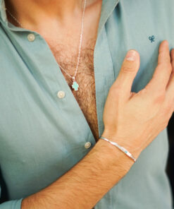 Collar en plata de ley con cadena tipo forzada y cruz gruesa de turquesa natural con reverso calado.