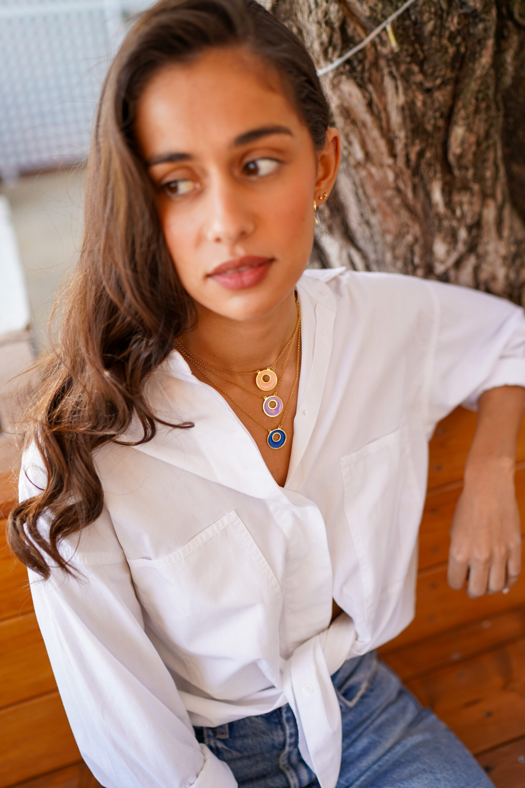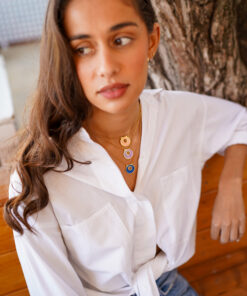 Collar en plata de ley chapado en oro con colgante en forma de circulo con esmalte color nude en el interior y una parte calada.