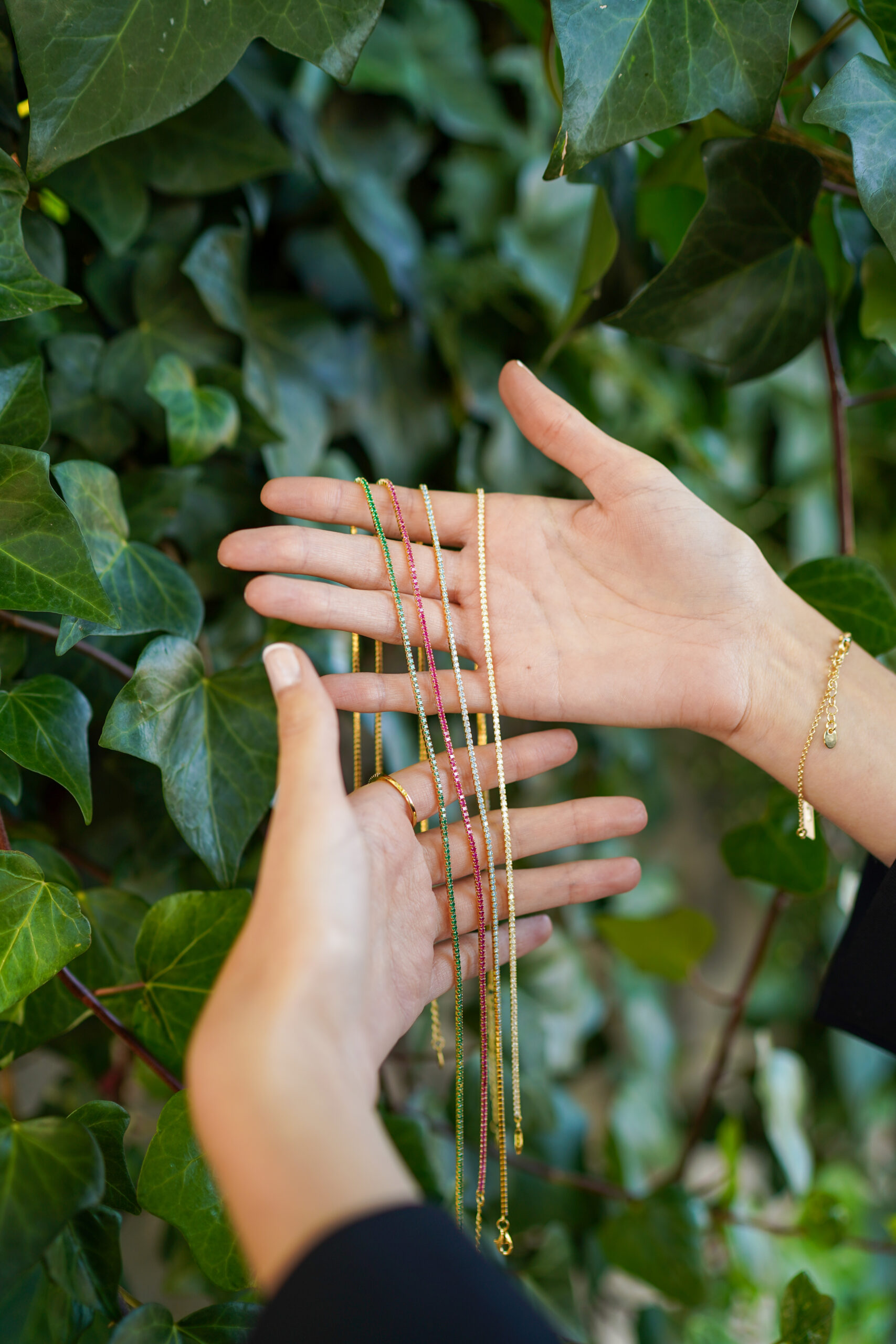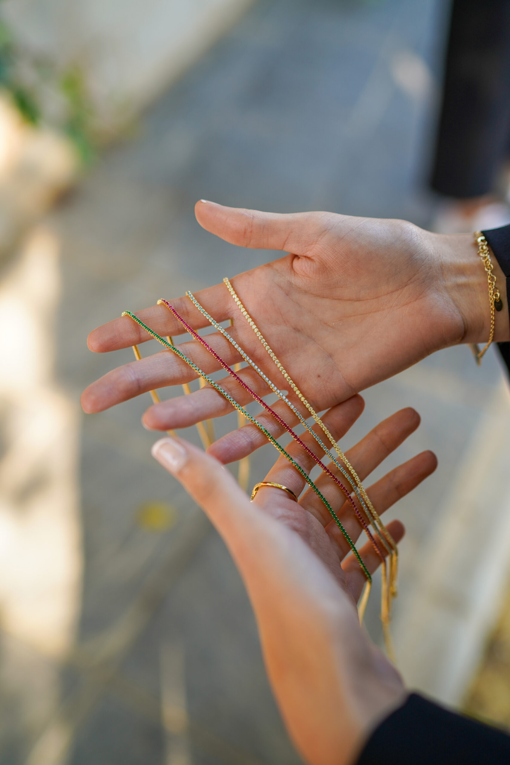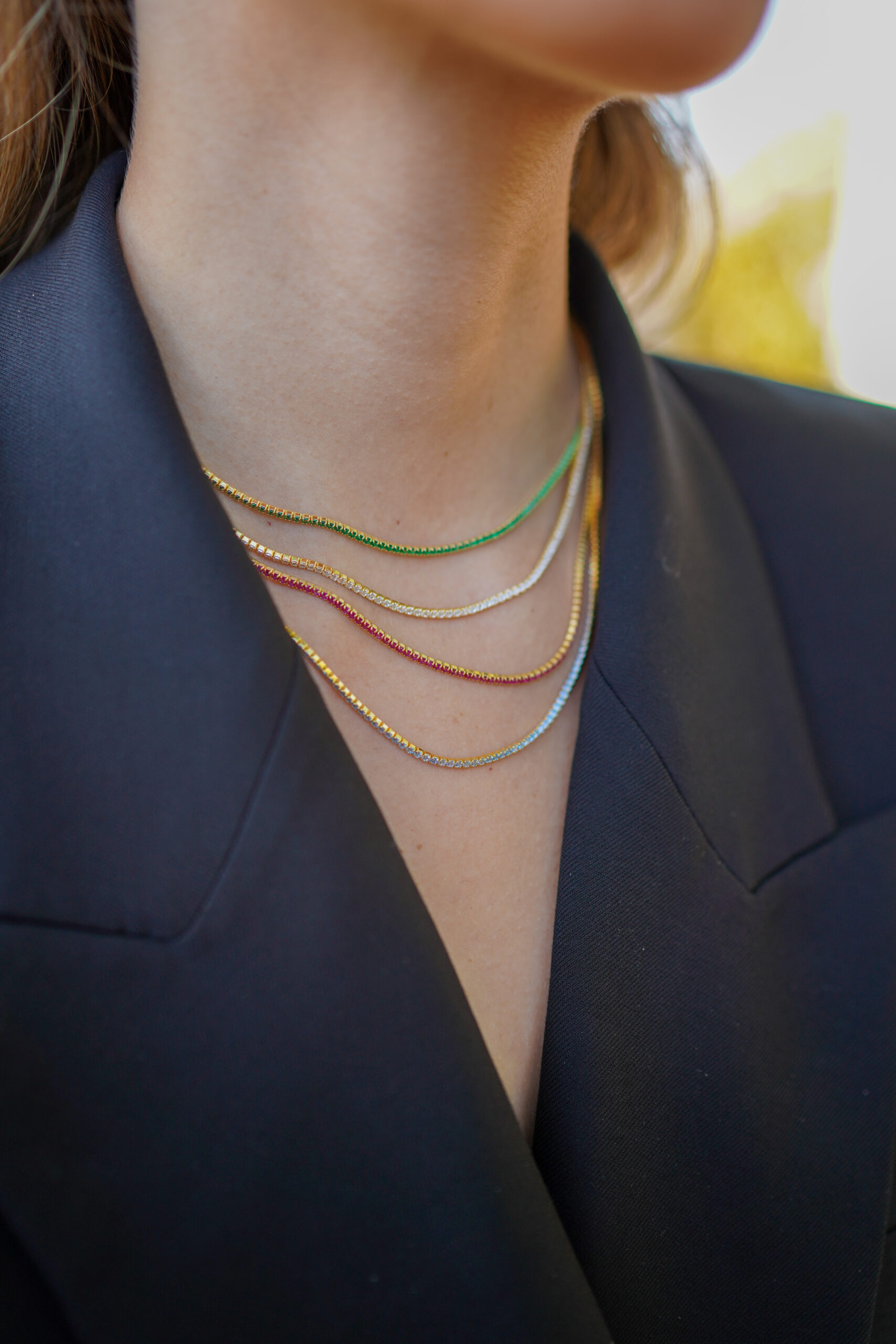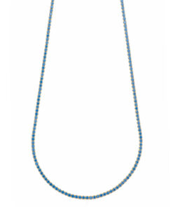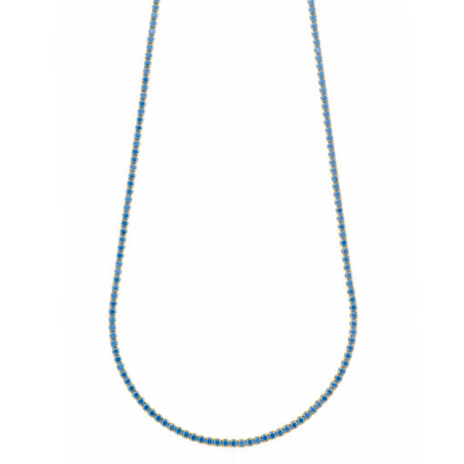 Collar en plata de ley chapado en oro formado en su totalidad por un riviere de circonitas color celeste.