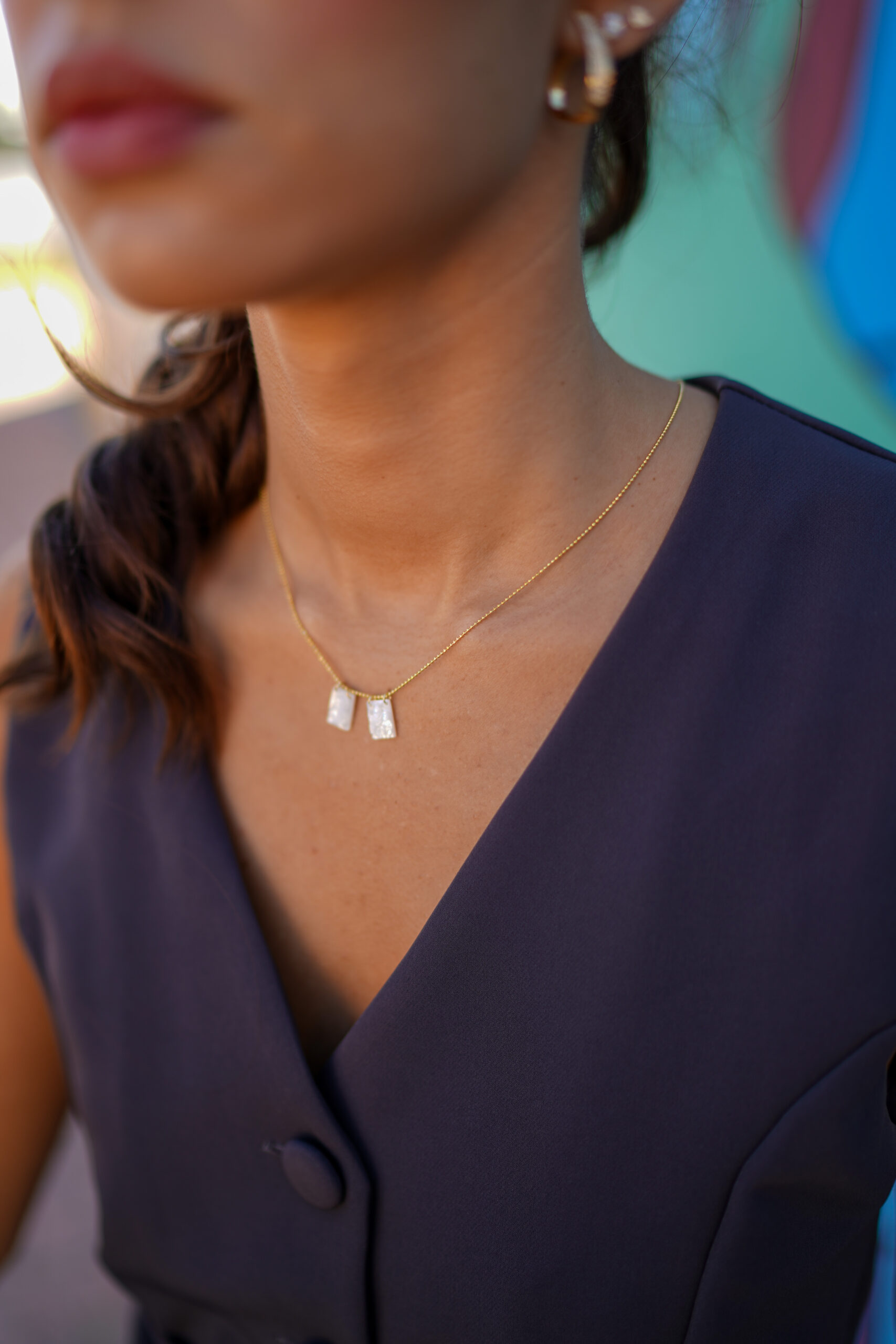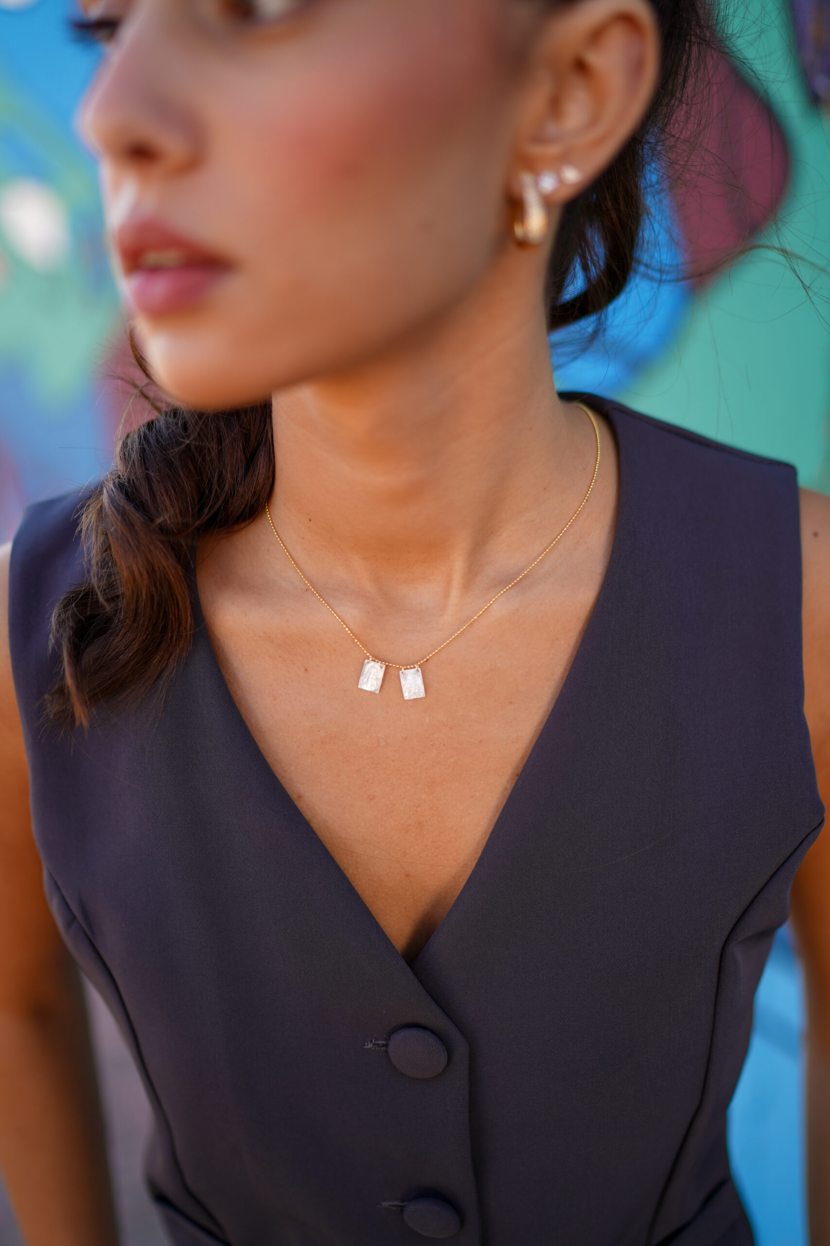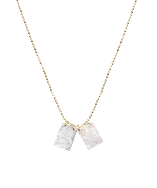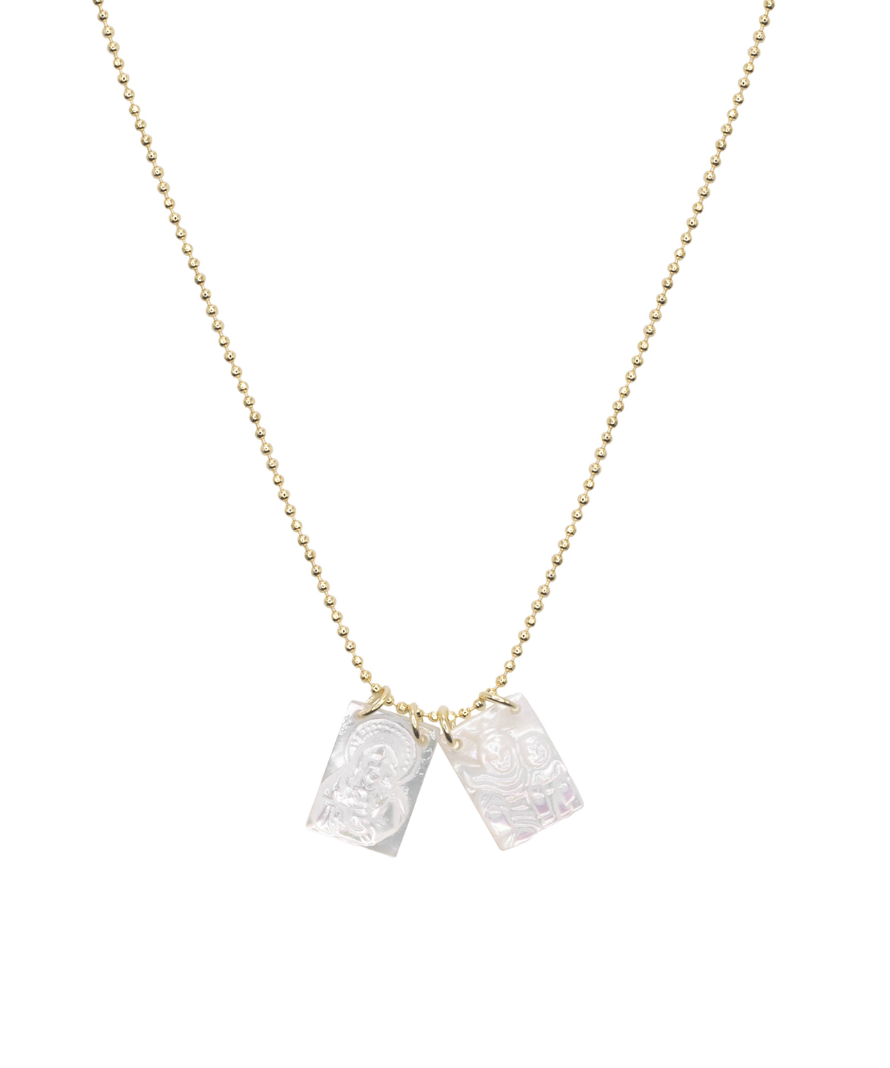 Collar de cadena de bolitas en plata de ley chapado en oro con dos colgantes en forma de escapulario de madreperla.