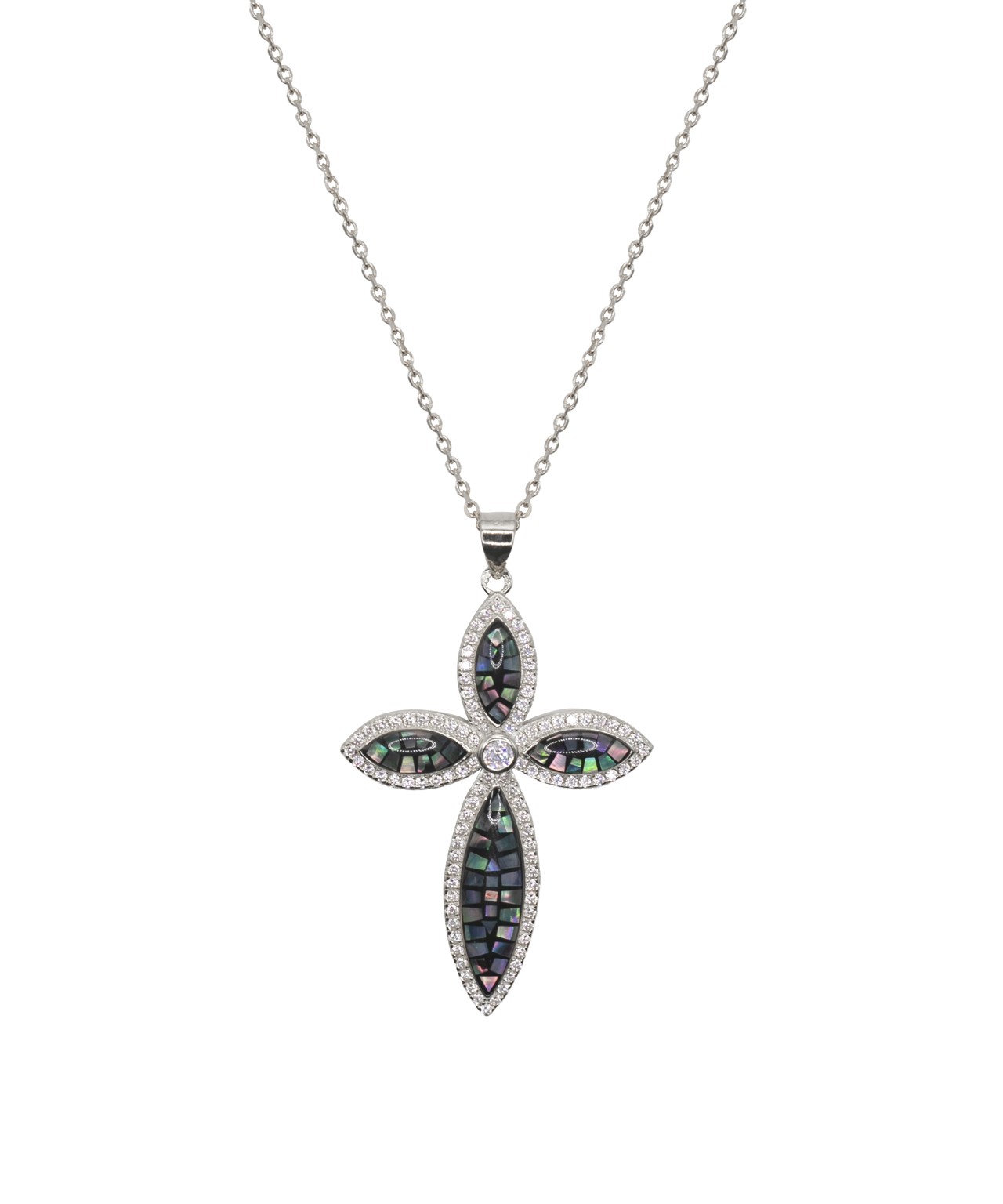 Collar en plata de ley con colgante en forma de cruz con circonitas y concha natural. (Avalon)