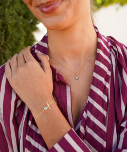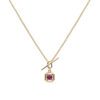 Collar en plata de ley chapado en oro con colgante en forma cuadrada con circonita celeste en el centro. Este original colgante posee, además del cierre trasero típico, un cierre delantero formado por una barra que pasa la cadena.