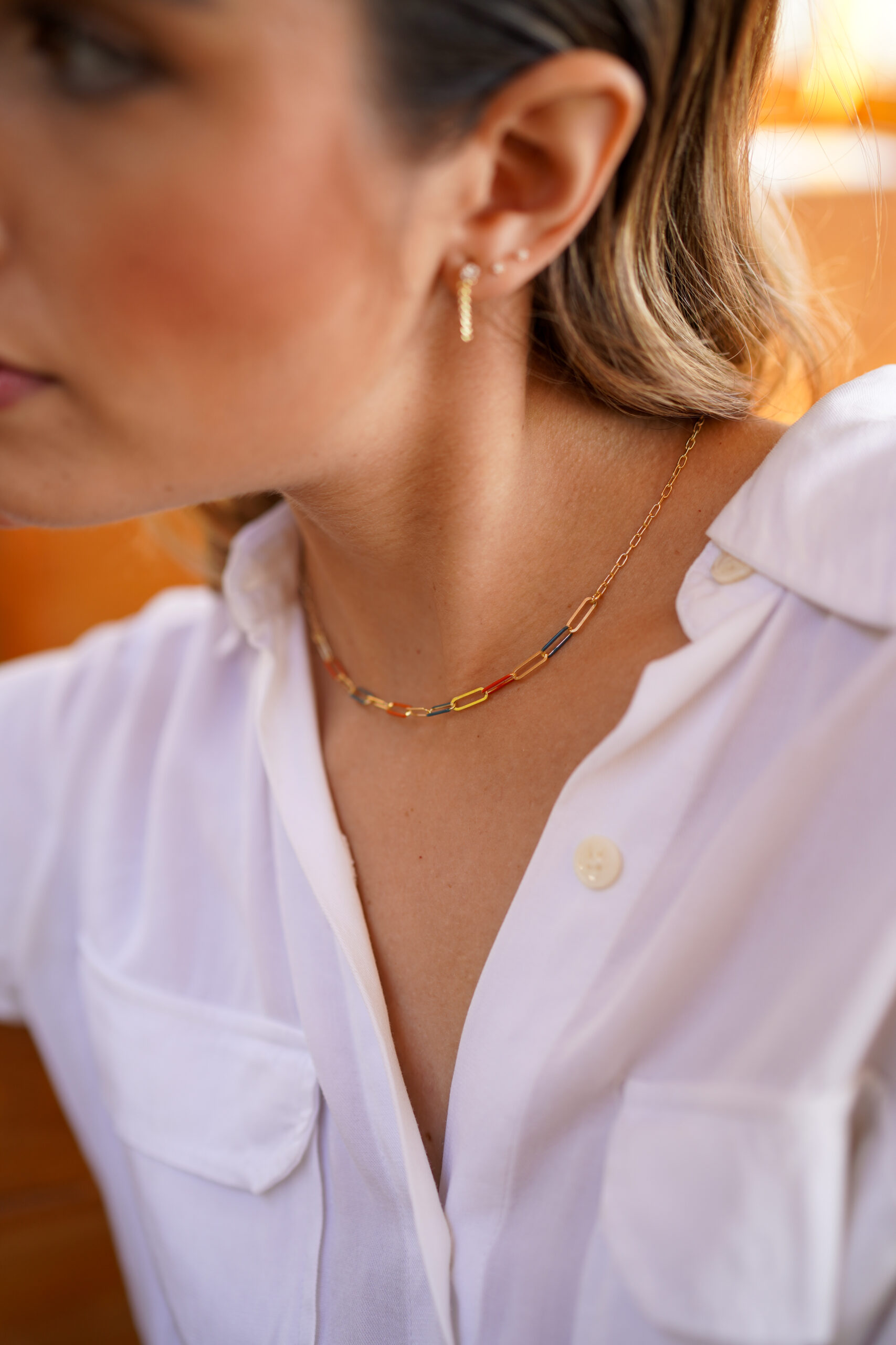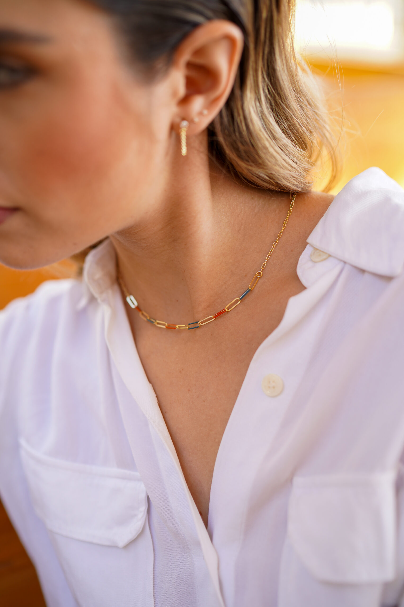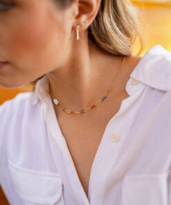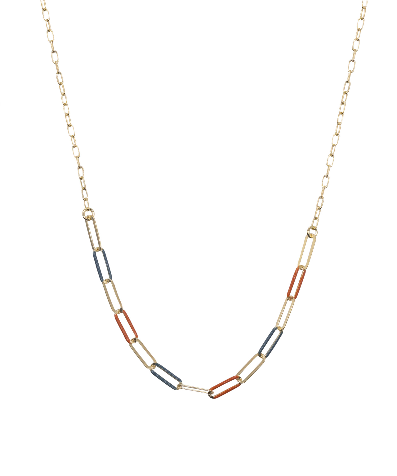 Collar en plata de ley chapado en oro con eslabones lisos y esmaltados en color naranja y azul, alternándose entre ellos.