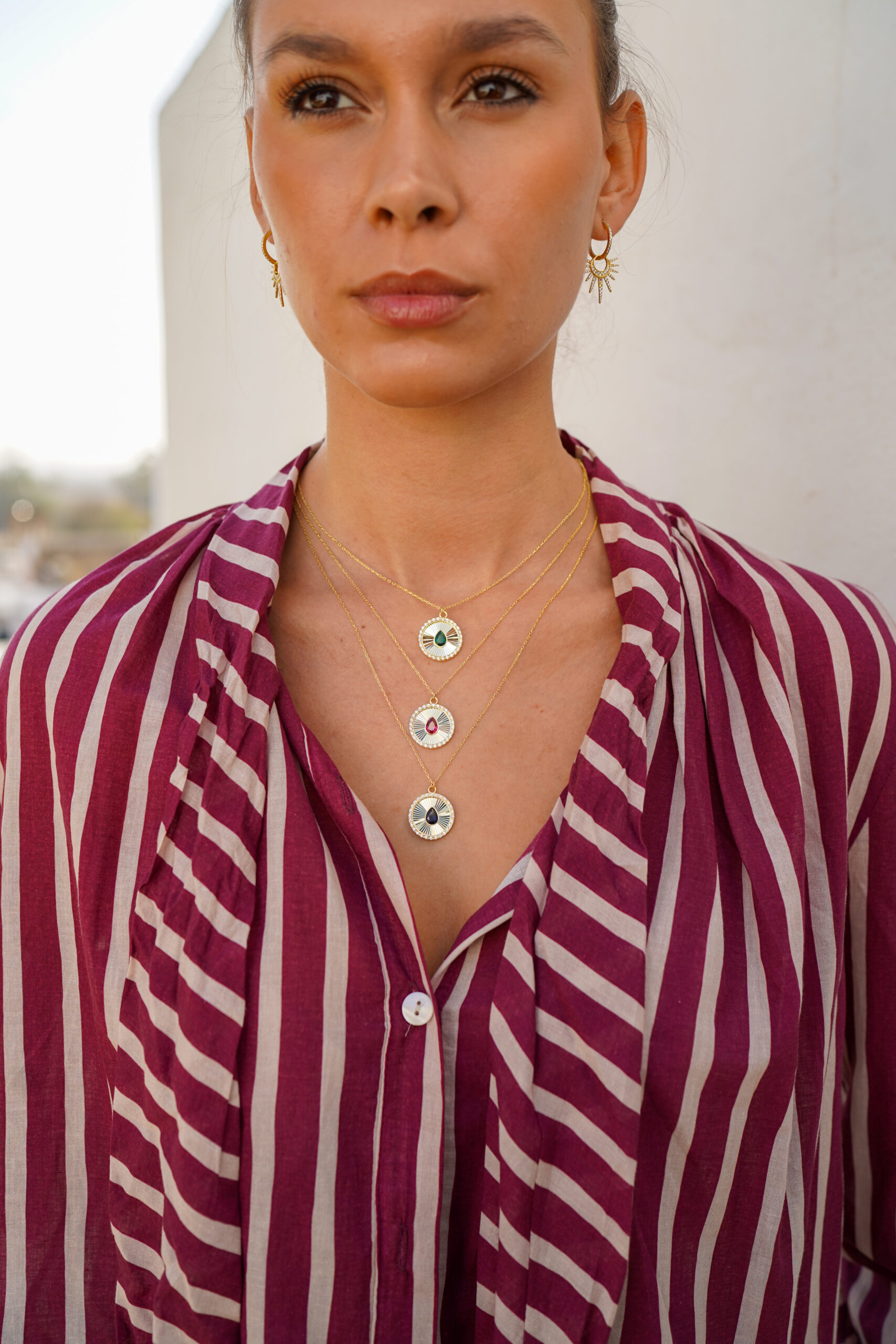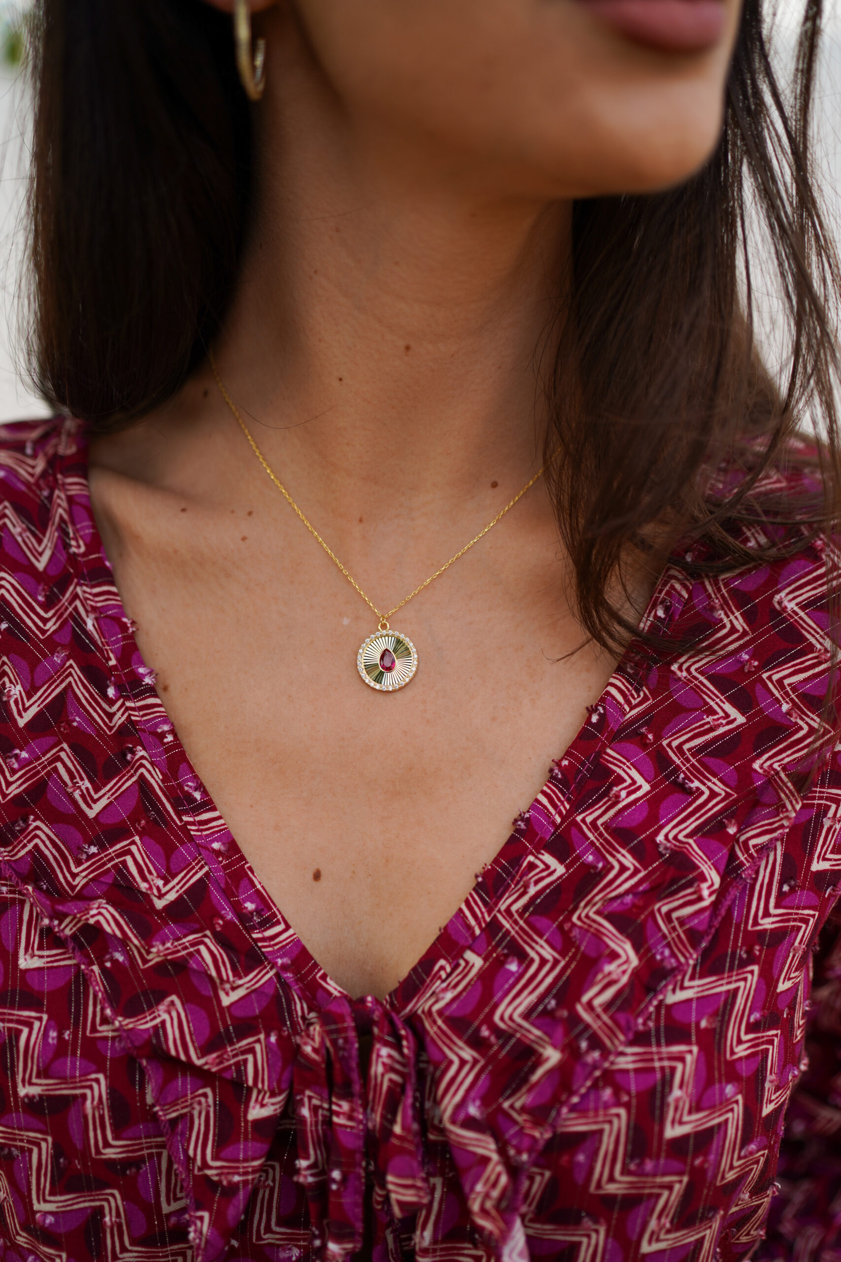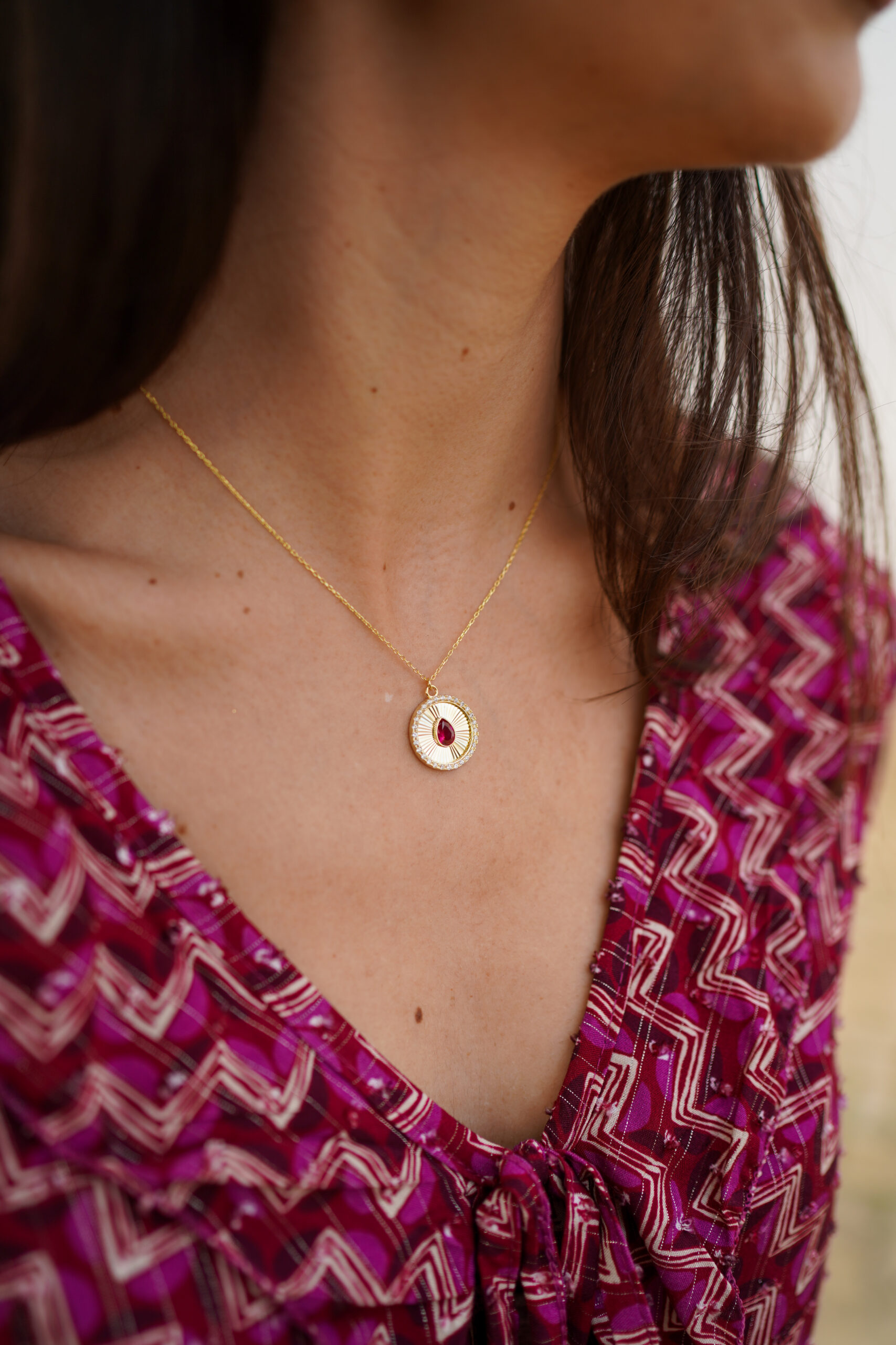 Collar en plata de ley chapado en oro con colgante en forma circular con piedra central de color rojo en forma de gota y circonitas en todo el perímetro.