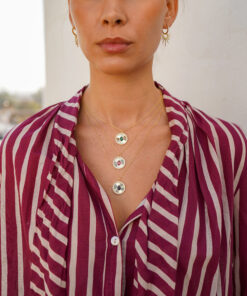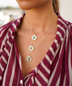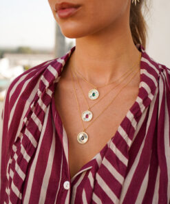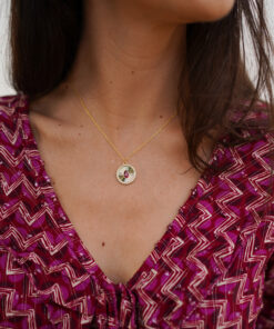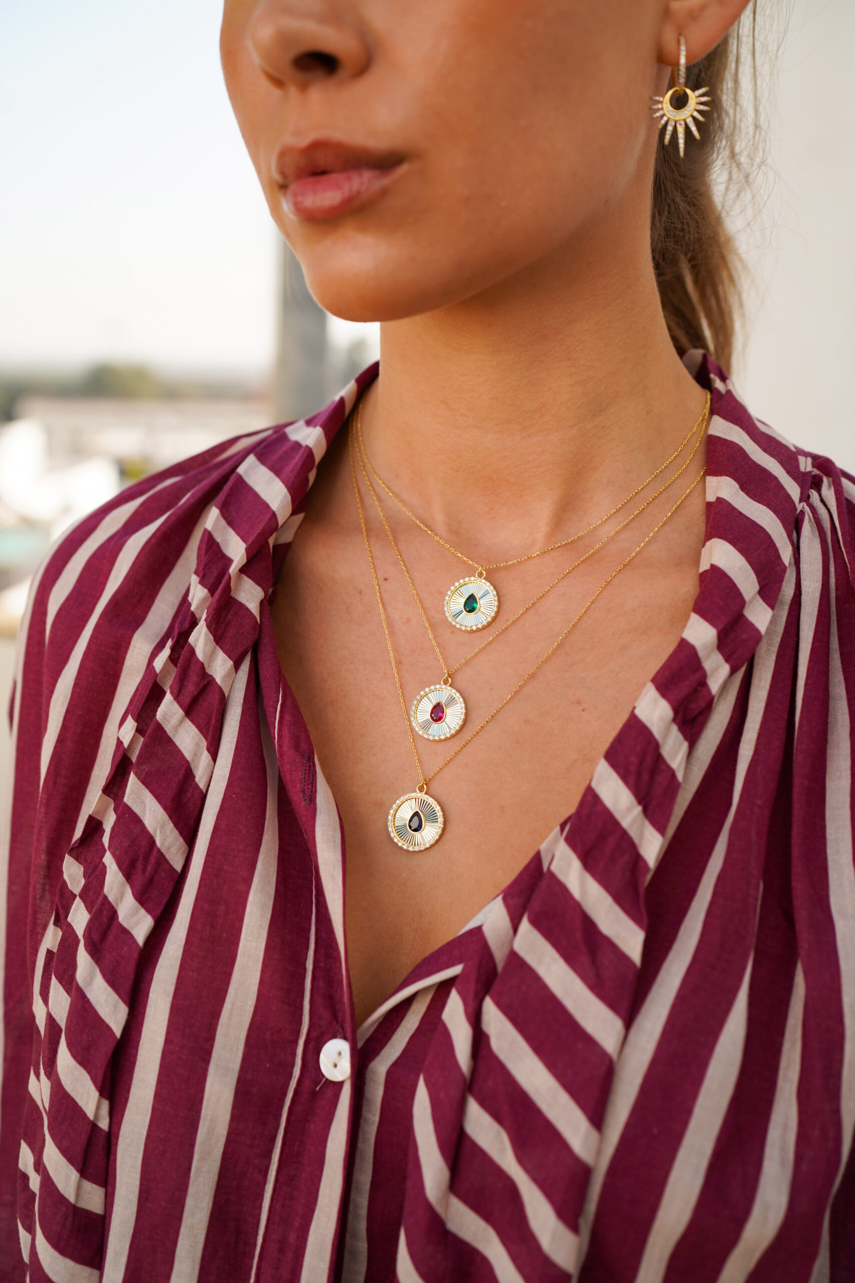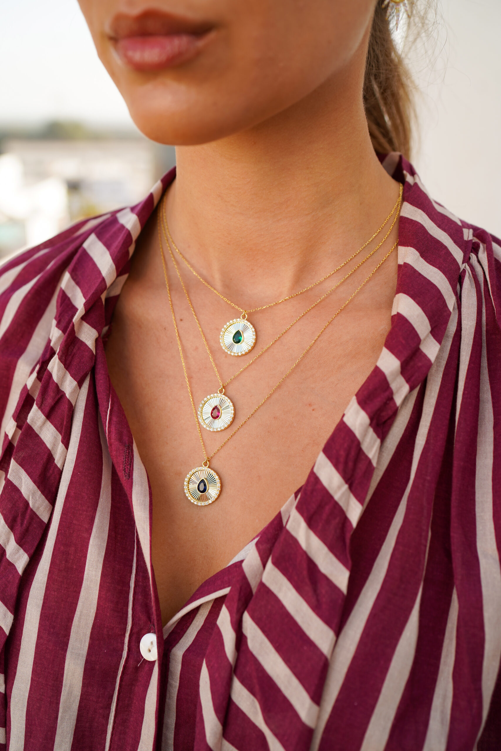 Collar en plata de ley chapado en oro con colgante en forma circular con piedra central de color rojo en forma de gota y circonitas en todo el perímetro.