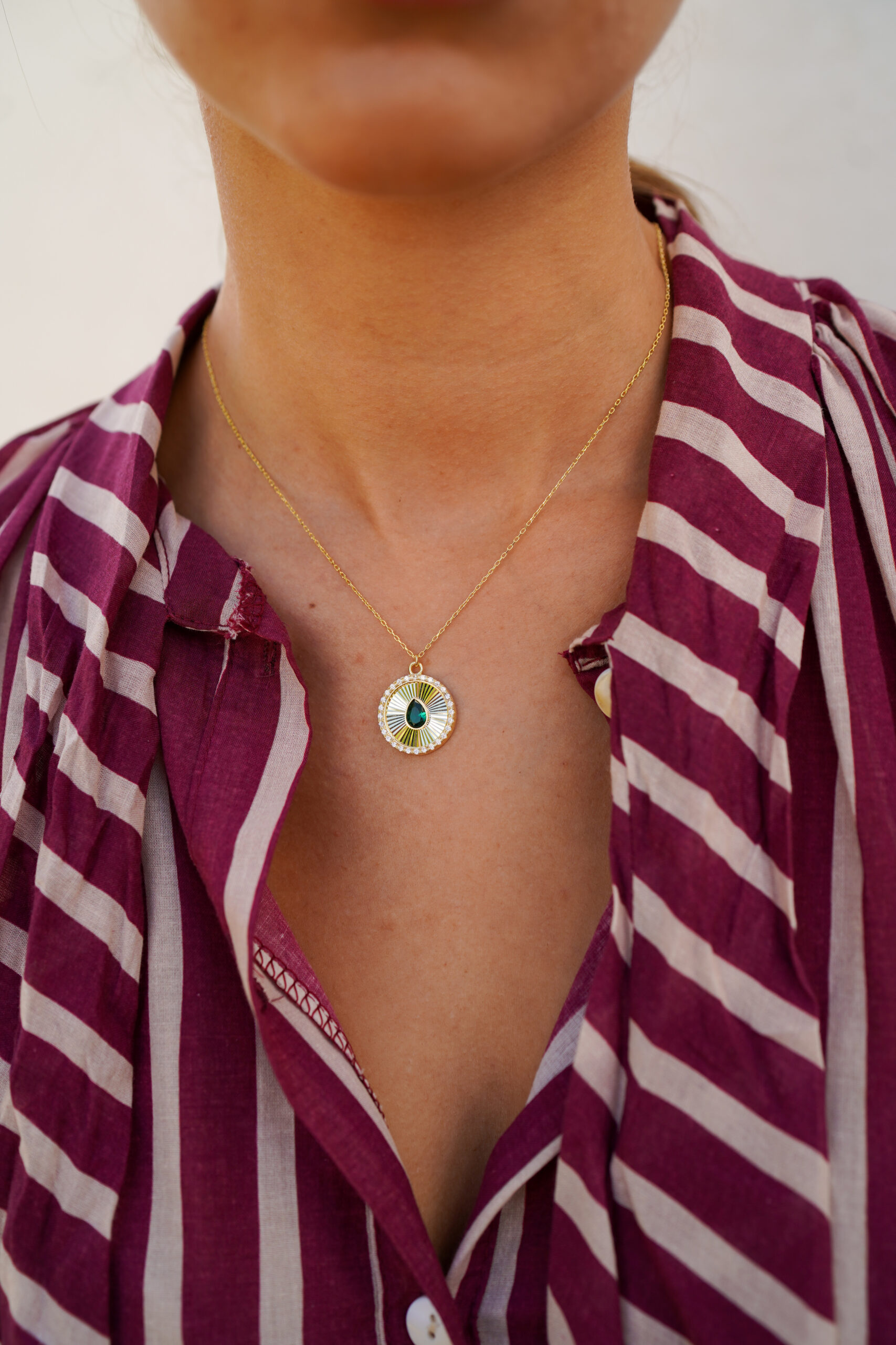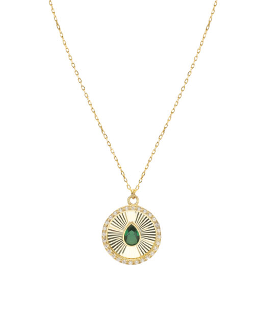 Collar en plata de ley chapado en oro con colgante en forma circular con piedra central de color verde en forma de gota y circonitas en todo el perímetro.