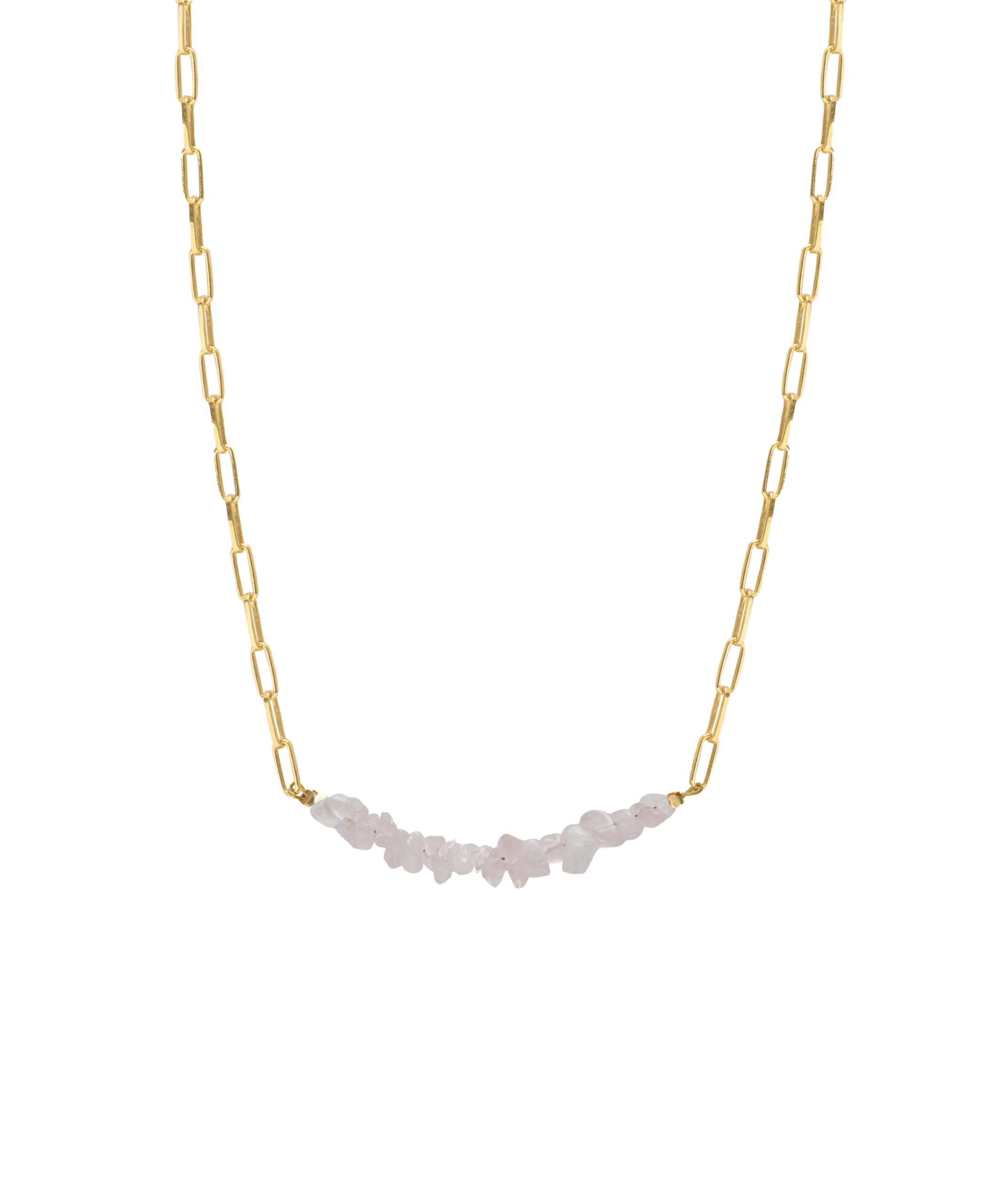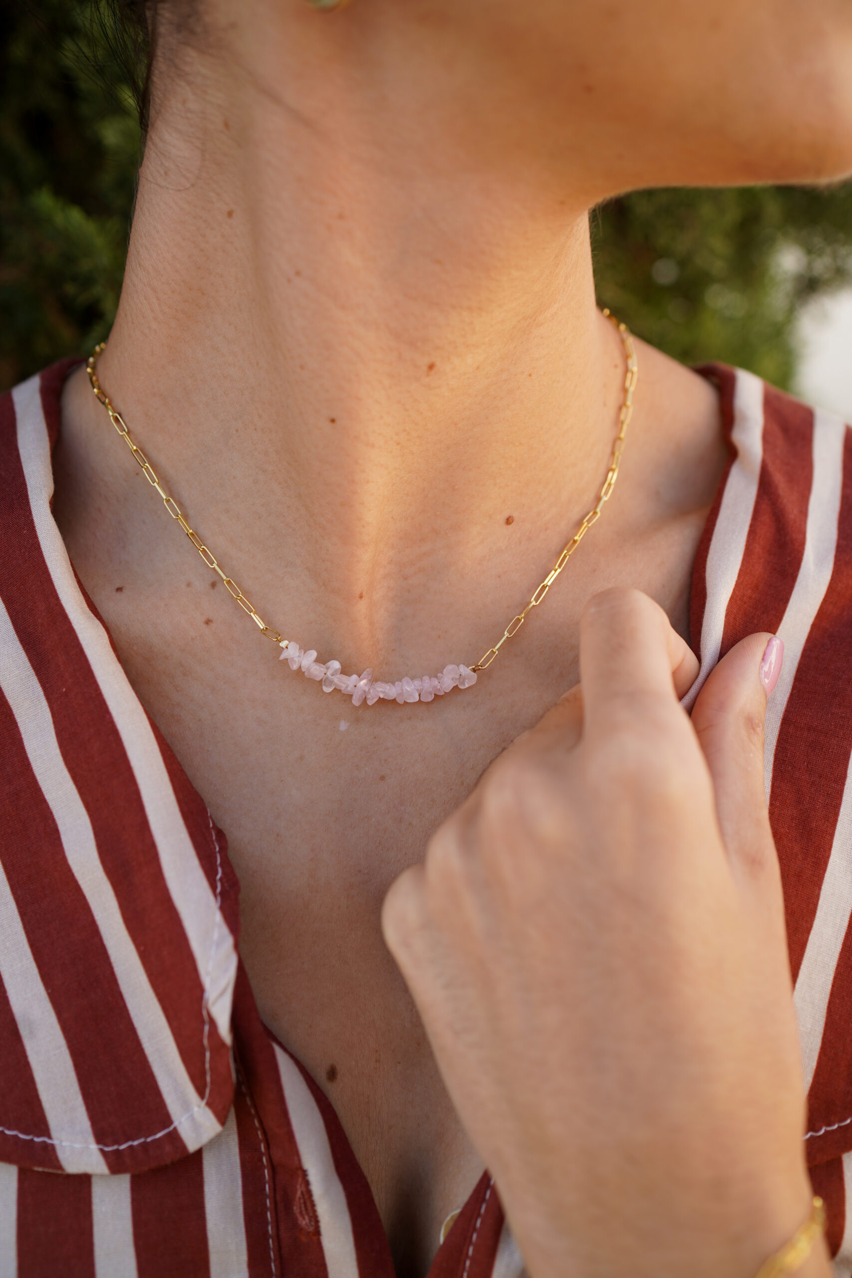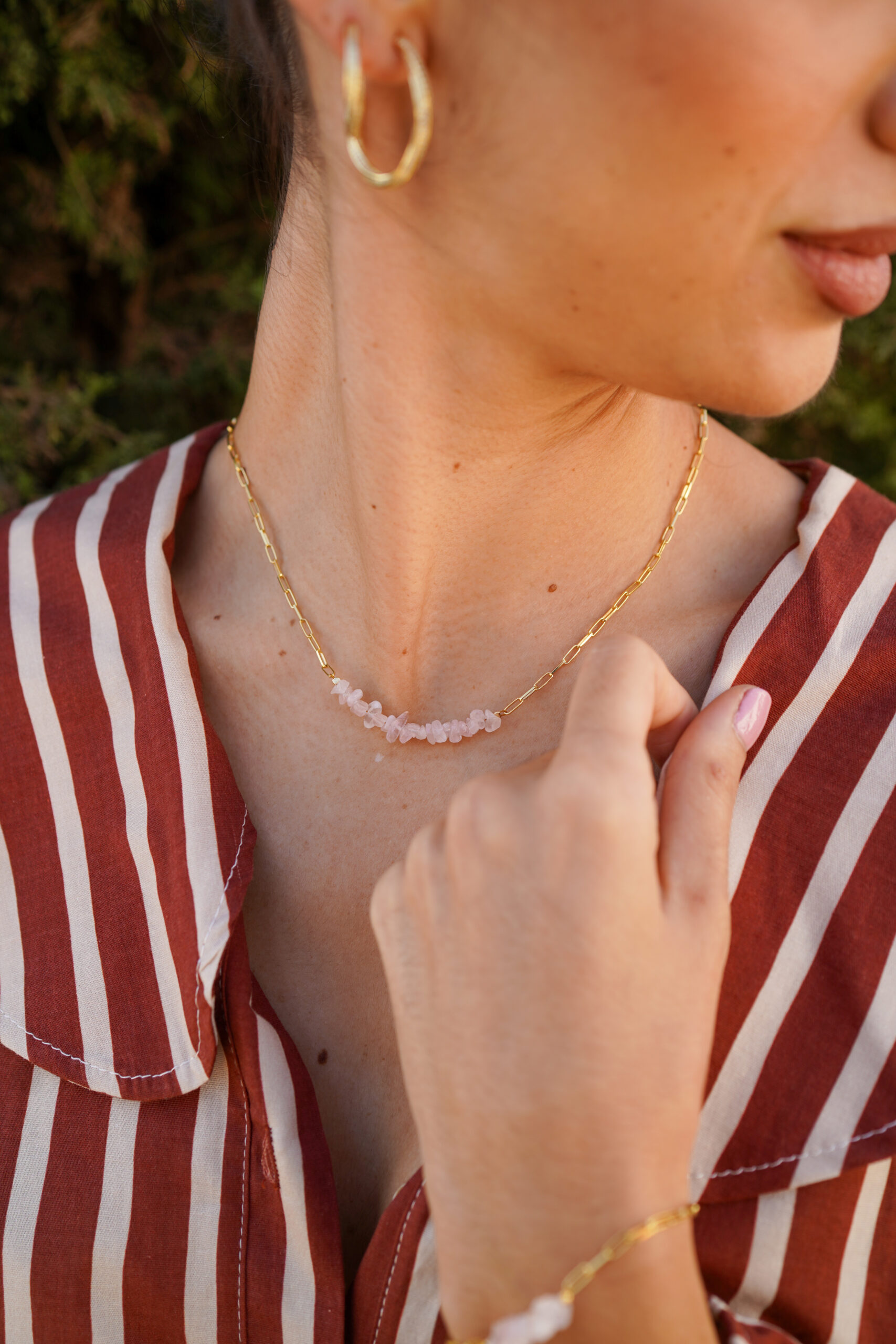 Collar en plata de ley chapado en oro con centro de piedras cuarzo rosa irregulares y cadena de eslabones.