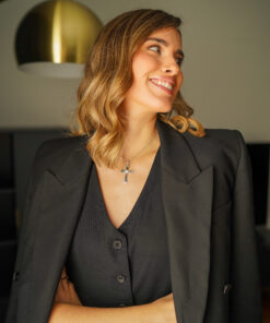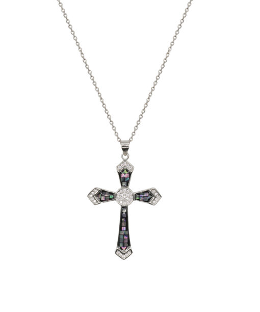 Collar en plata de ley con colgante en forma de cruz con circonitas y concha natural. (Avalon)