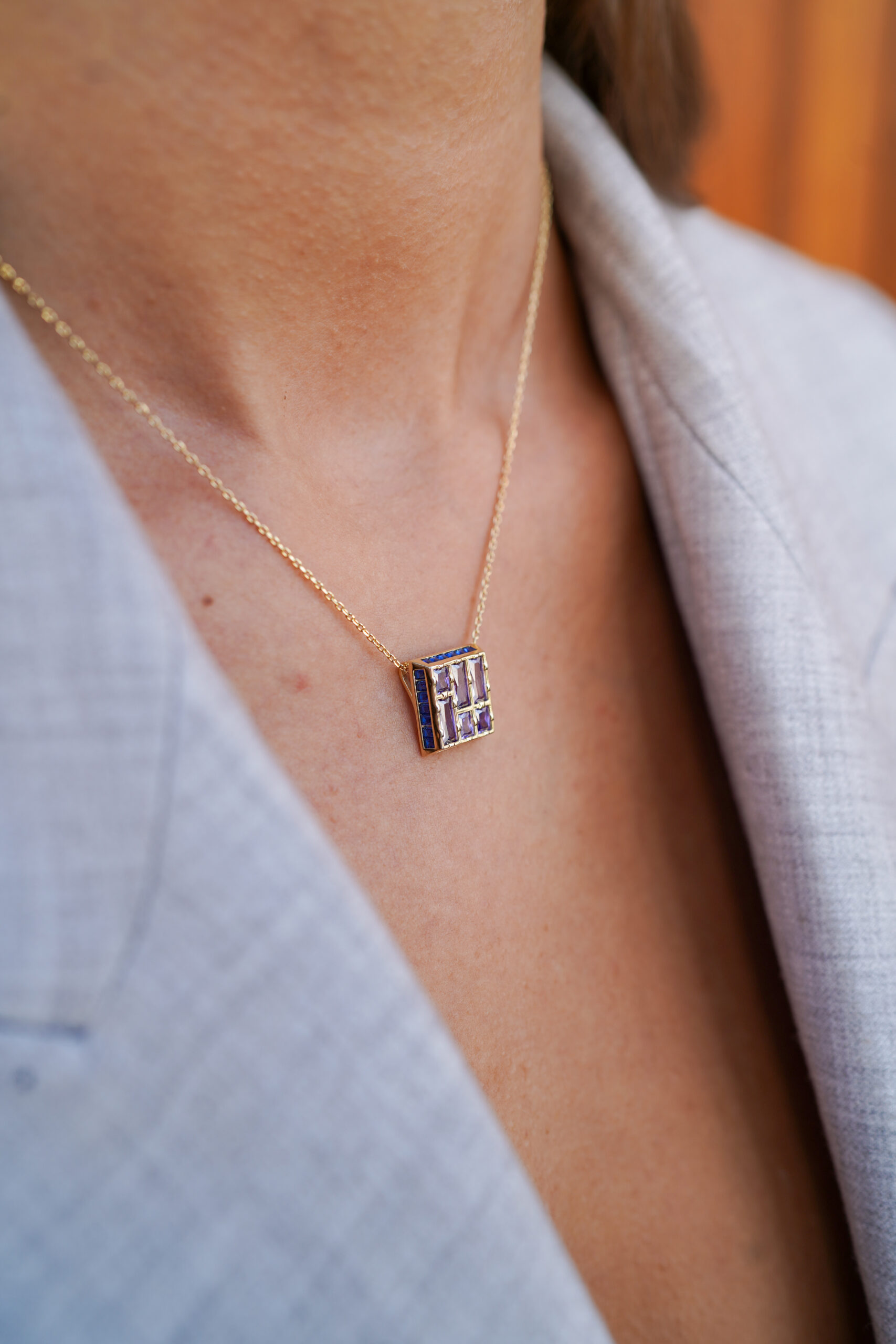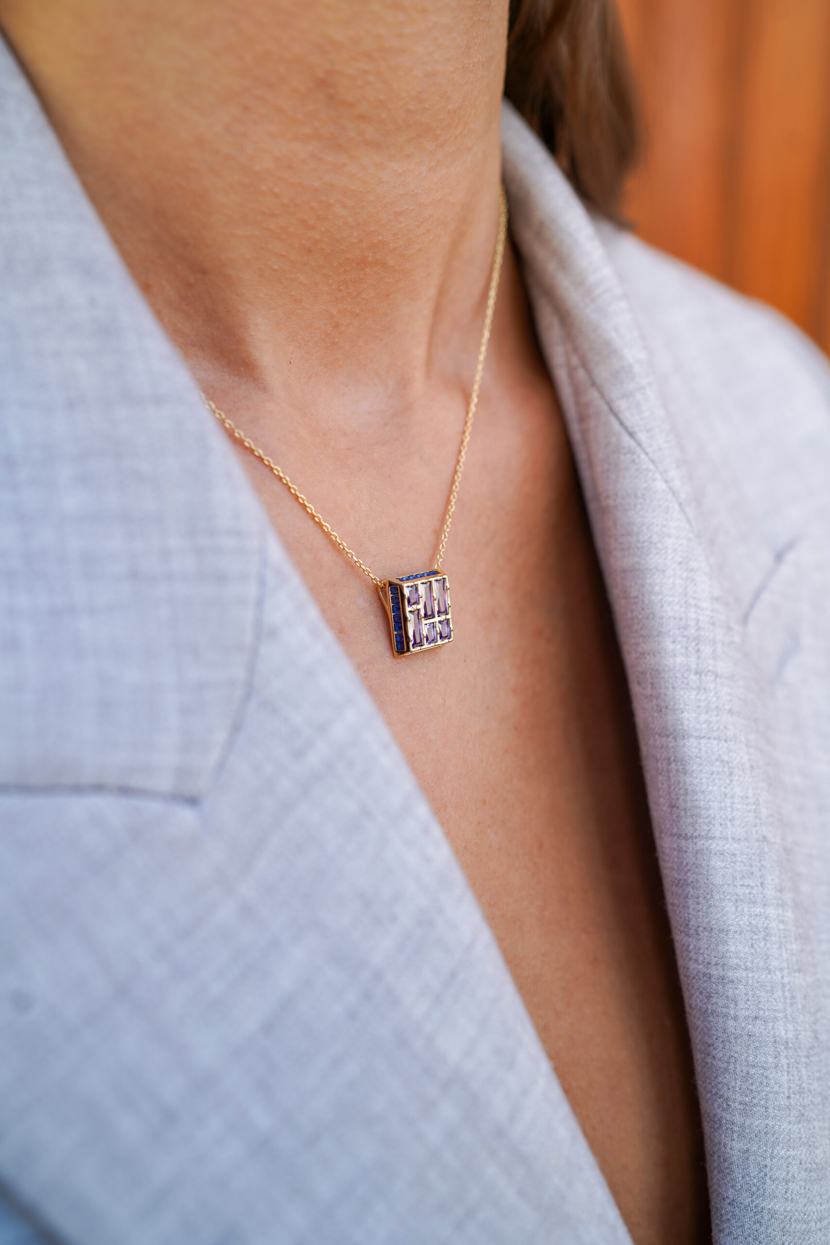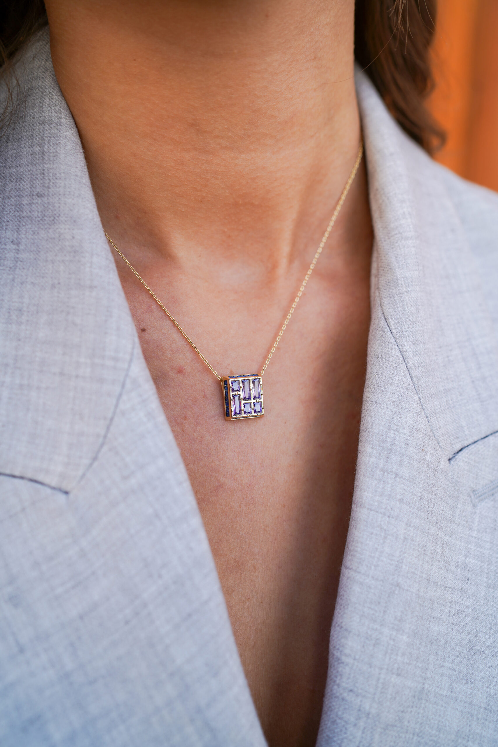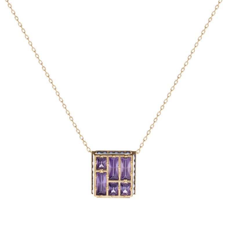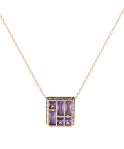 Collar en plata de ley chapado en oro con colgante formado por una pieza de motivo geométrico con seis amatistas de talla princesa en su interior y el contorno con circonitas tono zafiro engastadas.