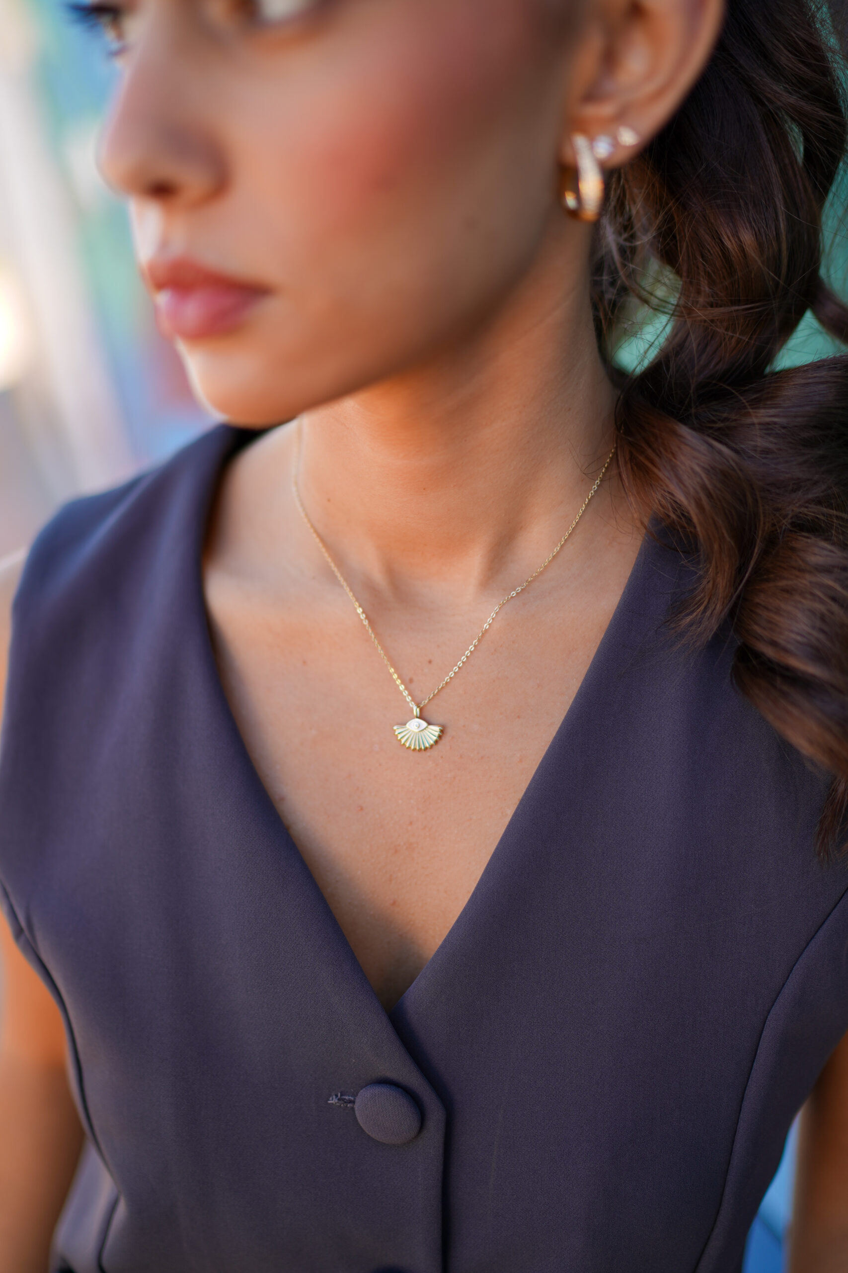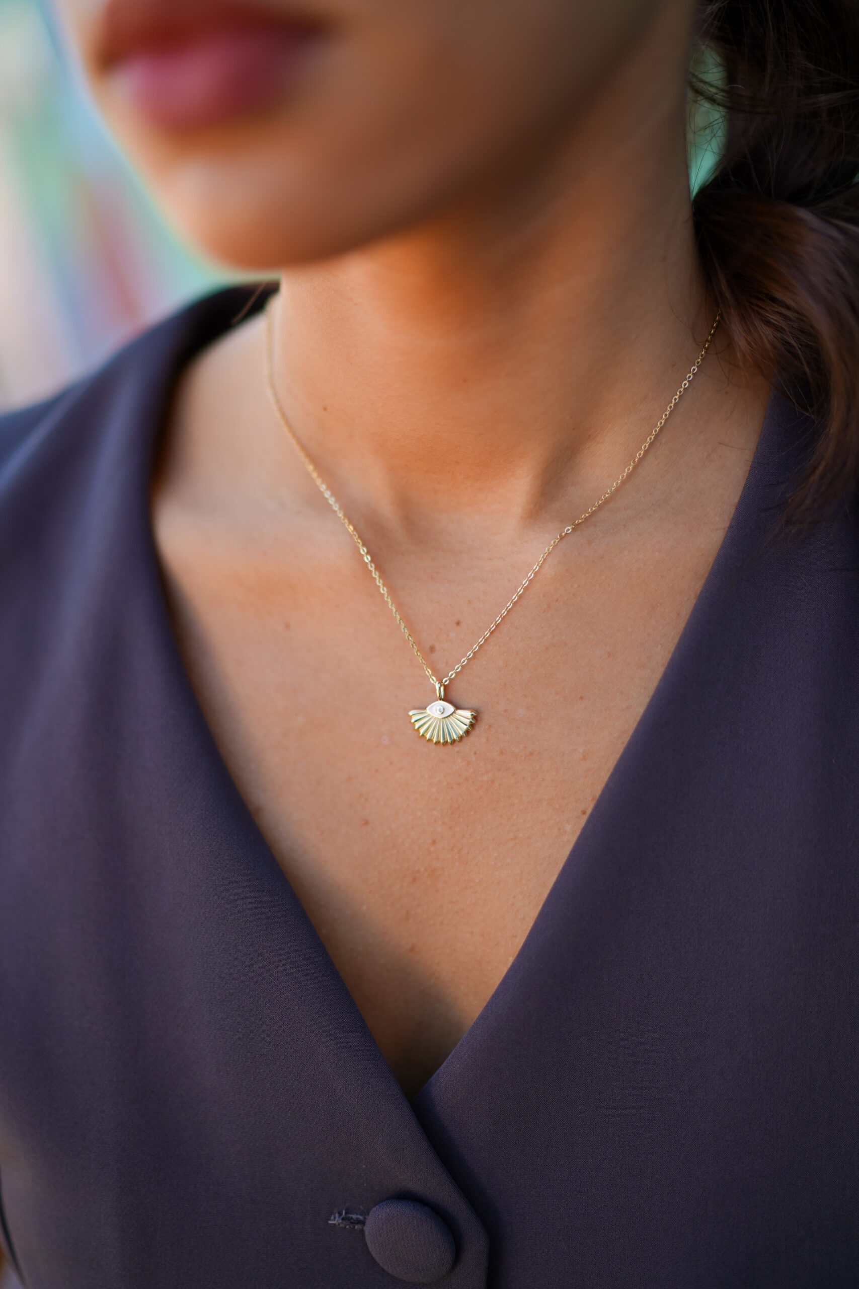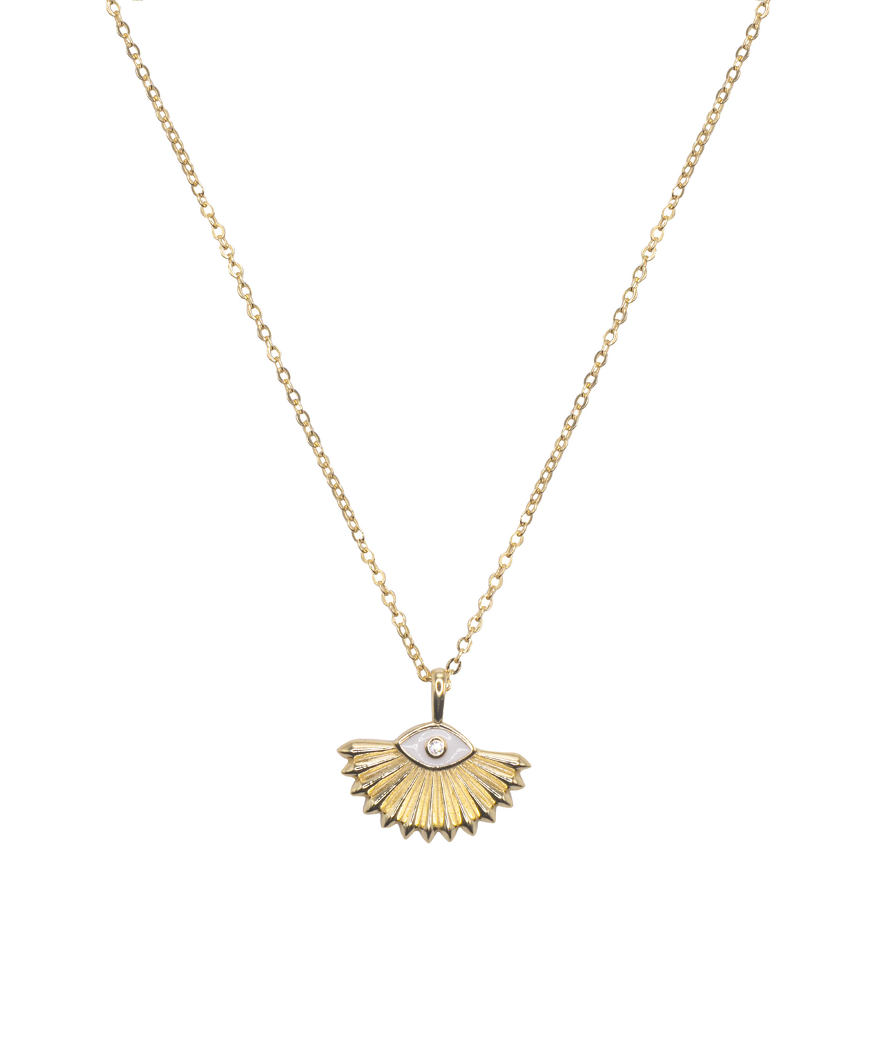 Collar en plata de ley chapado en oro con colgante en forma semicírculo con un ojo esmaltado blanco y circonio en el centro.