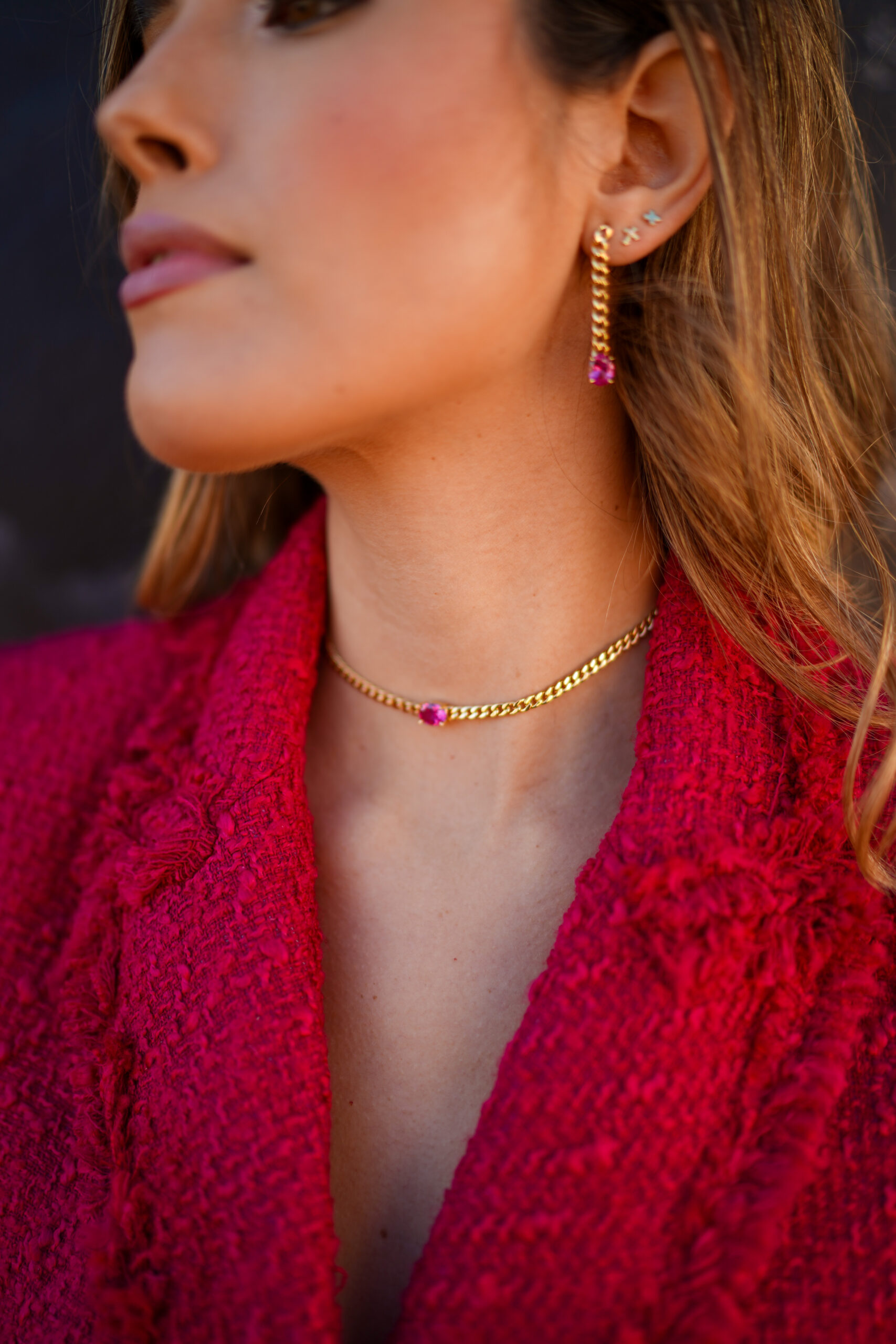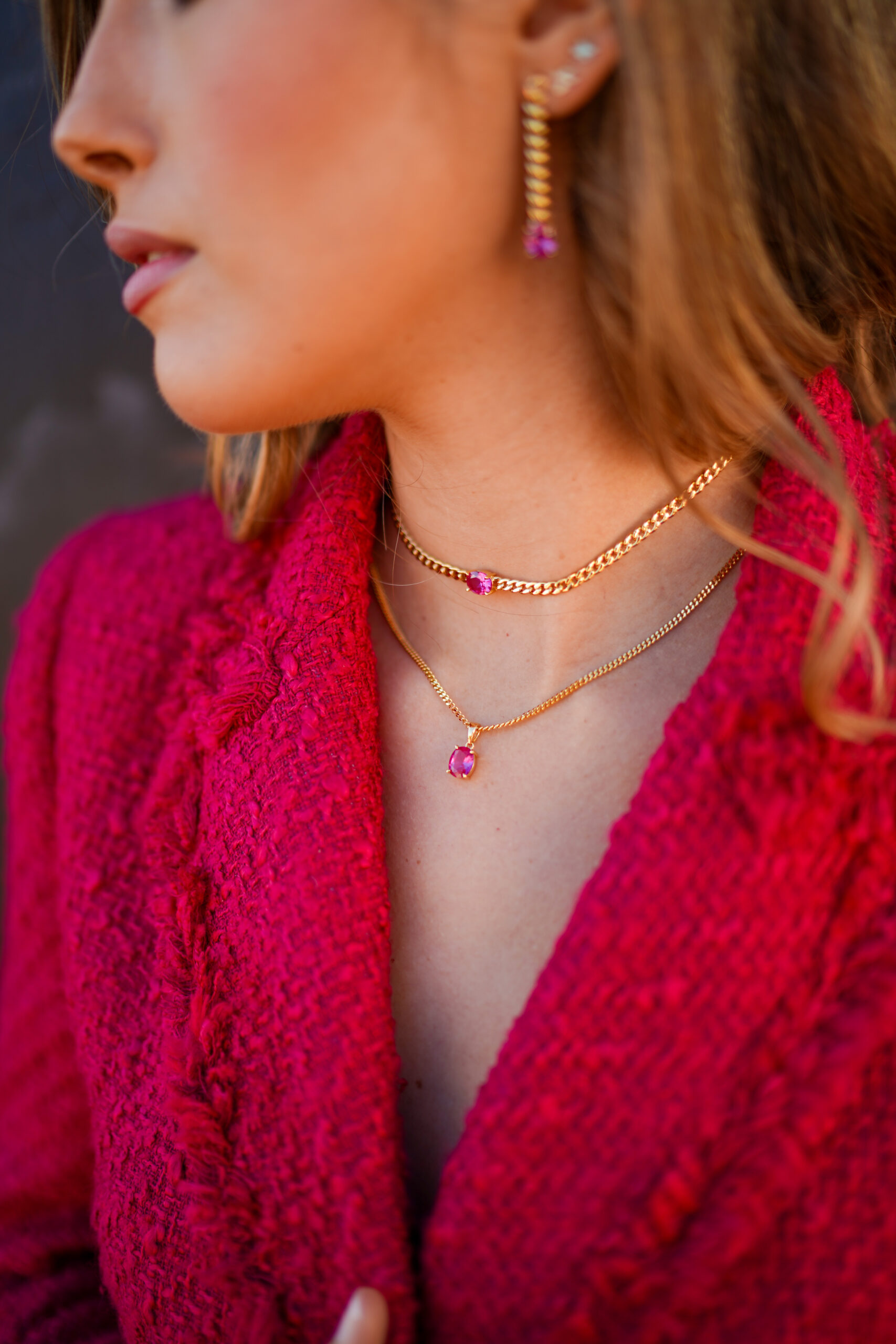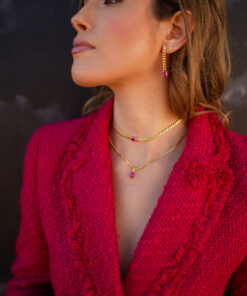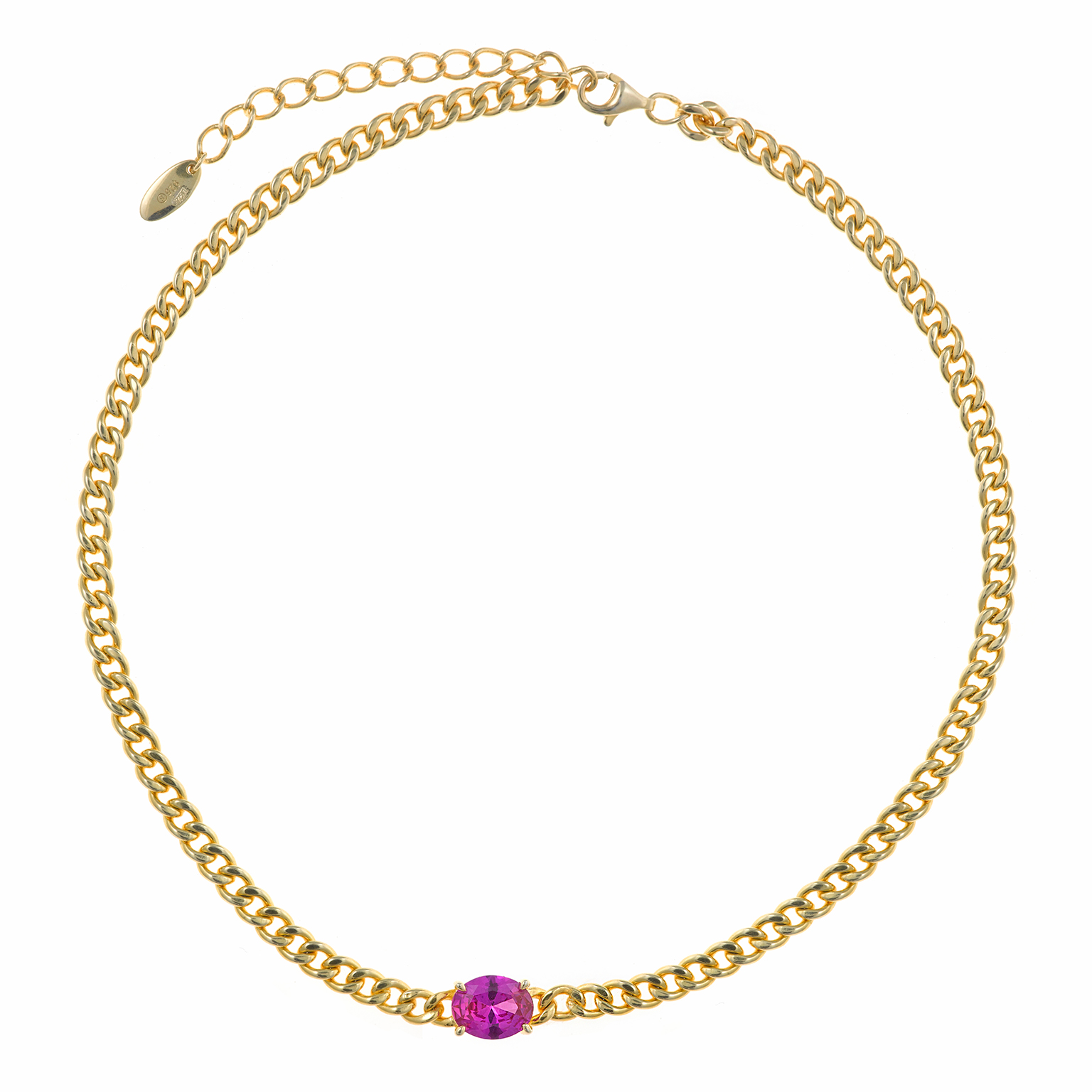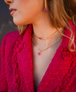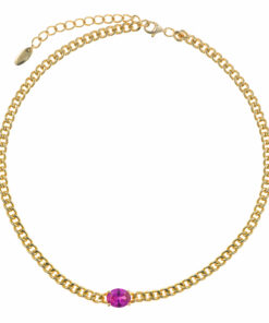 Collar en plata de ley chapado en oro con piedra central de color rosa sujeta por cuatro garras y cadena de eslabón tipo barbada ancho.