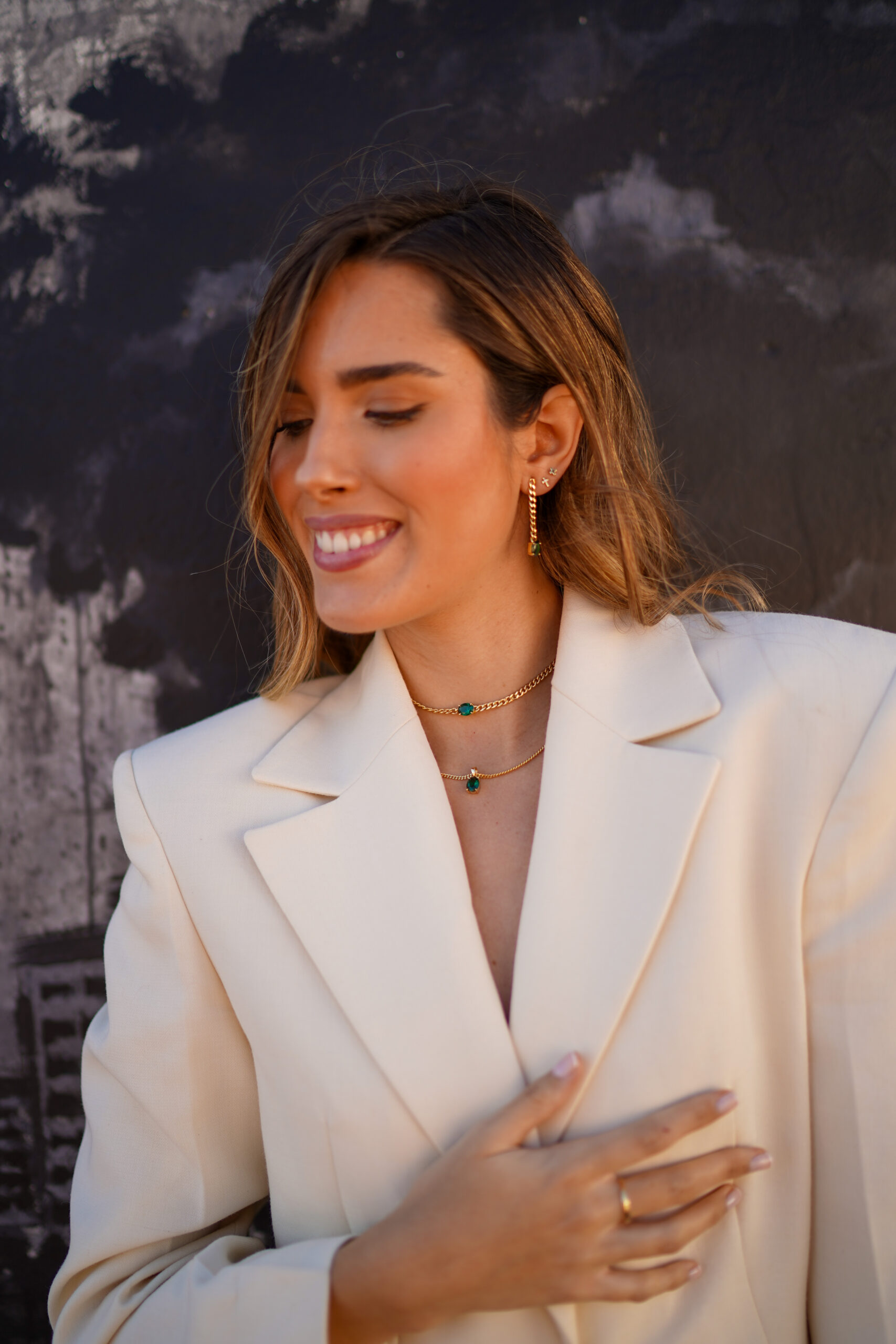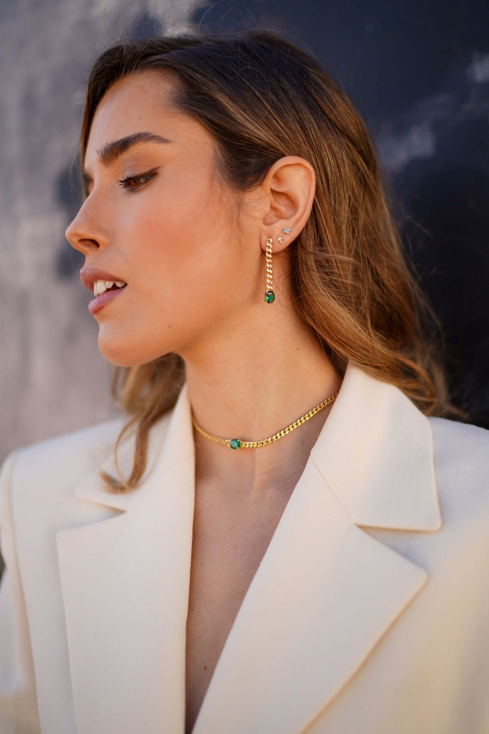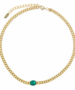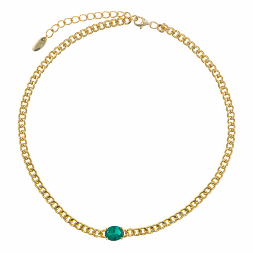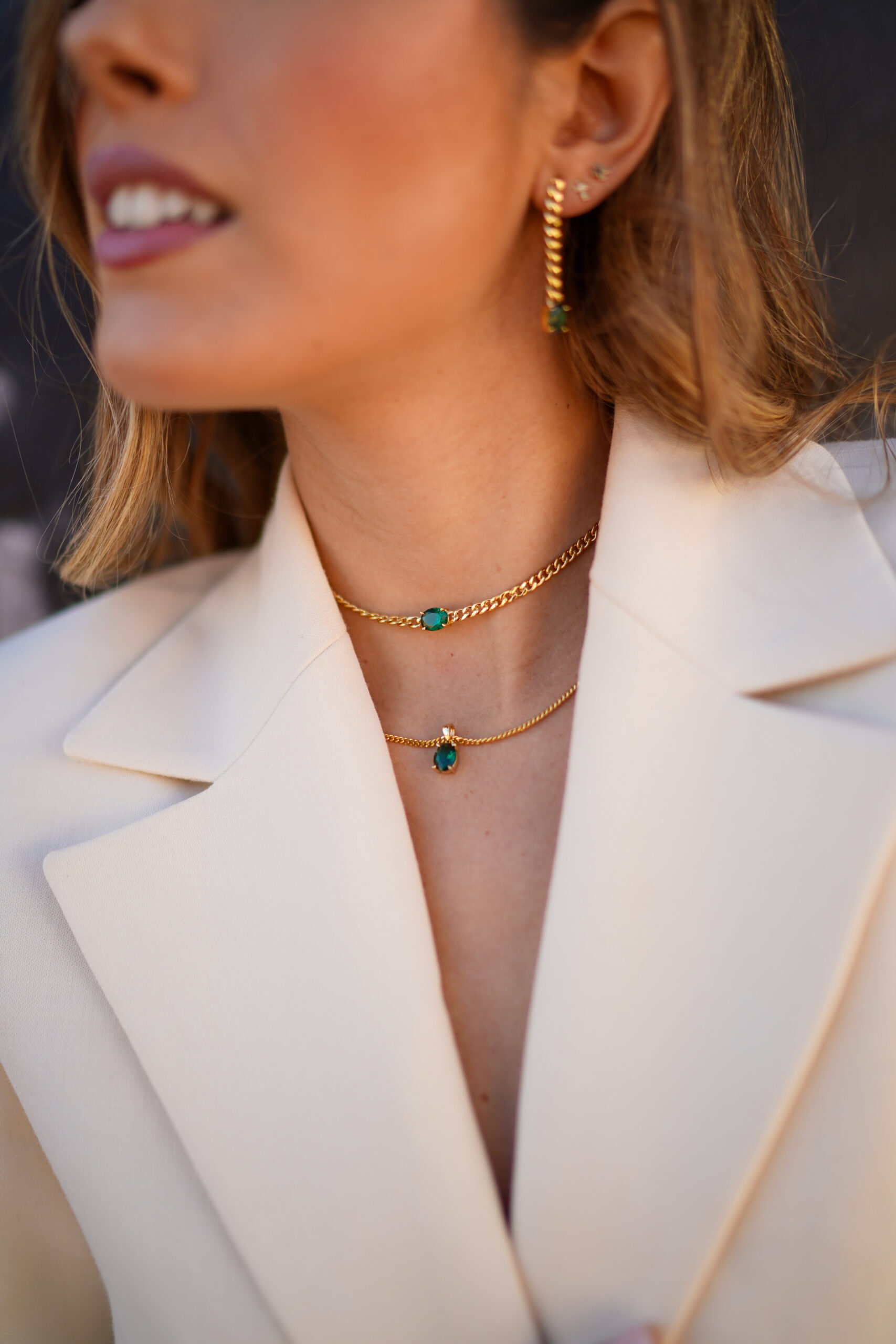 Collar en plata de ley chapado en oro con piedra central de color verde sujeta por cuatro garras y cadena de eslabón tipo barbada ancho.