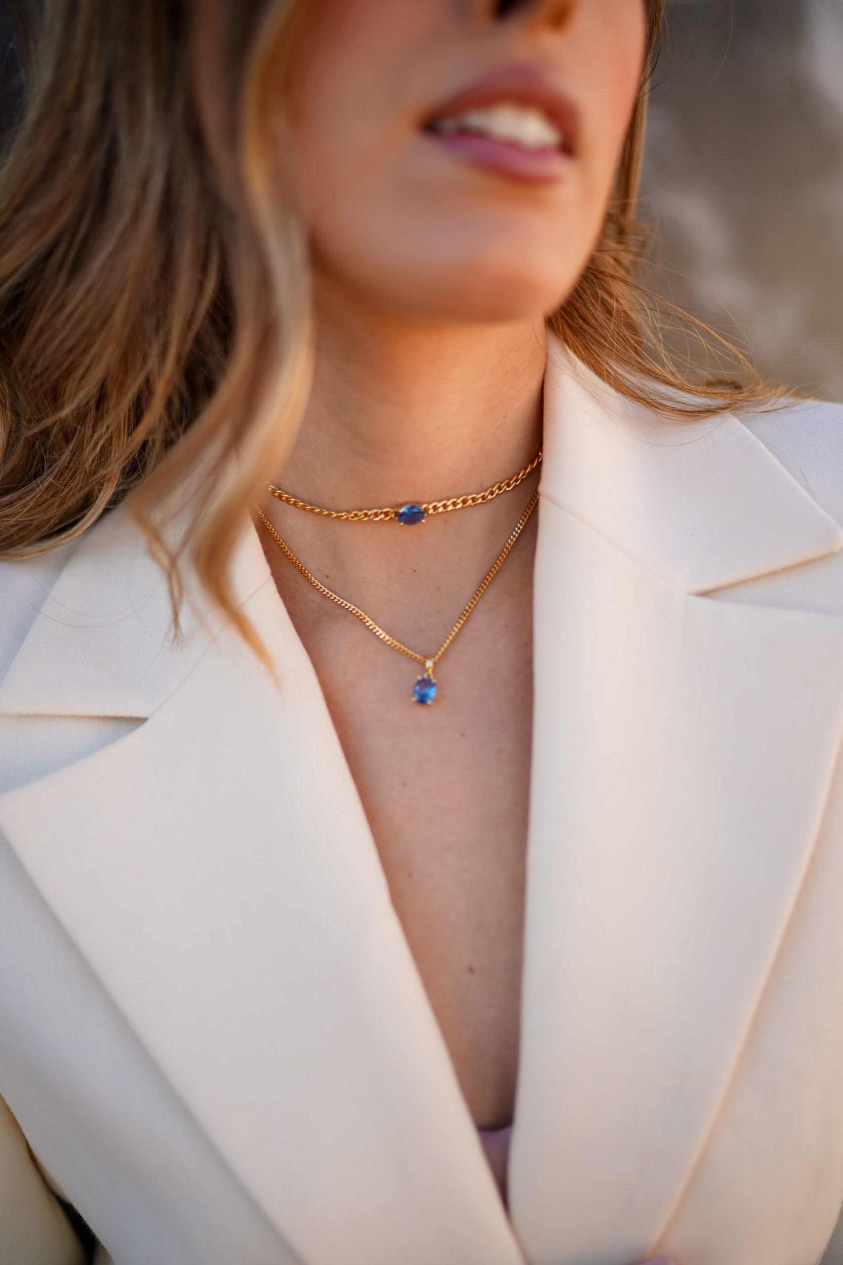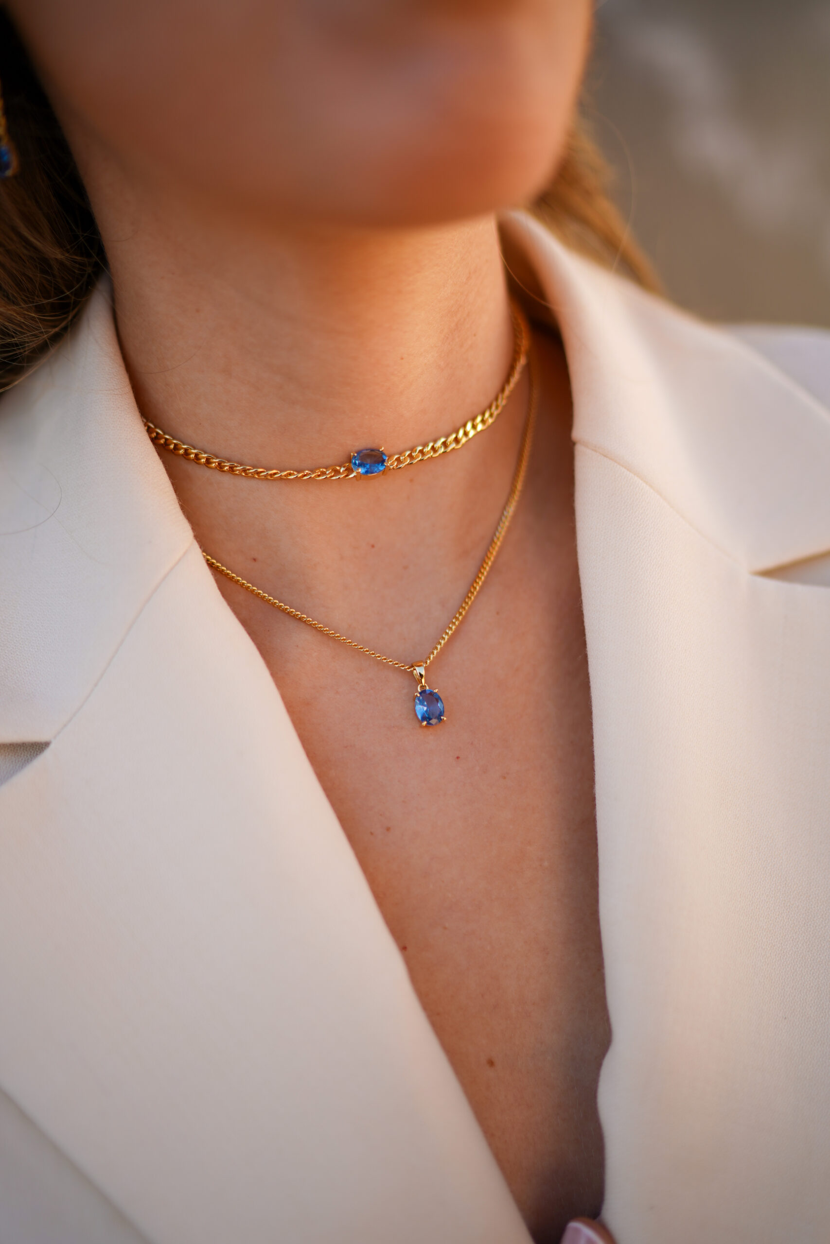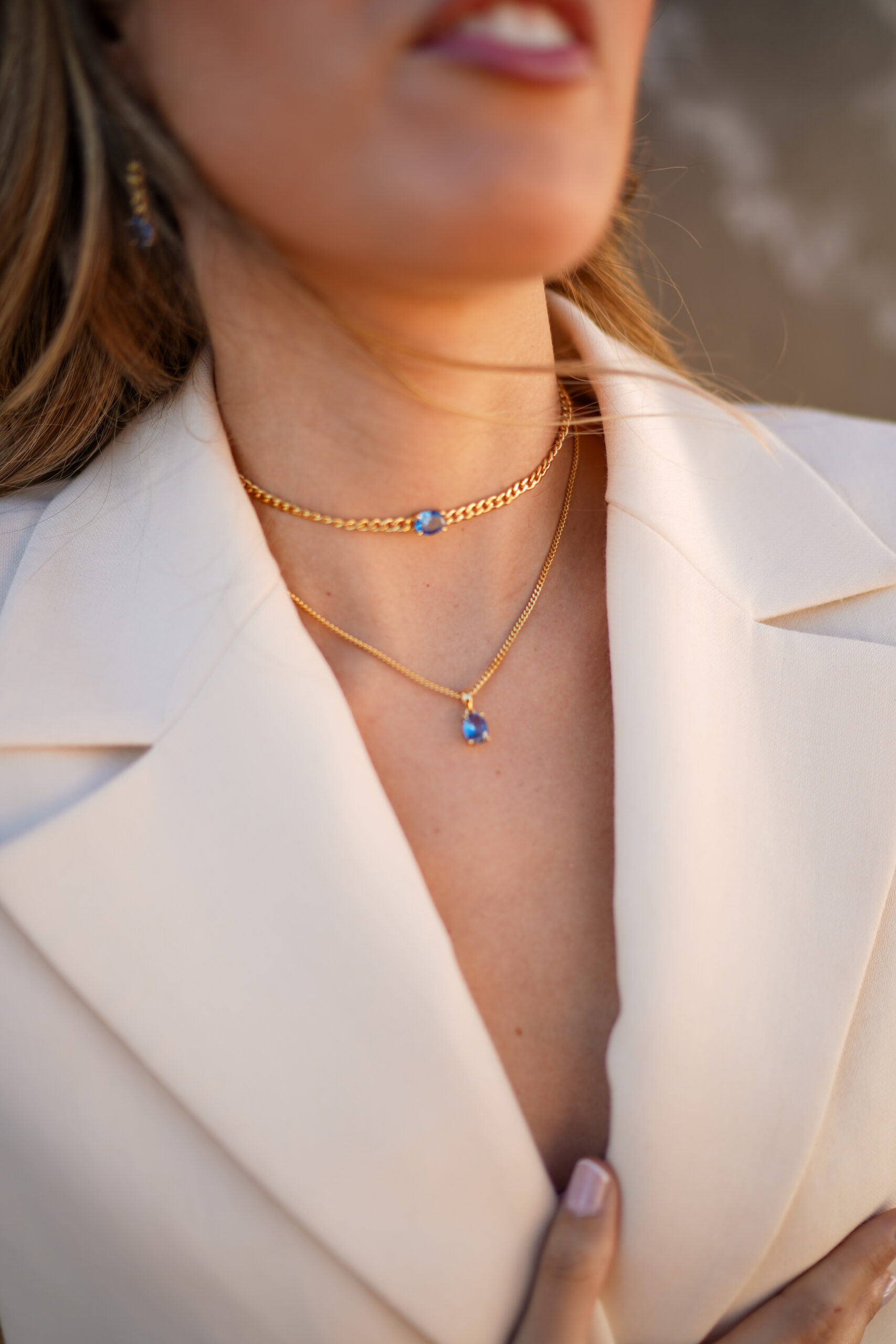 Collar en plata de ley chapado en oro con una piedra colgando de color azul y cadena de eslabón tipo barbada.