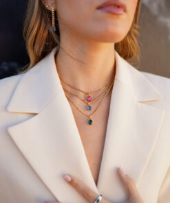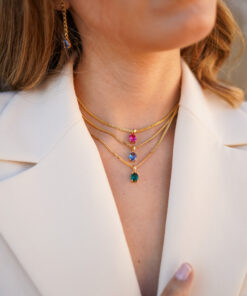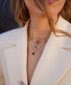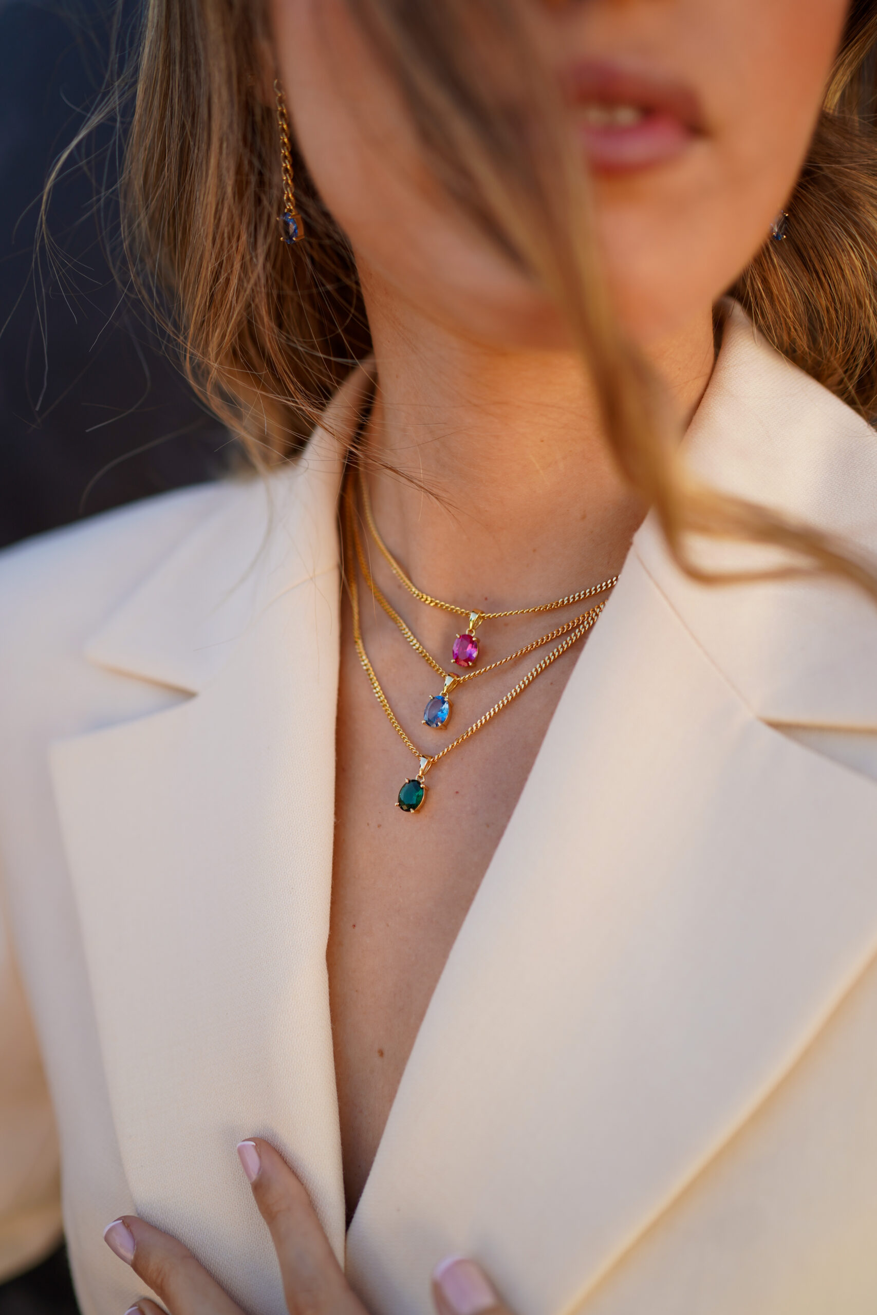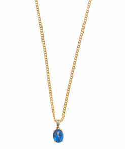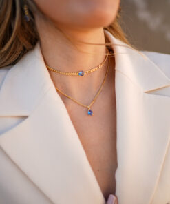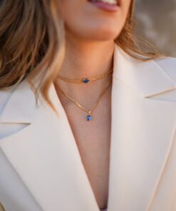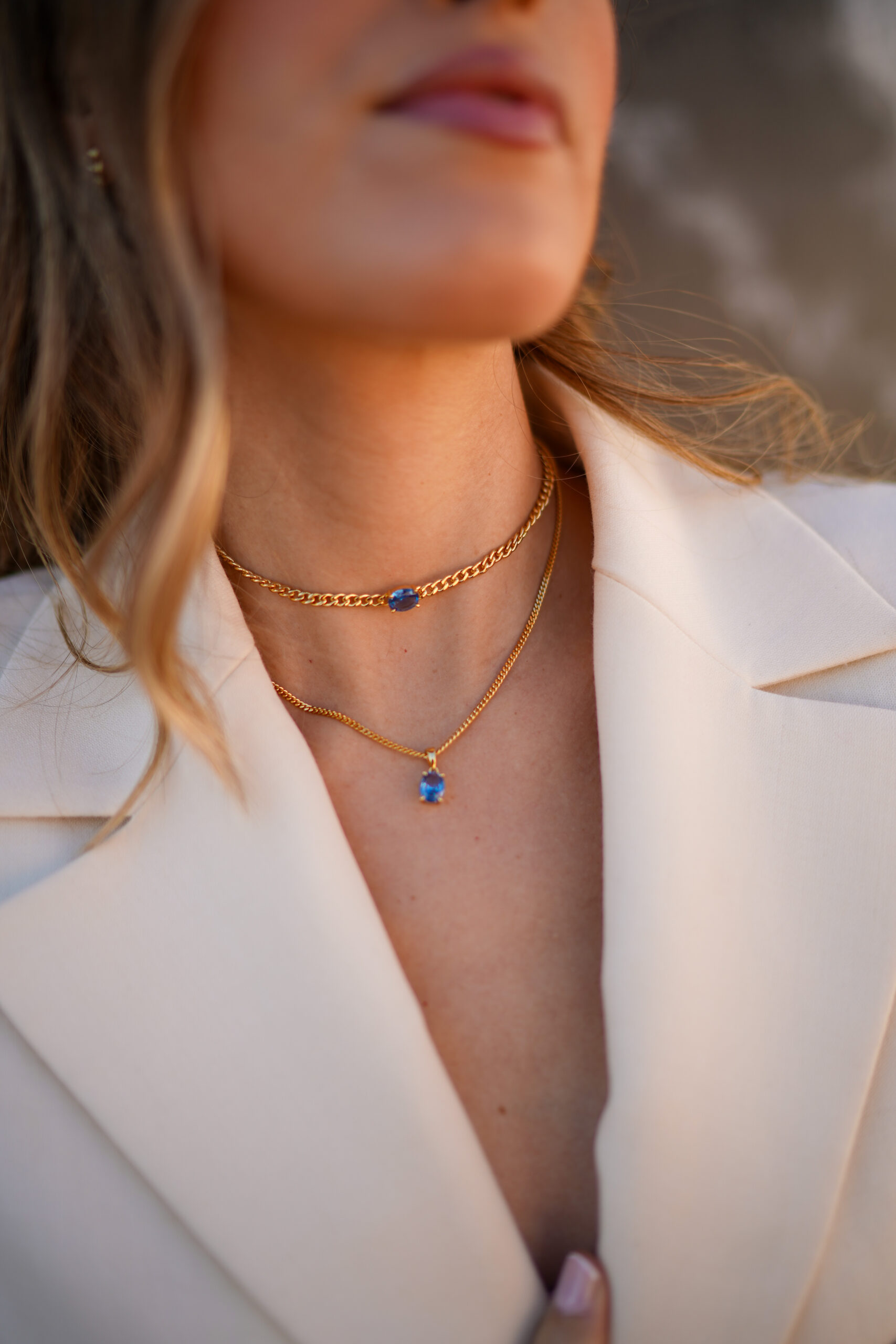 Collar en plata de ley chapado en oro con una piedra colgando de color azul y cadena de eslabón tipo barbada.