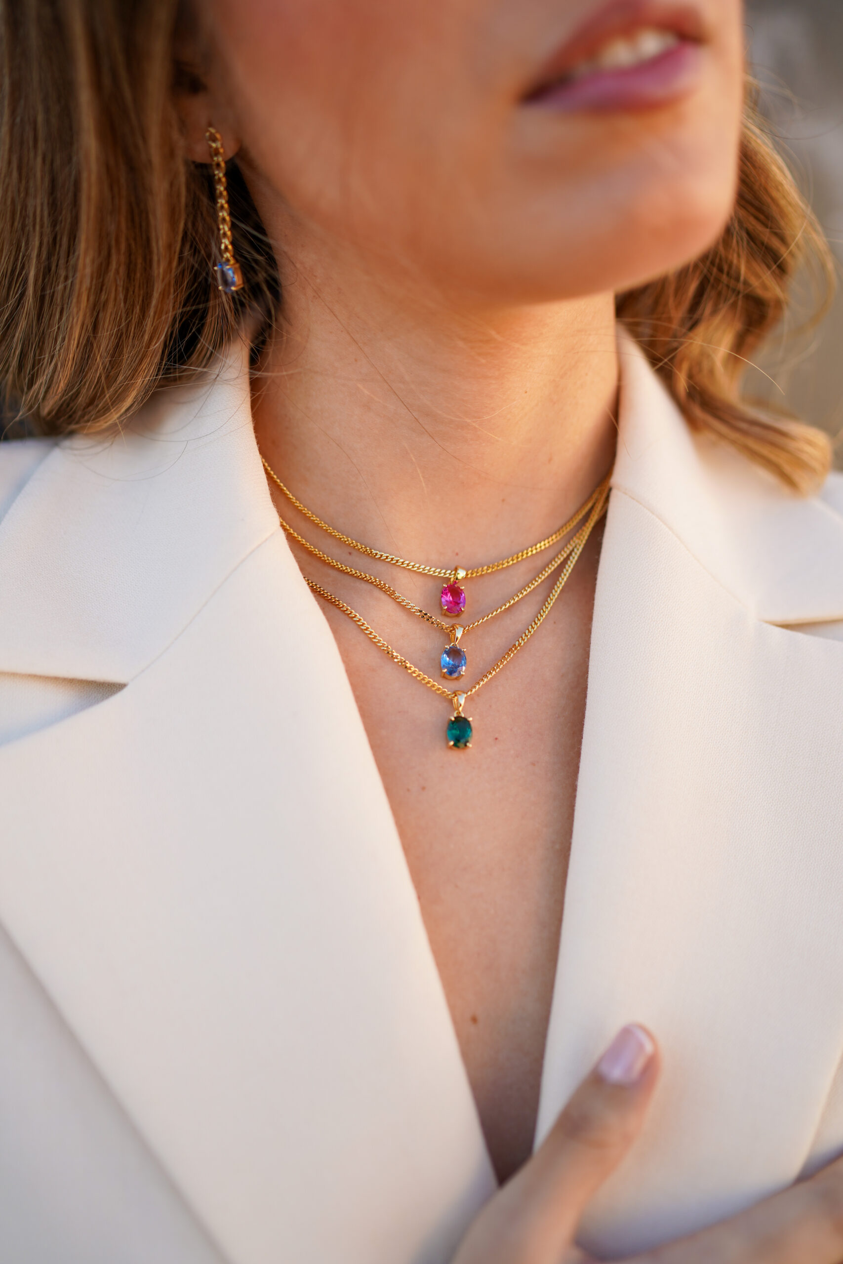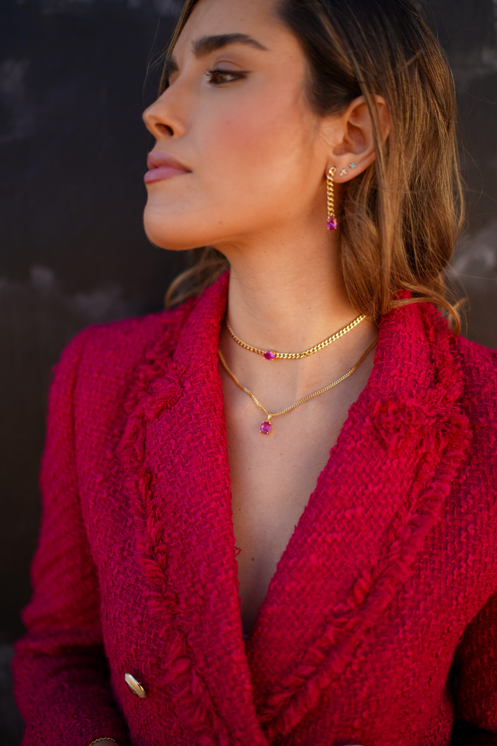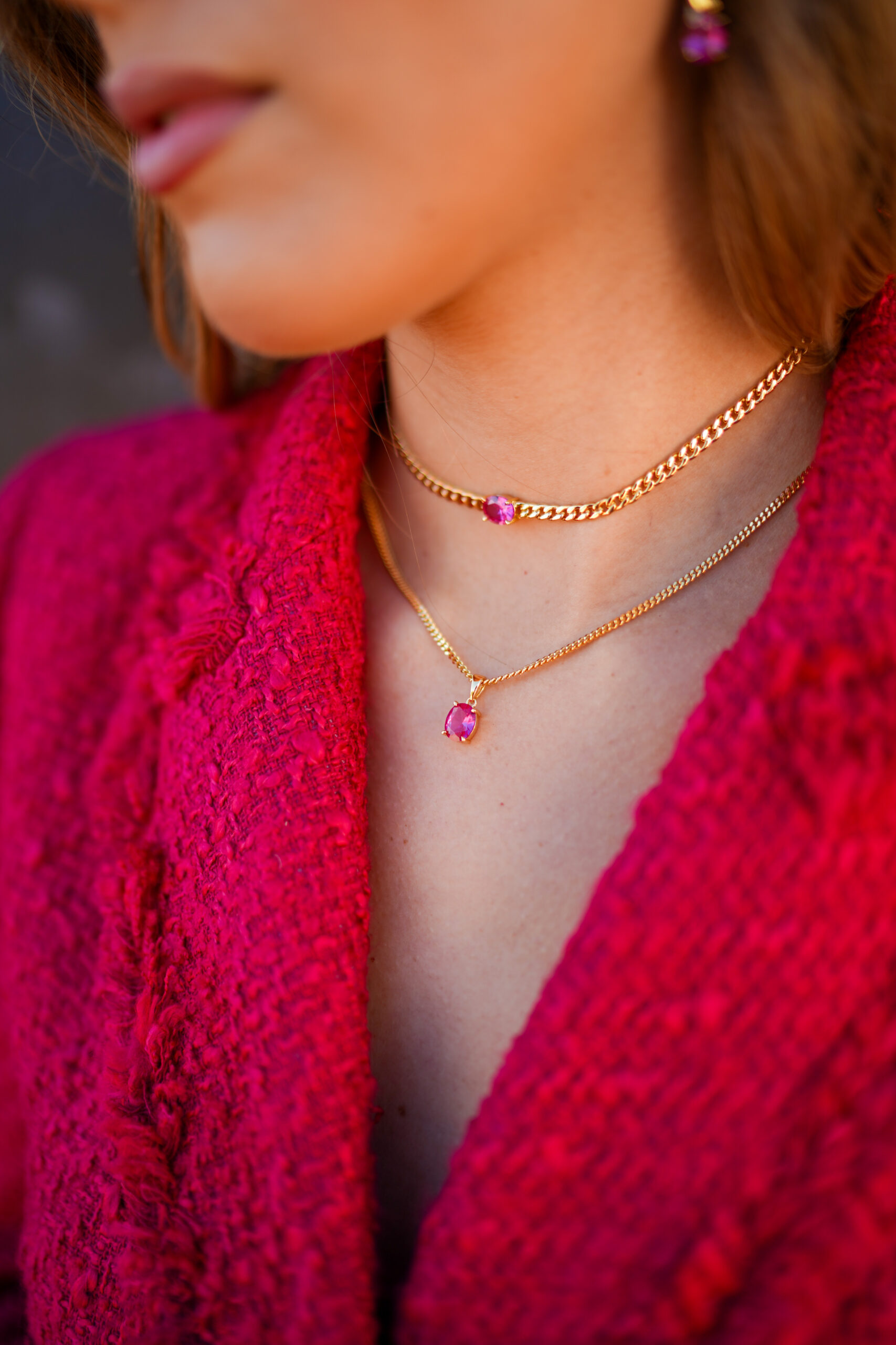 Collar en plata de ley chapado en oro con una piedra colgando de color rosa y cadena de eslabón tipo barbada.
