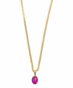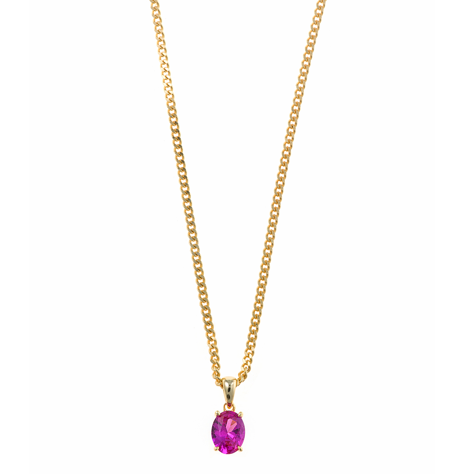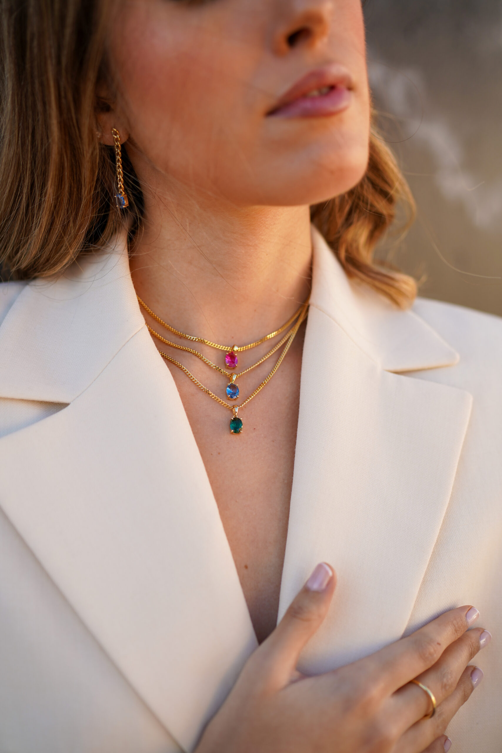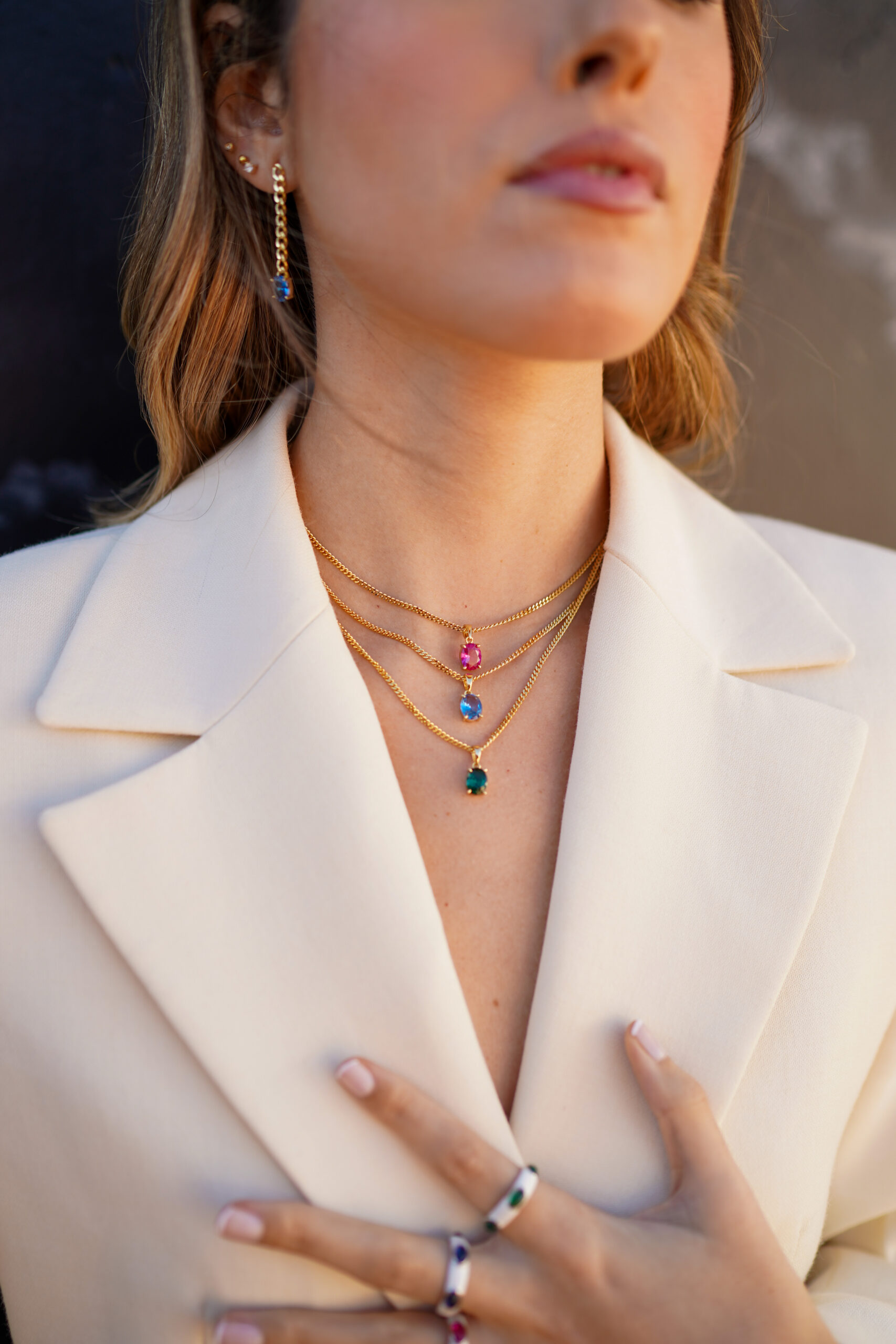 Collar en plata de ley chapado en oro con una piedra colgando de color rosa y cadena de eslabón tipo barbada.