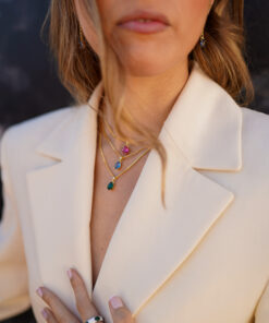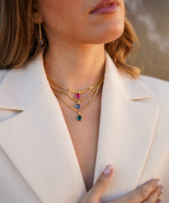 Collar en plata de ley chapado en oro con una piedra colgando de color verde y cadena de eslabón tipo barbada.