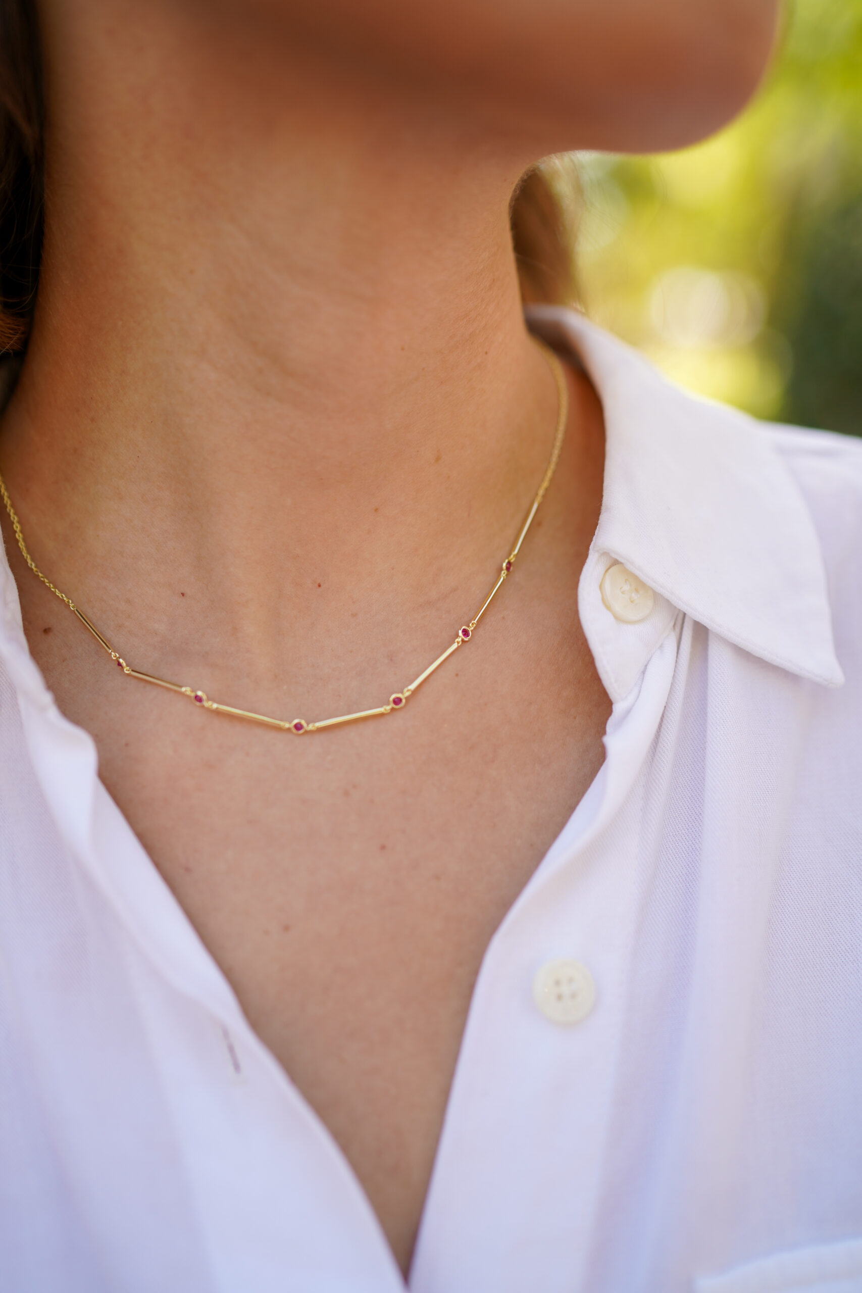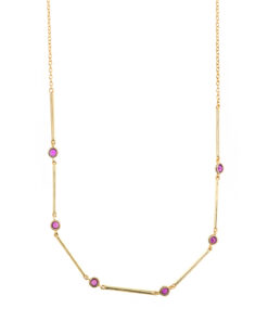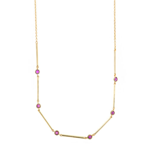 Collar en plata de ley chapado en oro formado por cadena forzada y, en la parte central, por trozos alternos de barras rígidas y circonitas de color verde en forma de chatón.