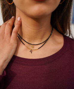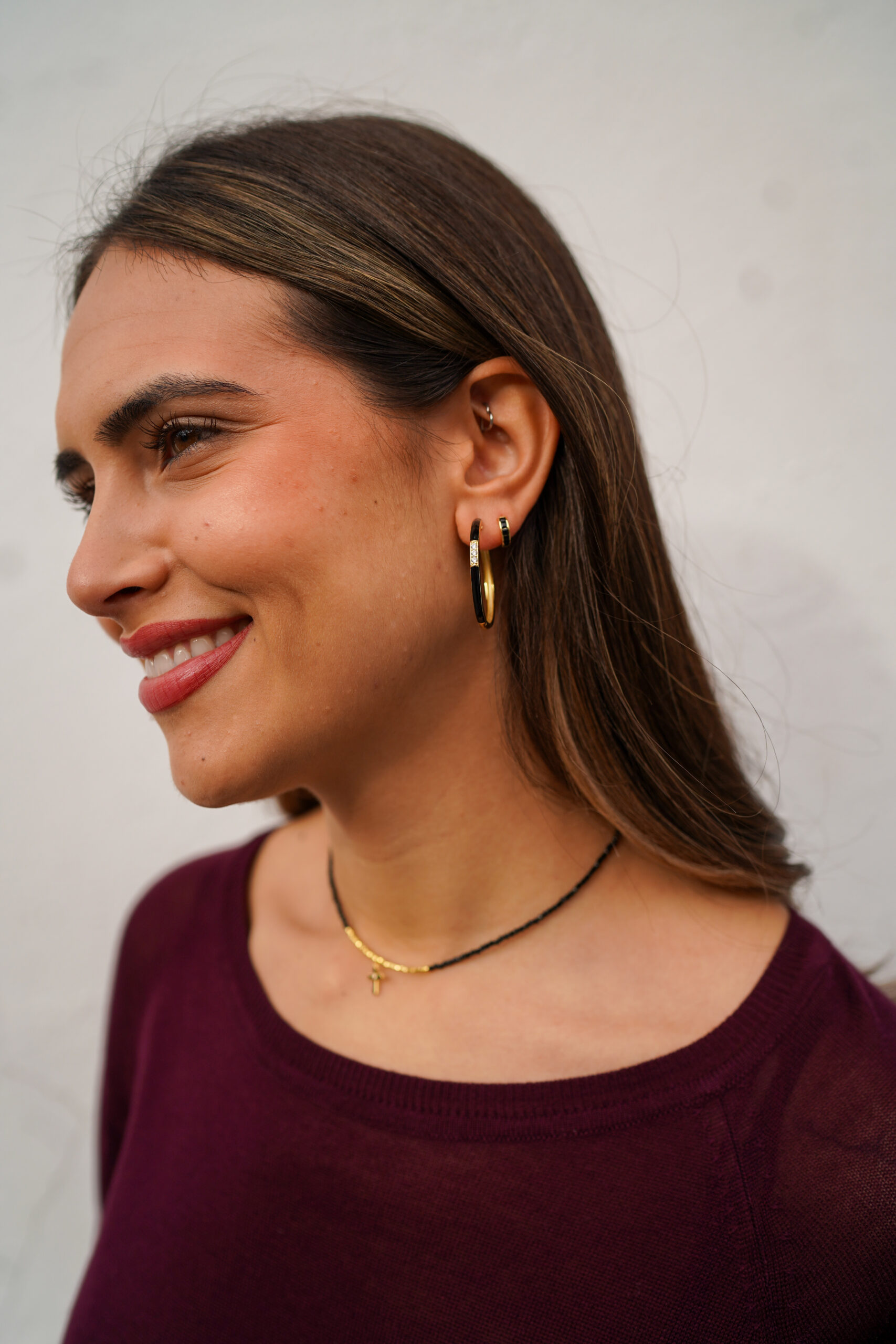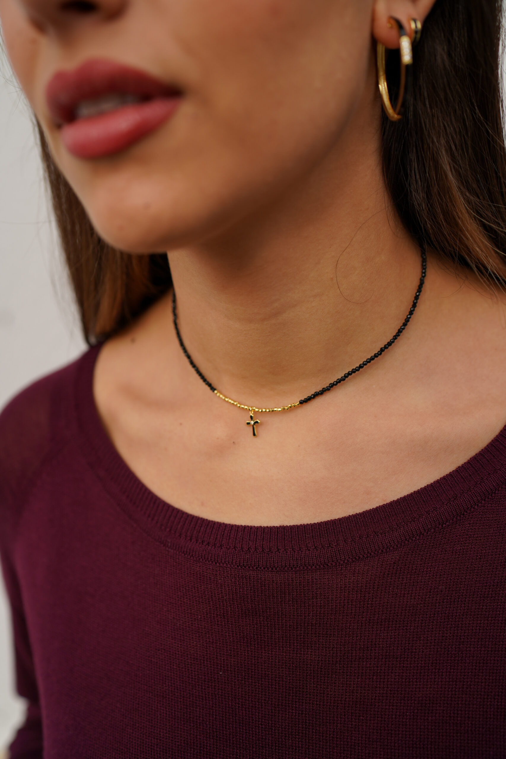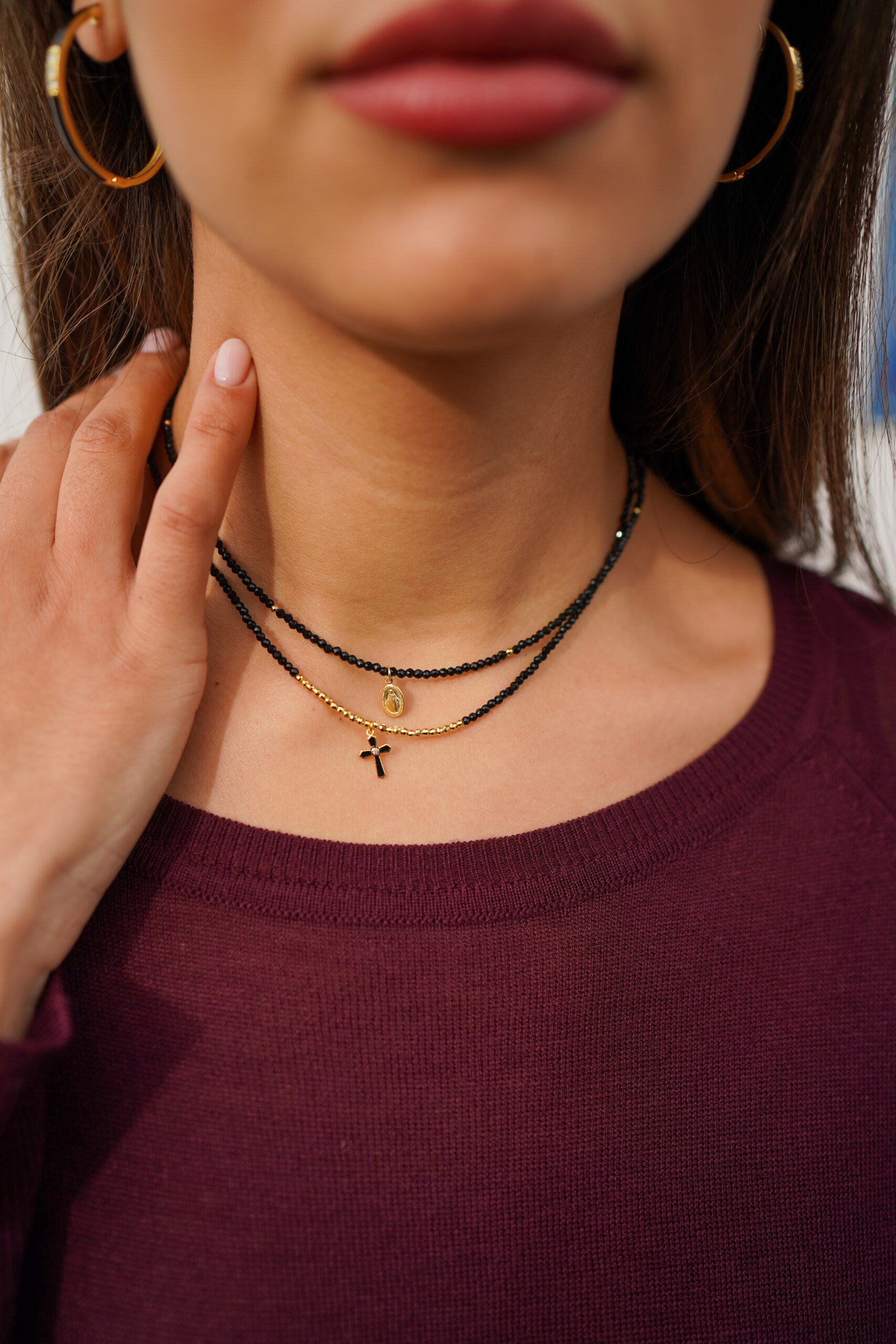 Collar en plata de ley chapado en oro, elaborado con finísimas cuentas negras facetadas que crean un contraste elegante y atemporal. En el centro, una delicada hilera de cuentas doradas aporta luz y estructura, enmarcando una pequeña cruz esmaltada en negro con una circonita central que añade un toque sofisticado y muy versátil.