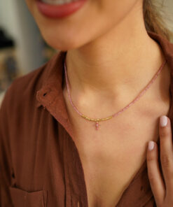 Collar en plata de ley chapado en oro, compuesto por delicadas cuentas facetadas en un precioso tono rosa empolvado que aporta suavidad y un toque luminoso al conjunto. En la parte central, pequeñas cuentas doradas crean un punto de luz que enmarca una cruz esmaltada en rosa con una circonita central, logrando un diseño armonioso, femenino y muy especial.
