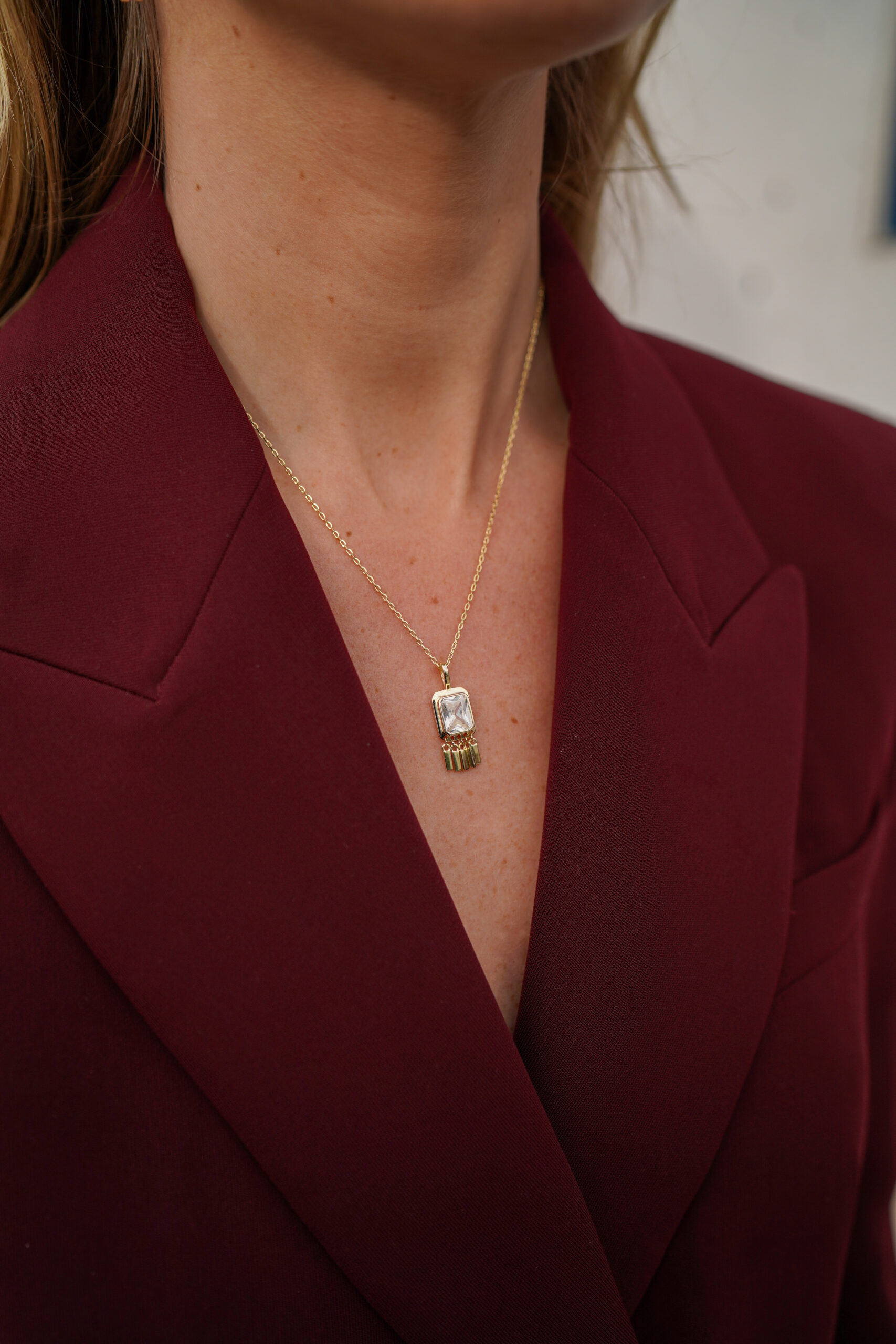 Collar de plata de ley chapado en oro, con colgante rectangular engastado en circonita cúbica de corte brillante. Debajo, cinco pequeñas barras metálicas aportan movimiento y un toque moderno y elegante, creando una pieza luminosa y muy versátil para el día a día o para un look más sofisticado.