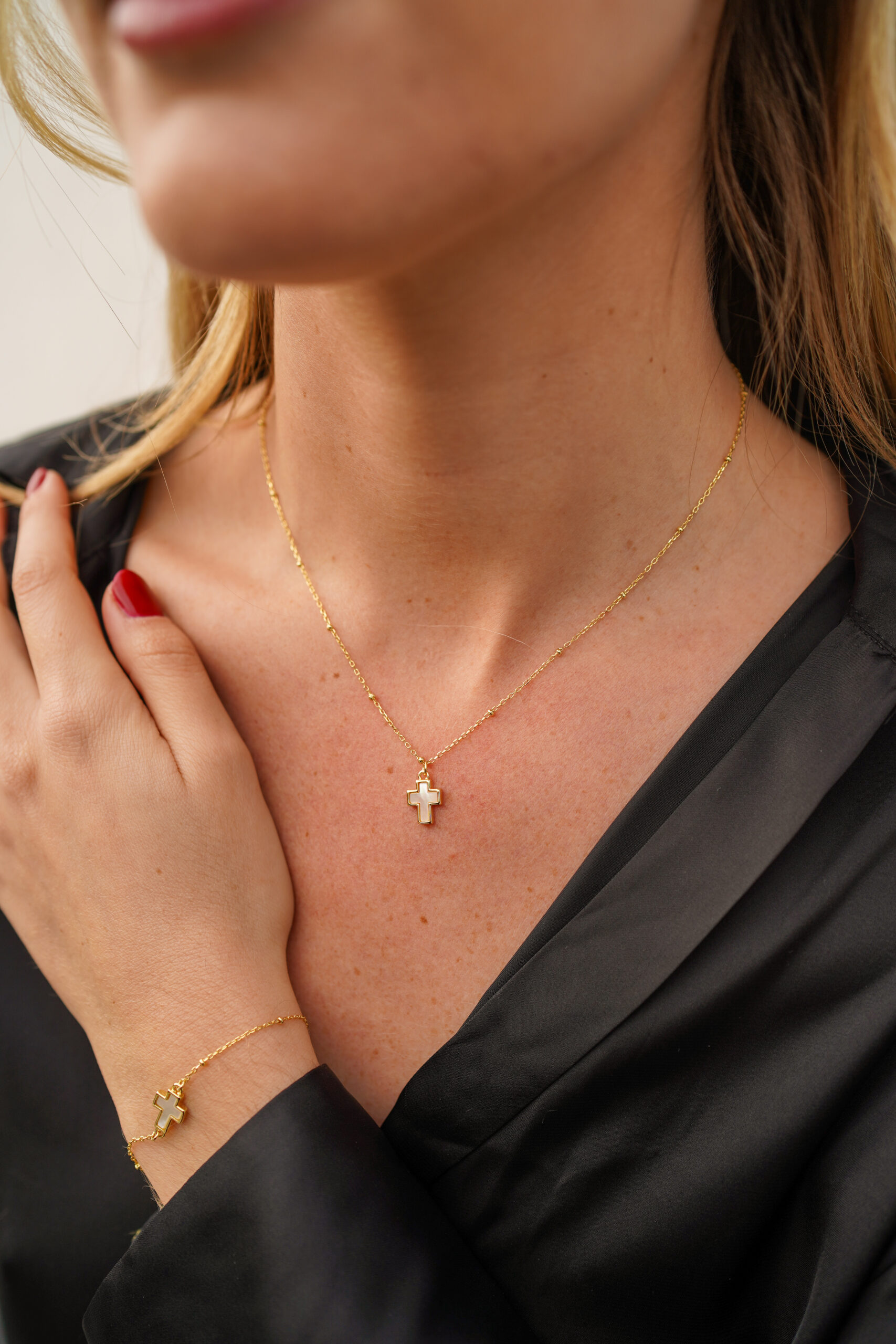 Collar en plata de ley chapado en oro, con cadena fina decorada con pequeñas bolitas doradas y un colgante de cruz en nácar, delicado y luminoso.