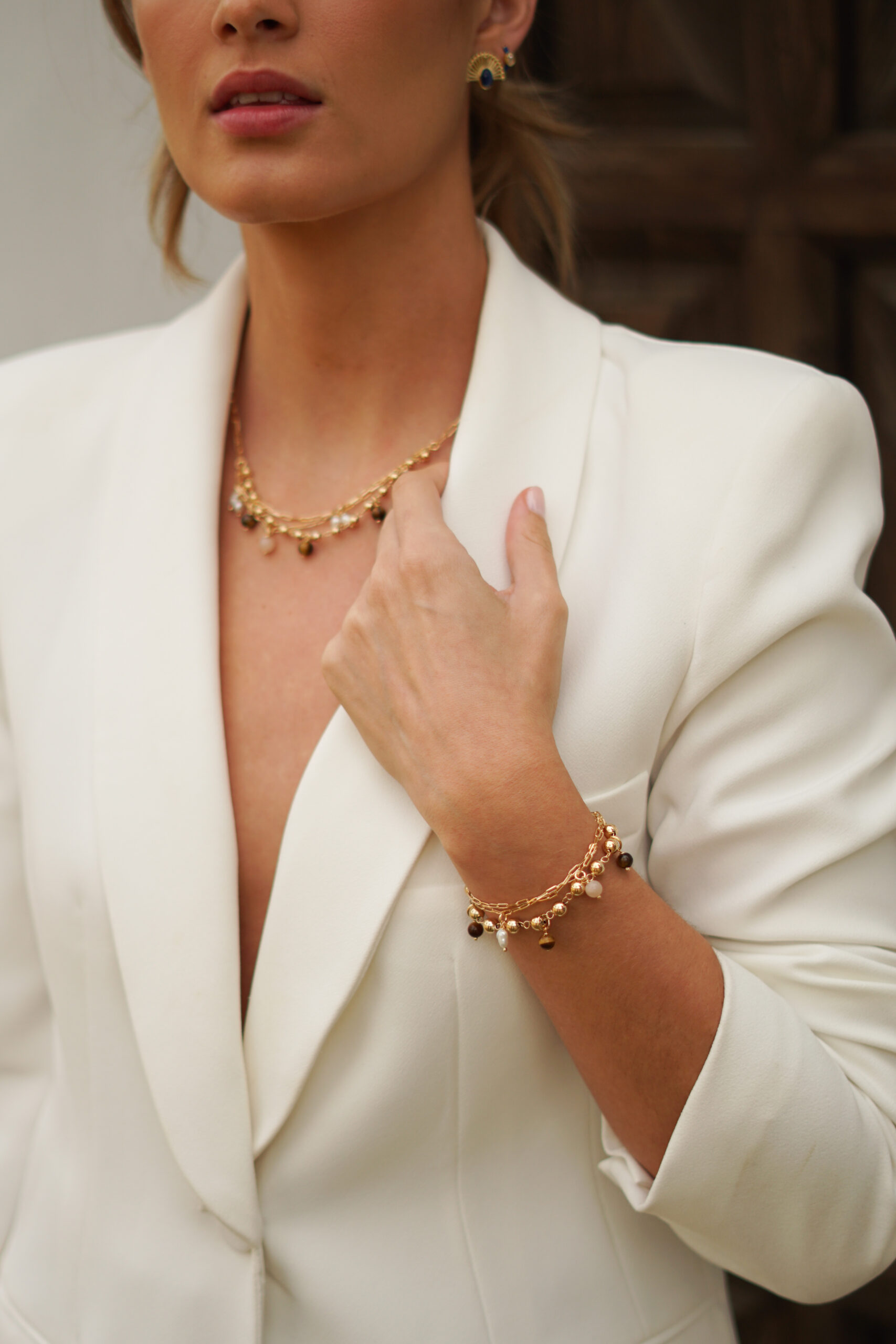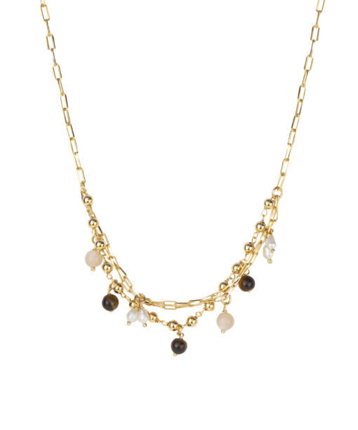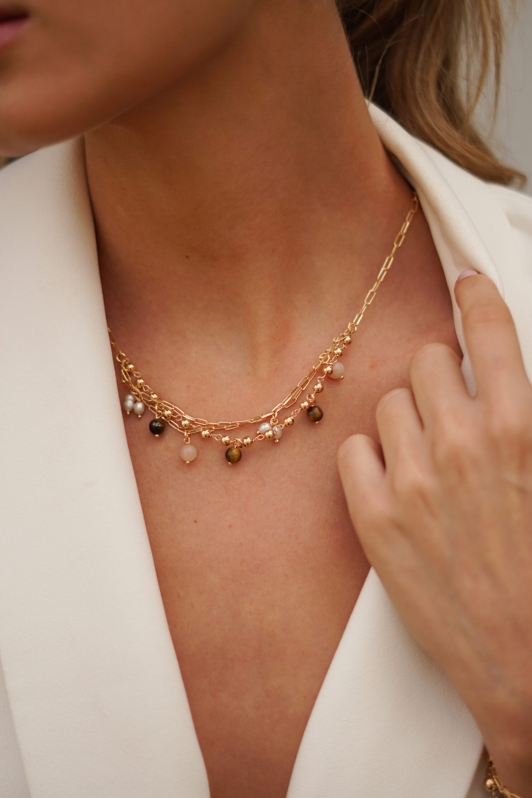 Collar de eslabones en plata de ley chapado en oro con tres vueltas en la parte inferior con distintos tipos de cadenas y piedras de cuarzo, ojo de tigre y perlas cultivadas colgando.