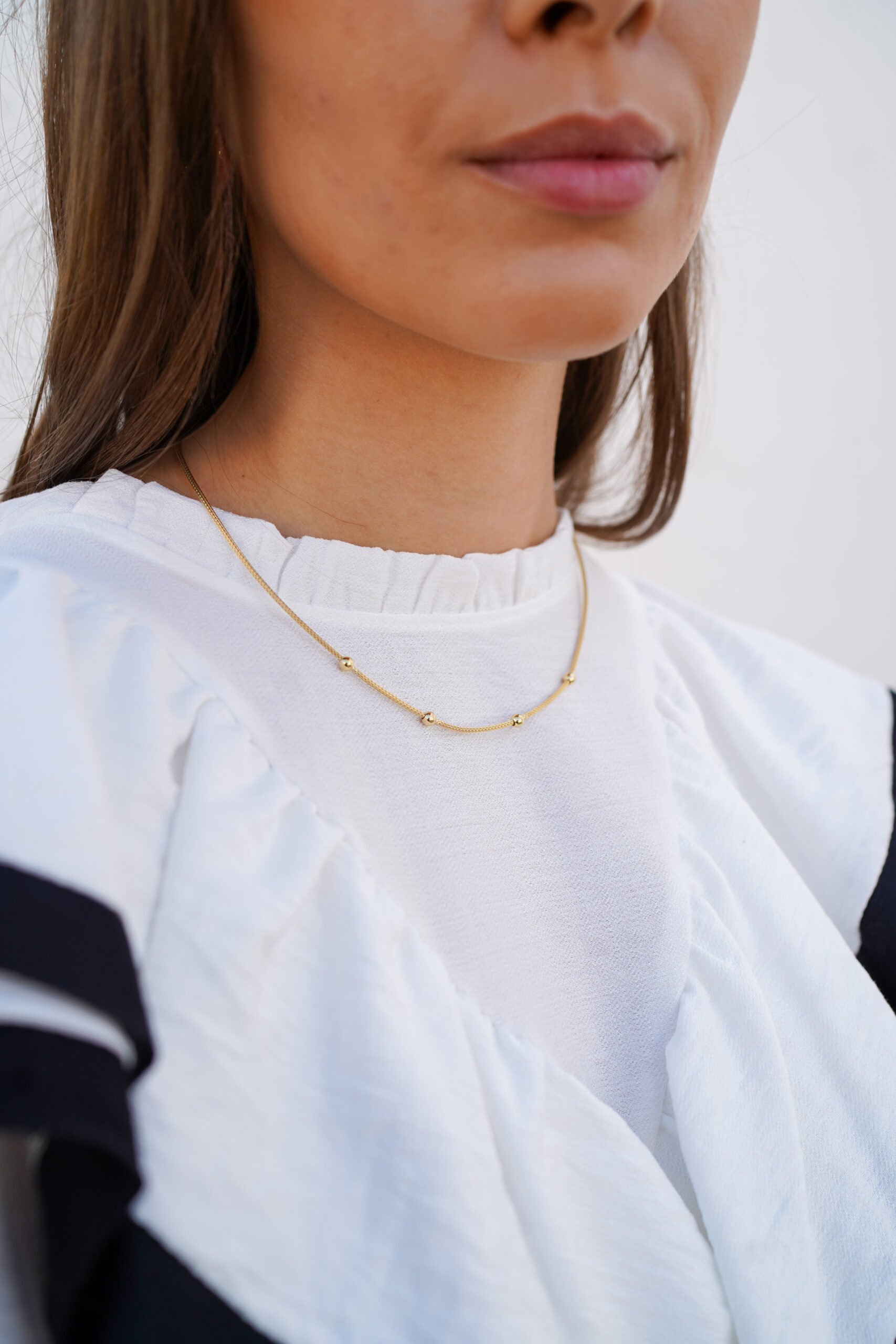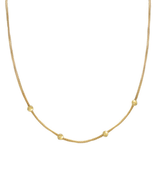 Collar en plata de ley chapado en oro con cuatro bolas pasadas por una cadena tipo malla.