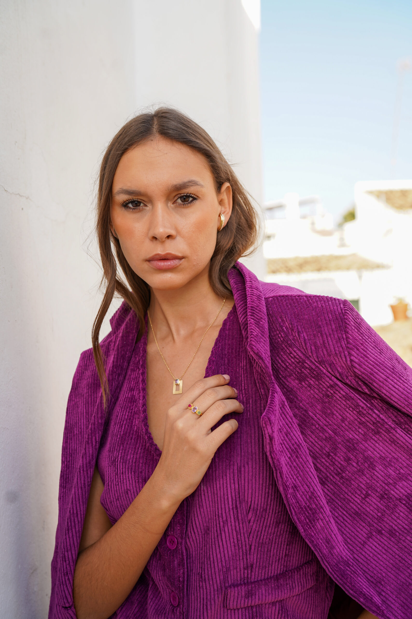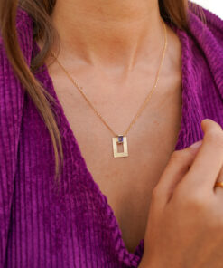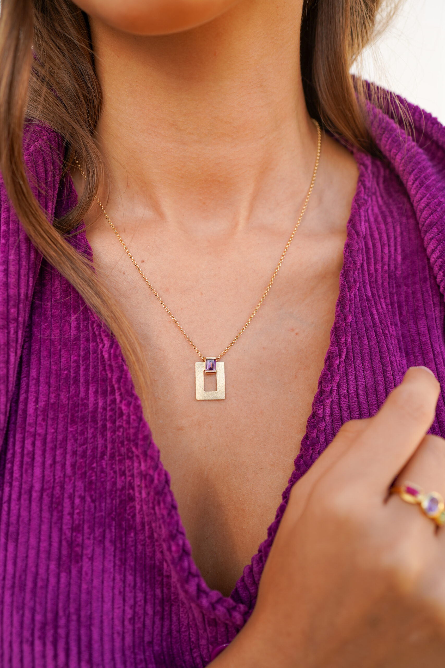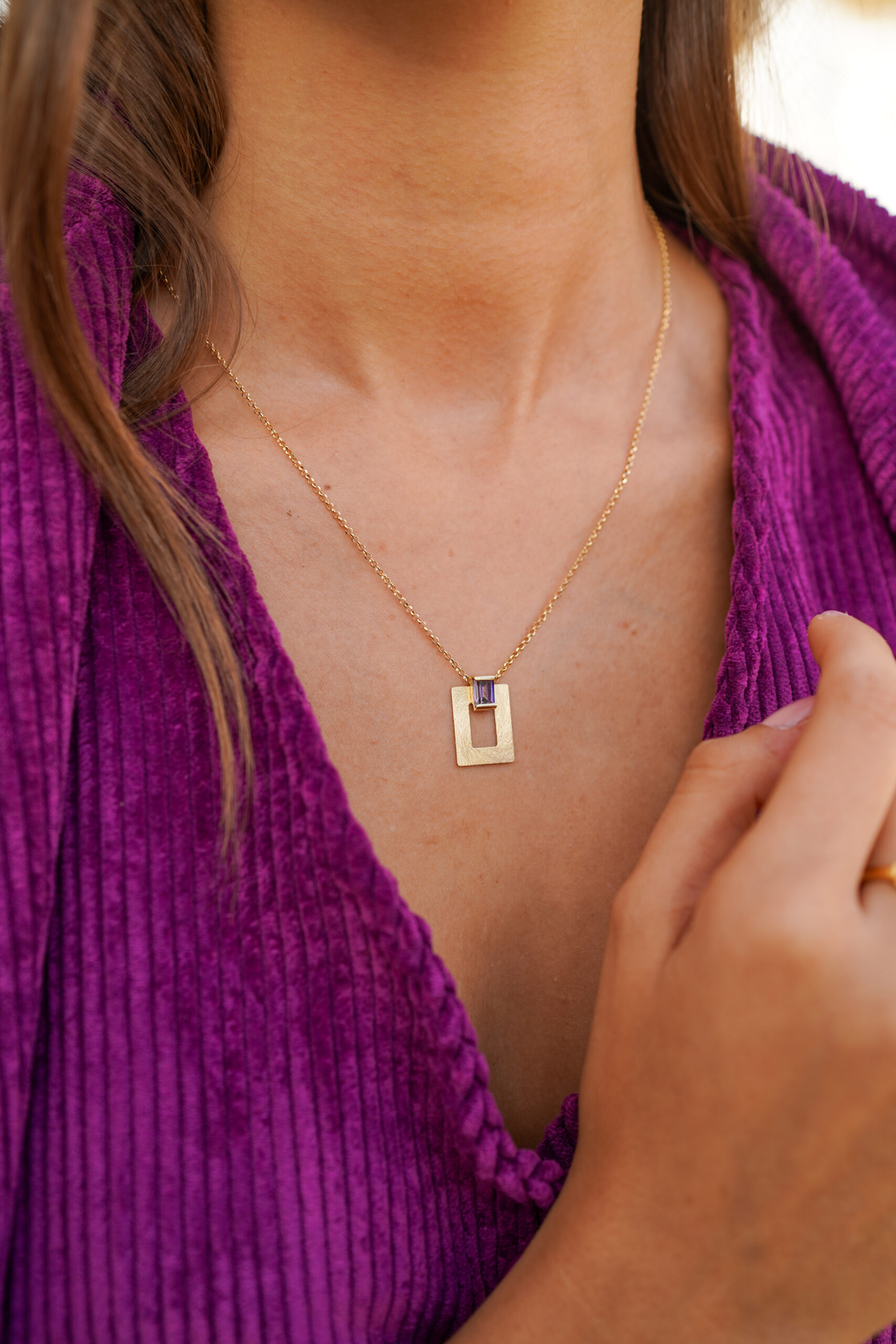 Collar en plata de ley chapado en oro con colgante en forma de rectángulo calado y matizado con una piedra amatista en la parte superior. Unos de nuestros diseños mas elegantes que no deja indiferente a nadie que lo ve.