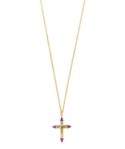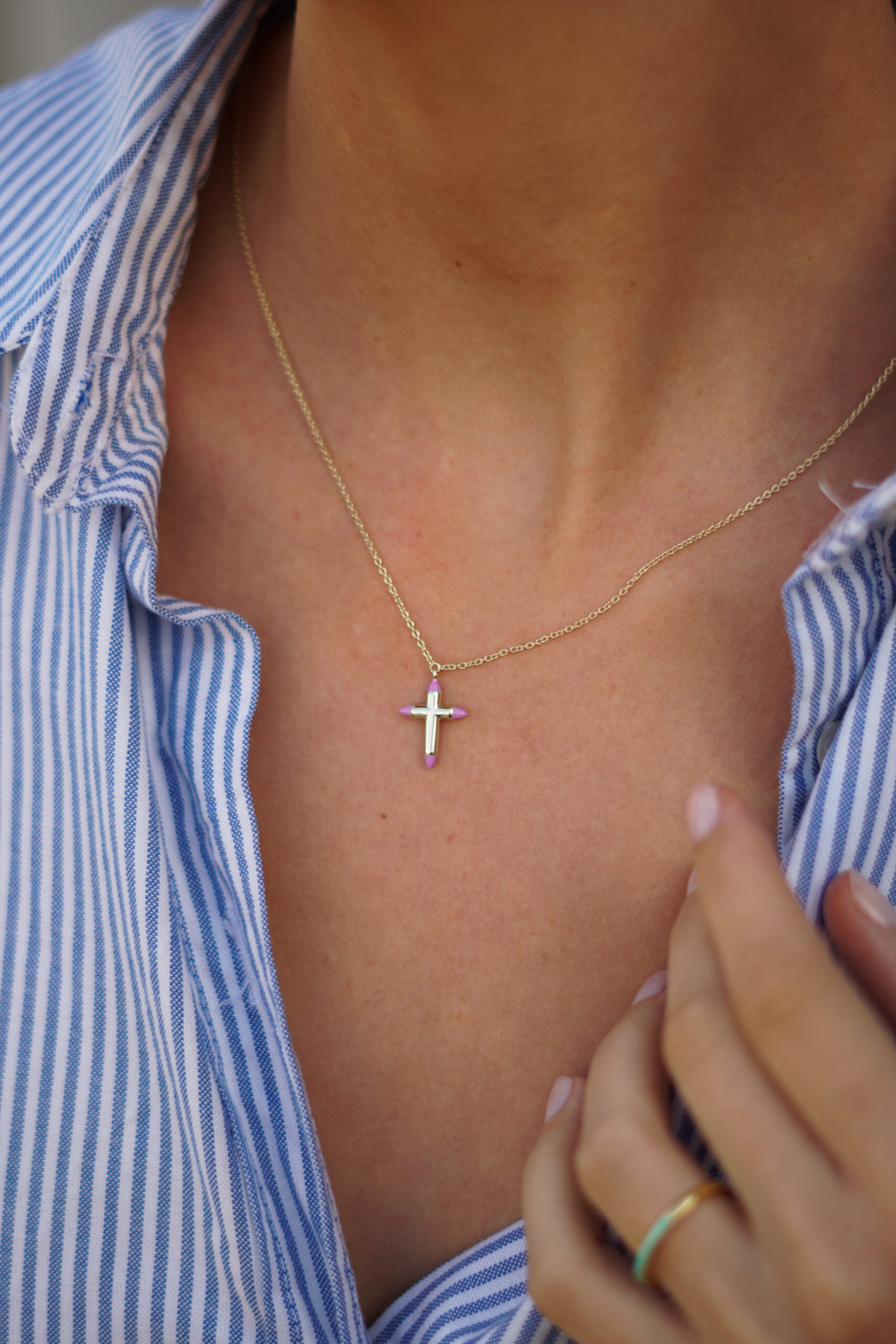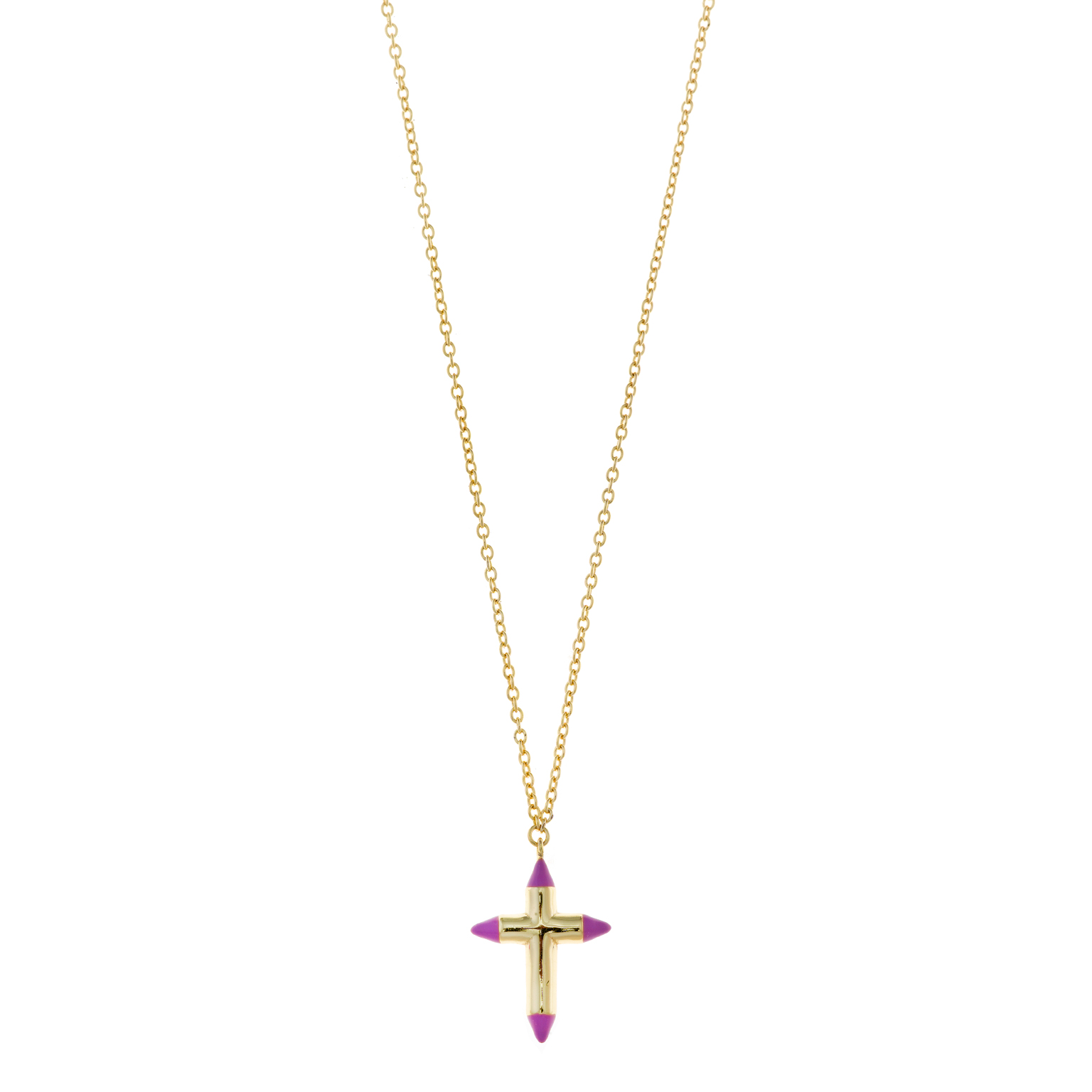 Collar en plata de ley chapado en oro con colgante de cruz con esmalte de color lila.