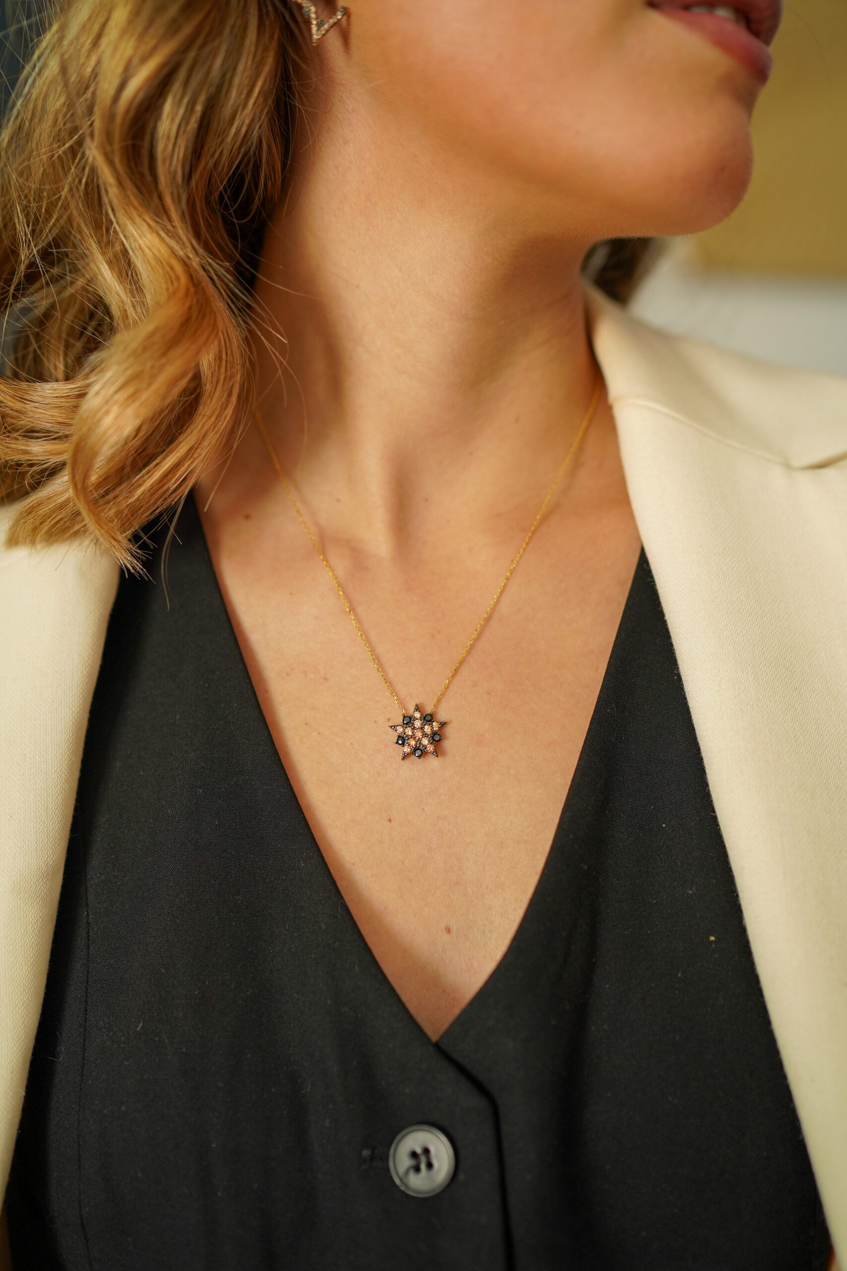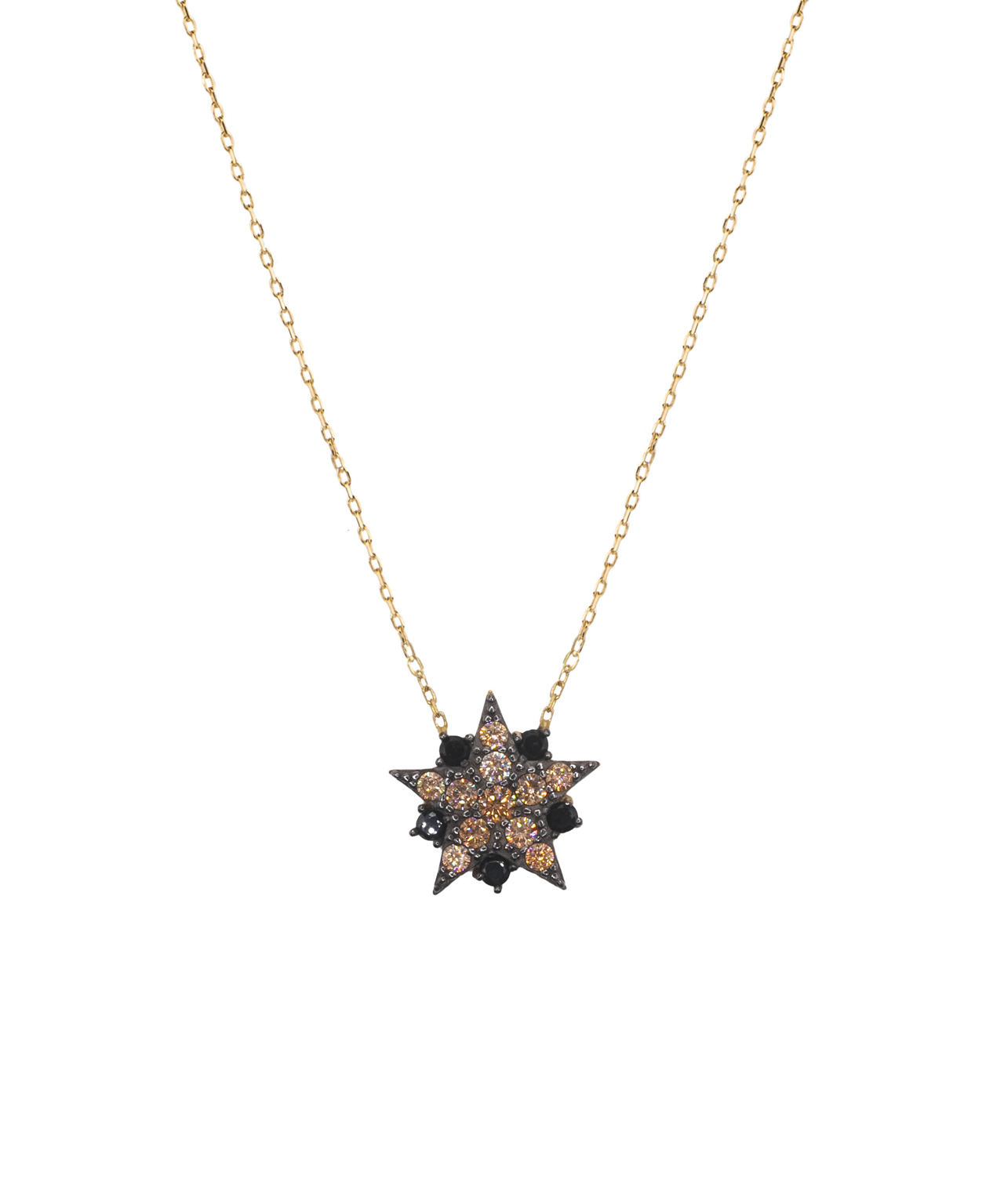 Collar en plata de ley chapado en oro con colgante de forma de estrella con circonitas negras y champagne.
