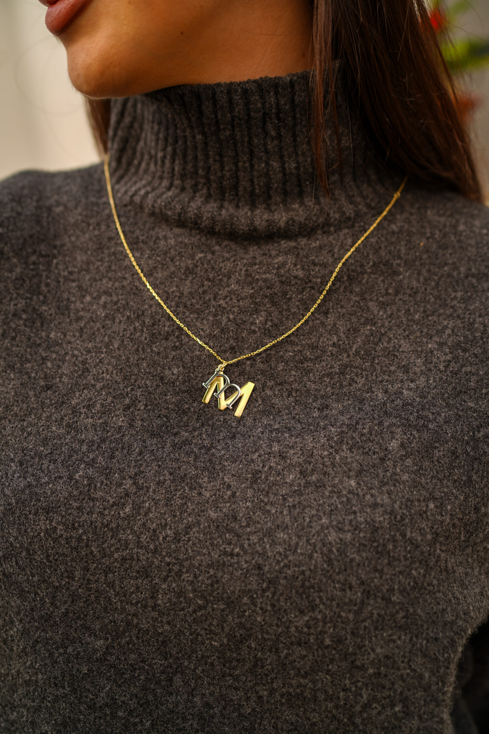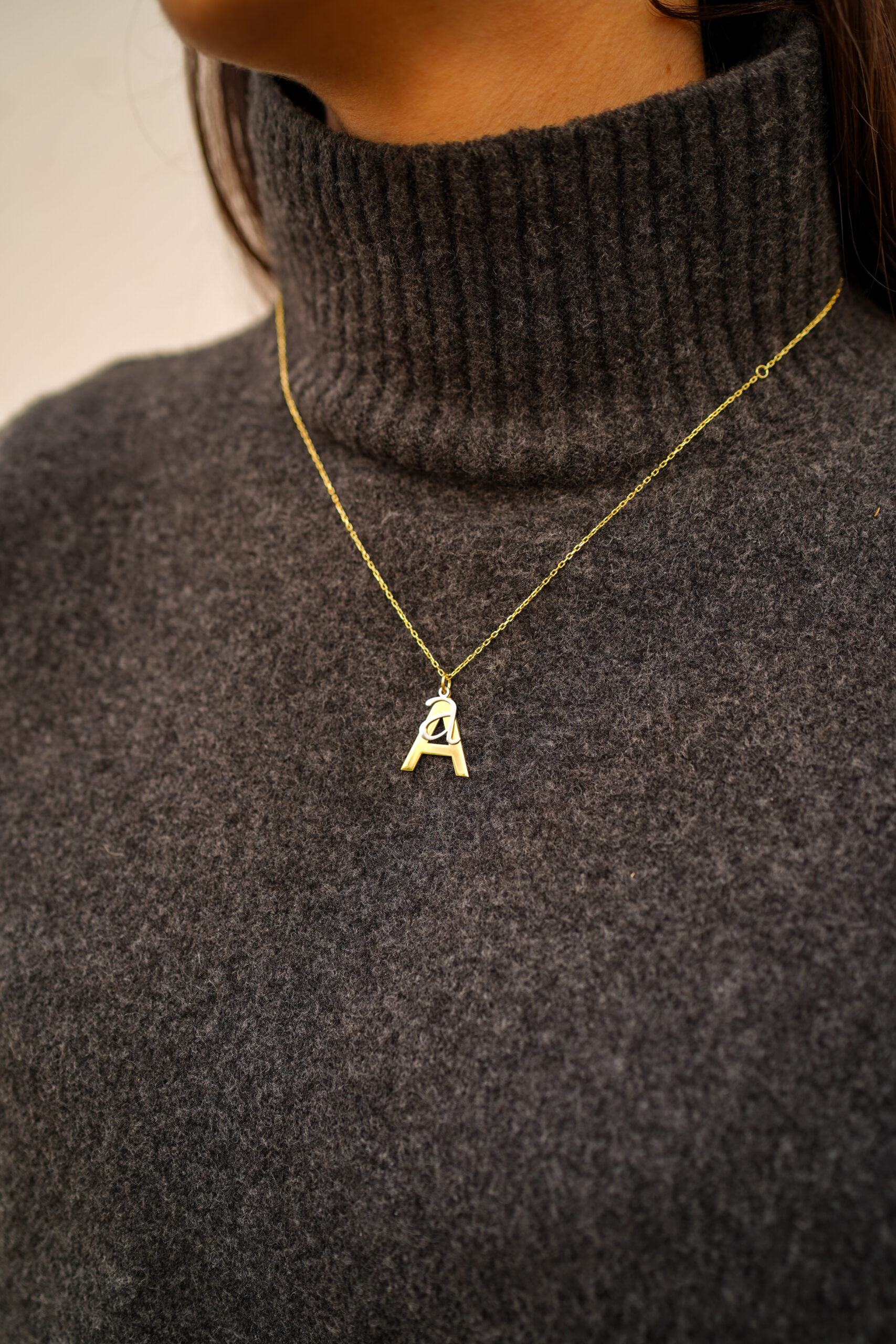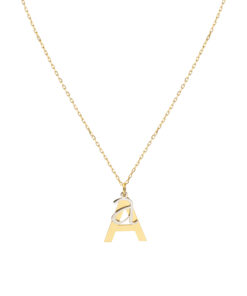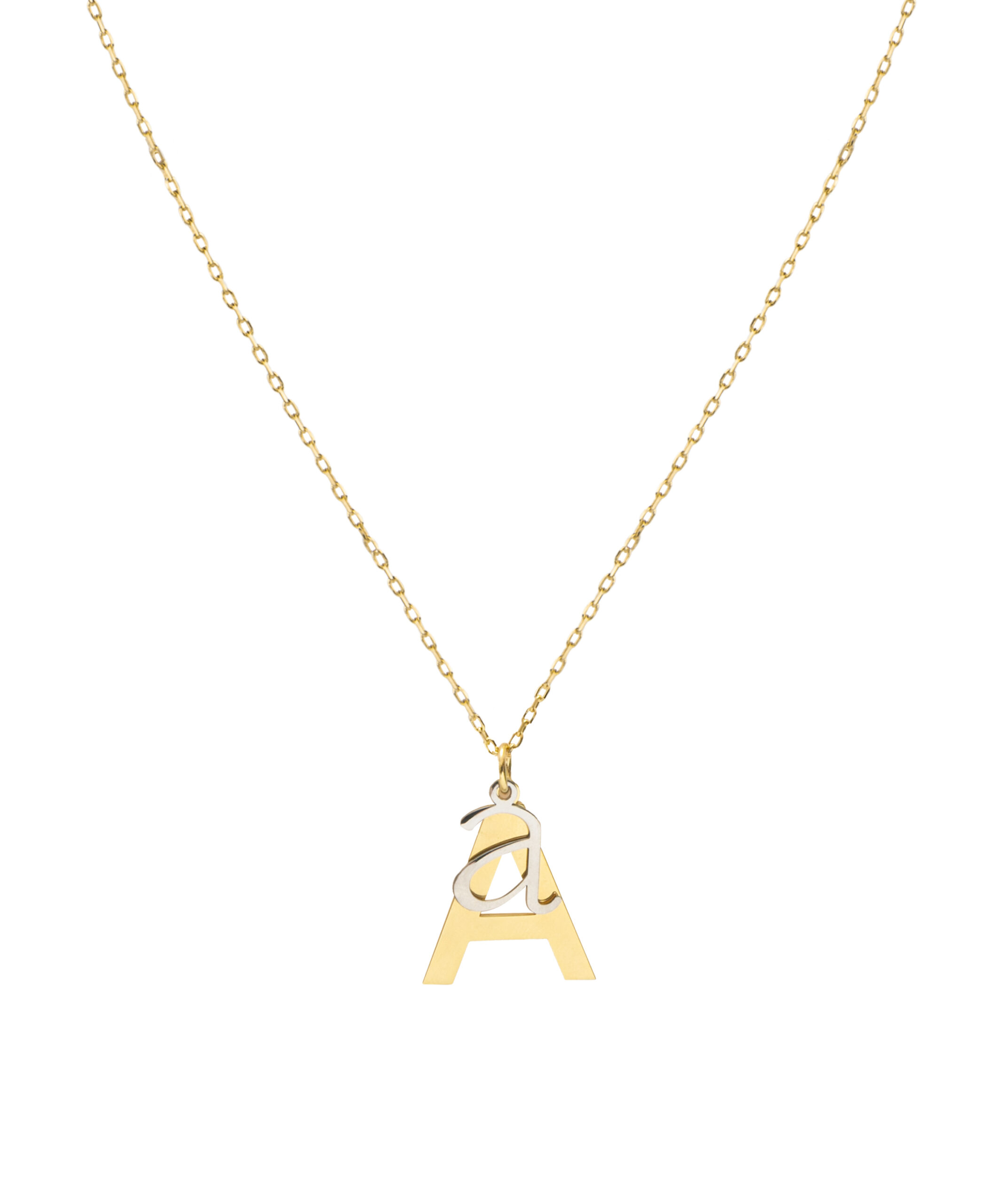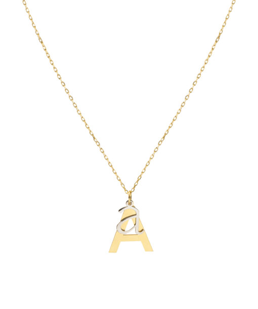 Collar en plata de ley chapado en oro con dos iniciales colgando. En este elegante diseño apreciamos una inicial mayúscula mayor, en plata chapada en oro y otra minúscula más pequeña en plata en su color. Esta combinación hace de este collar una muestra de originalidad y belleza.