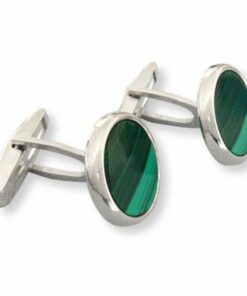 Gemelos en plata de ley de forma circular con piedra natural de malaquita.