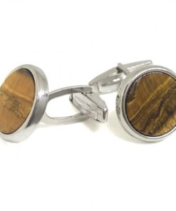 Gemelos en plata de ley de forma circular con piedra natural de ojo de tigre.