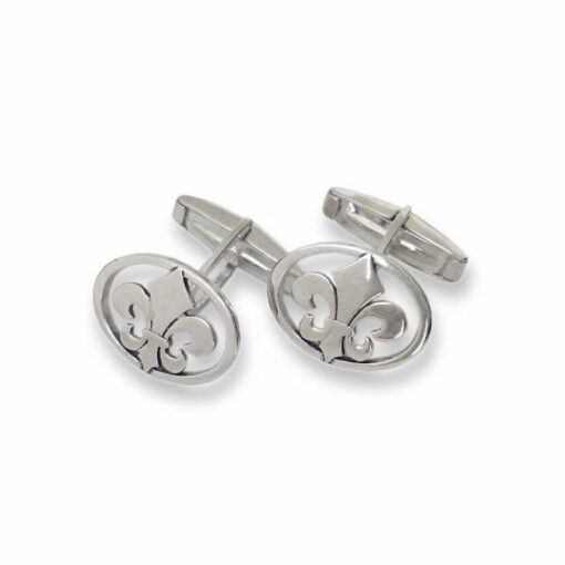 Gemelos en plata de ley con forma de flor de lis sobre filo oval.