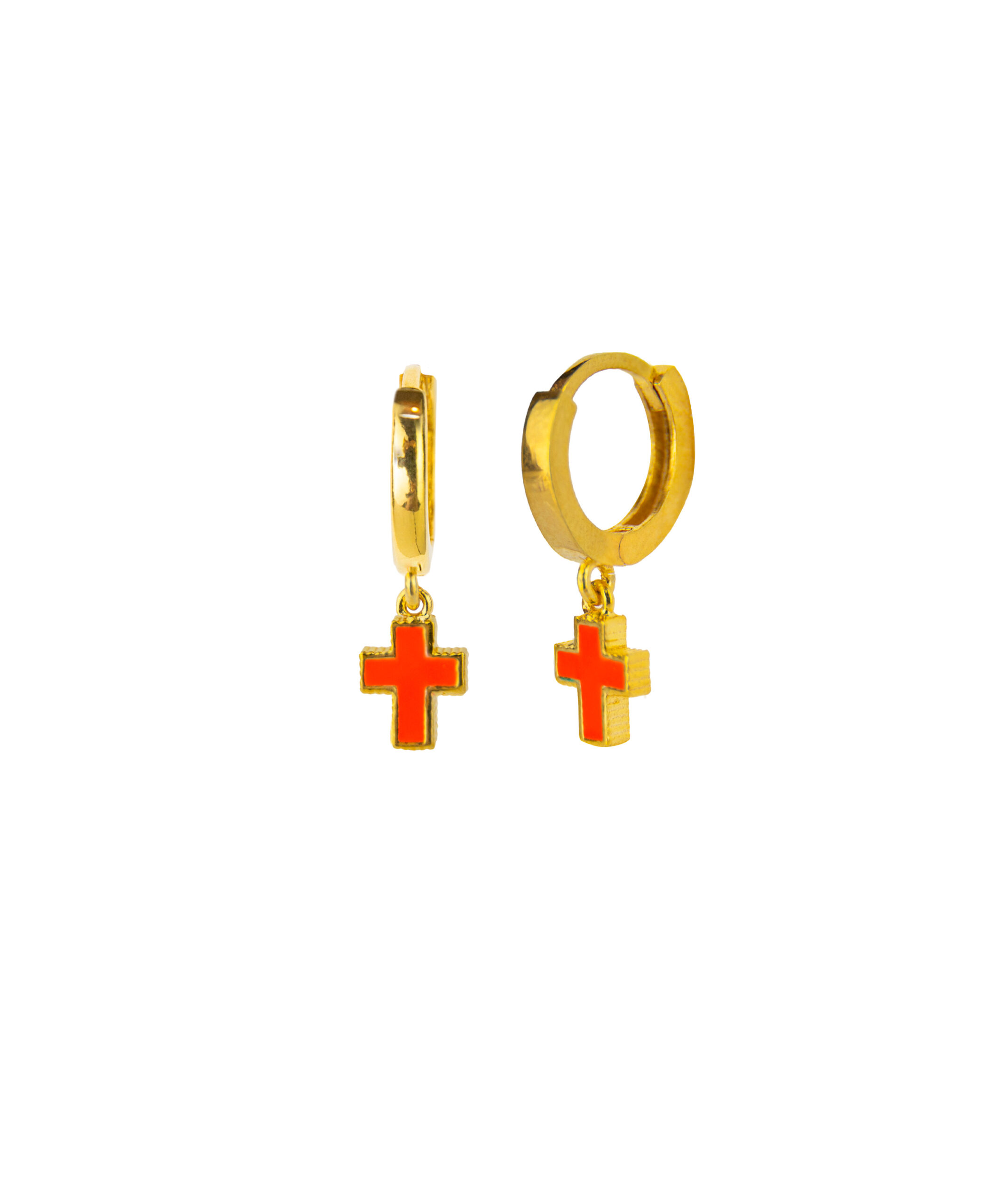 Pendiente aro en plata de ley chapado en oro con colgante en forma de cruz con esmalte naranja flúor.