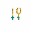 Pendiente aro en plata de ley chapado en oro con colgante en forma de cruz con esmalte verde flúor.