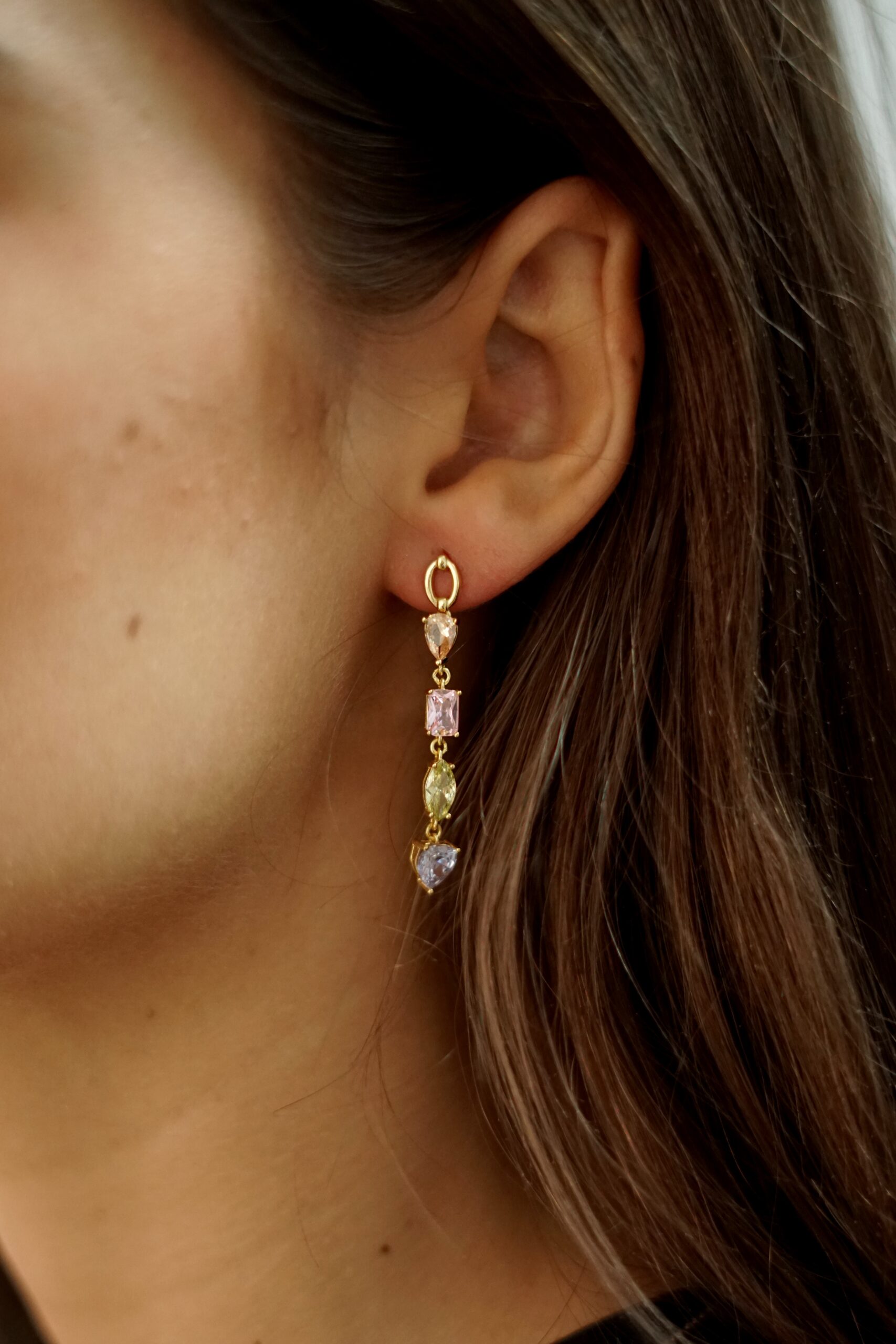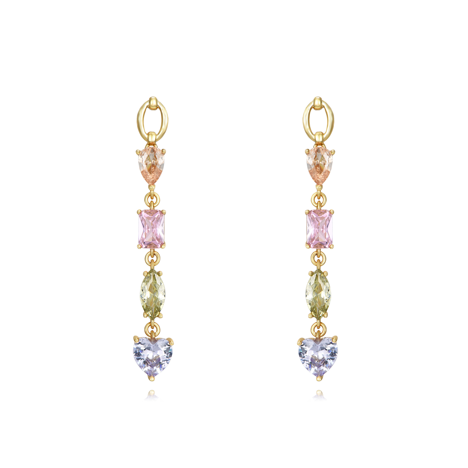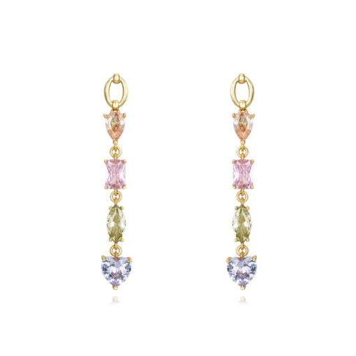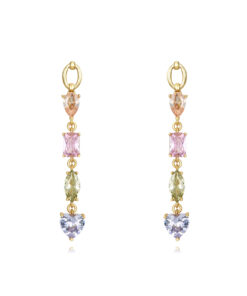 Pendientes en plata de ley chapados en oro con colgantes de circonitas de colores de distintas formas.