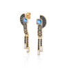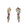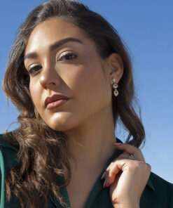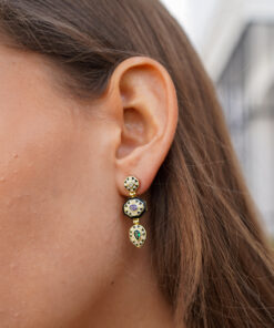 Pendientes colgantes, en plata de ley chapada en oro, con un diseño exclusivo y majestuoso. La estructura está compuesta por formas geométricas ornamentadas, realzadas con detalles en esmalte negro y un delicado engaste de circonitas. Cada pendiente cuenta con una gema central en tono púrpura ovalado y una piedra en forma de lágrima de tono verde, creando un contraste vibrante y sofisticado. Esta pieza, rica en detalles y simbolismo, es ideal para ocasiones especiales o eventos en los que se busca destacar.