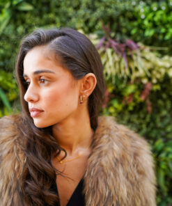 Pendientes aros en plata de ley chapados en oro con piedras de cuarzo rubí colgando.