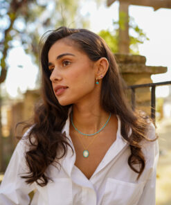 Pendientes aros en plata de ley chapados en oro con piedras de turquesa natural colgando.