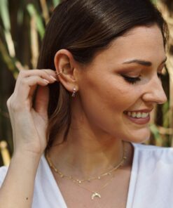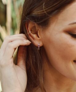 Pendientes aros en plata de ley chapado en oro con seis circonitas baquette color lila