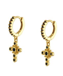 Pendientes aros en plata de ley chapados en oro con colgante en forma de cruz y seis circonitas negras