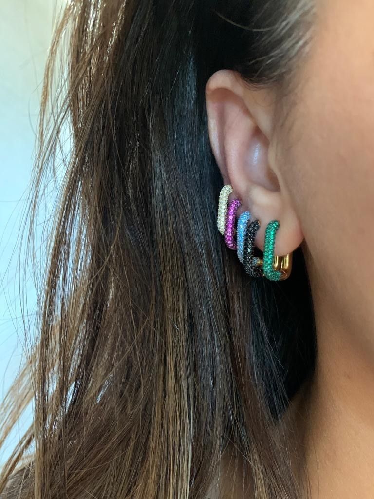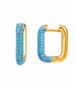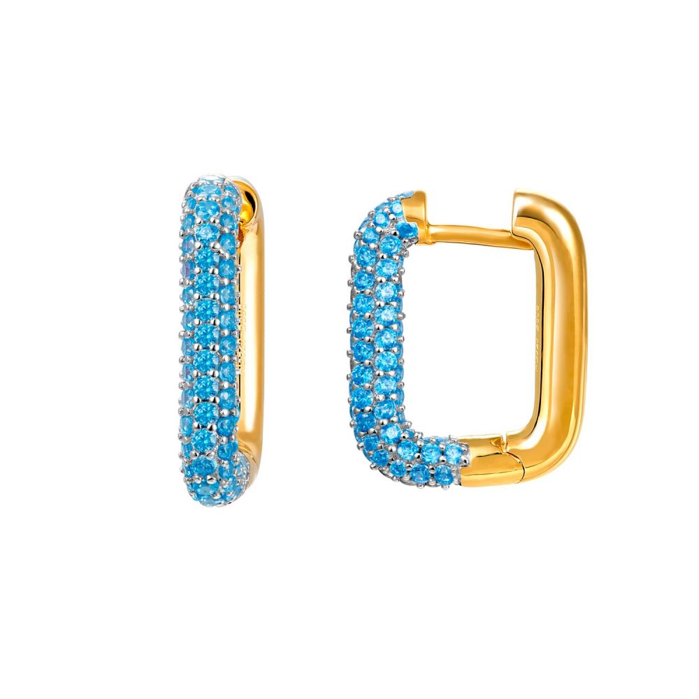 Pendientes aros en plata de ley chapados en oro de forma rectangular con circonitas celestes
