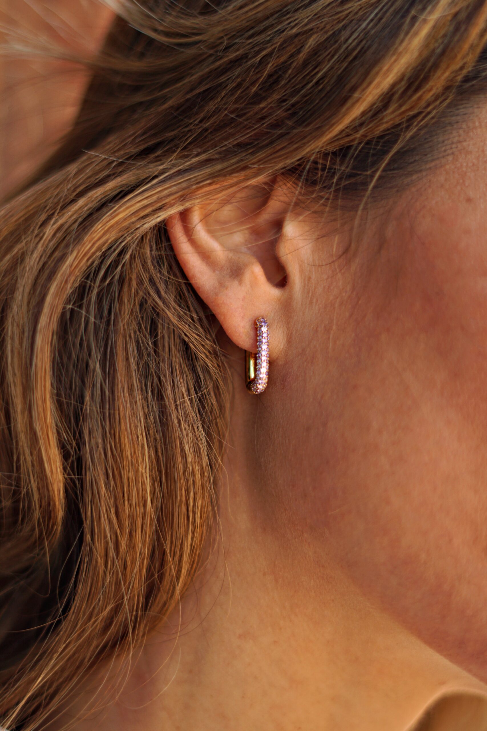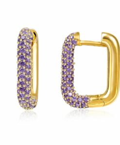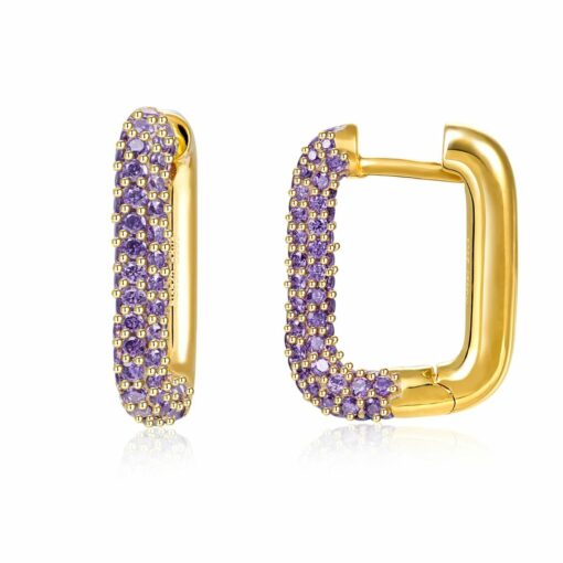 Pendientes aros en plata de ley chapados en oro de forma rectangular con circonitas lila