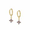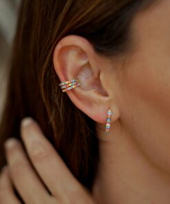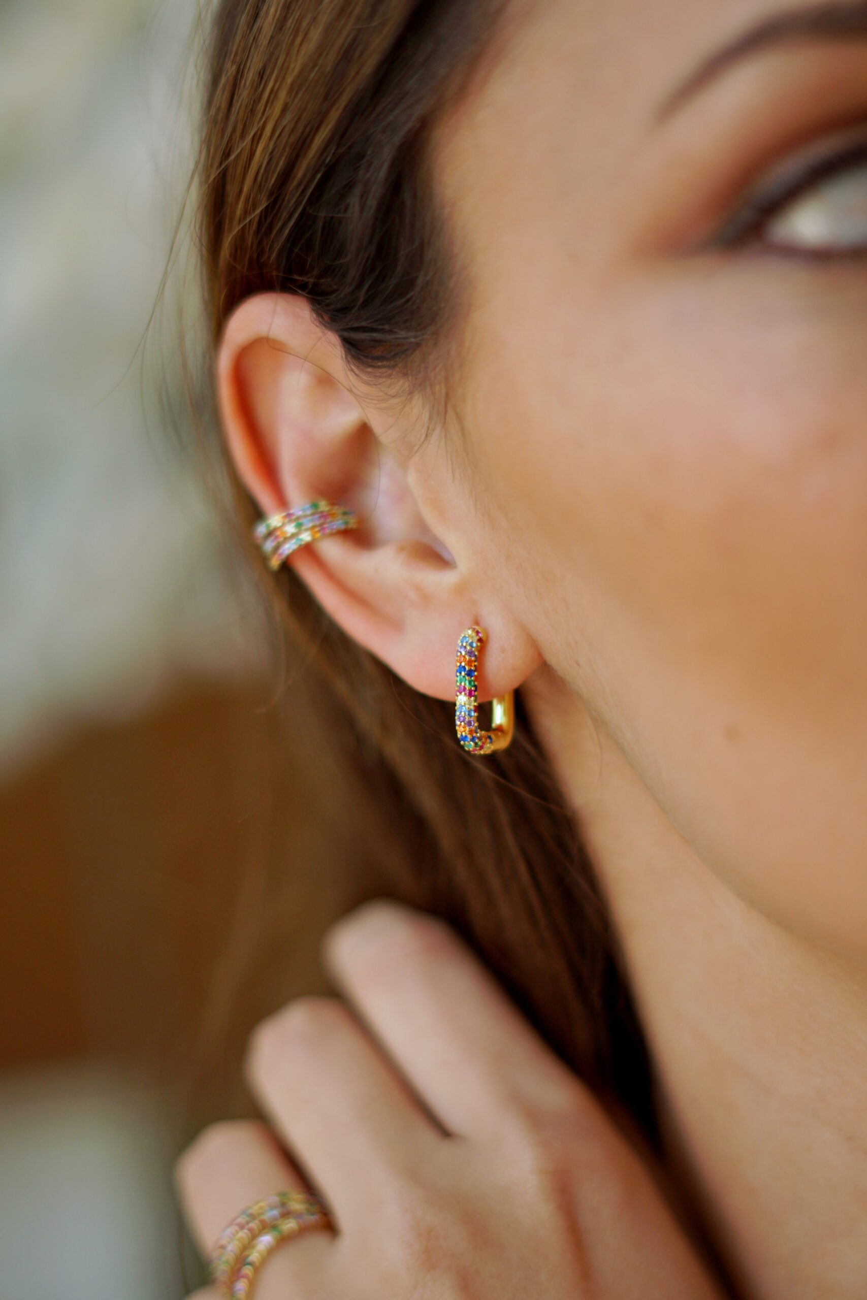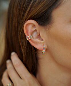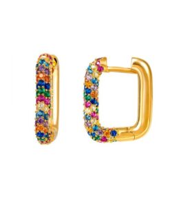 Pendientes aros en plata de ley chapados en oro de forma rectangular con circonitas de colores