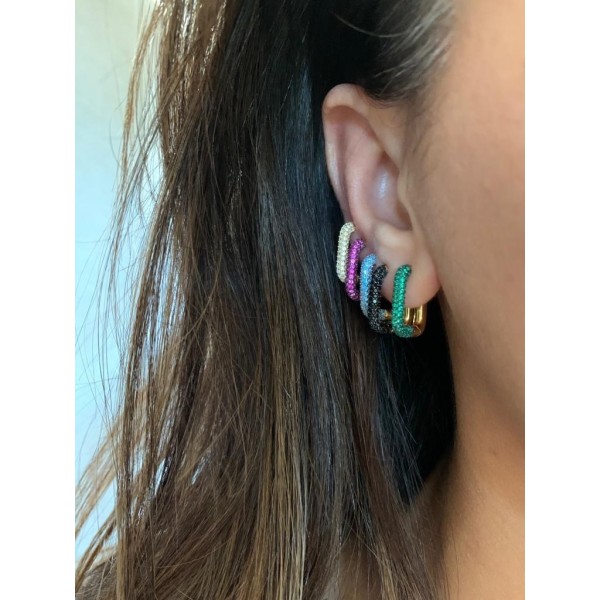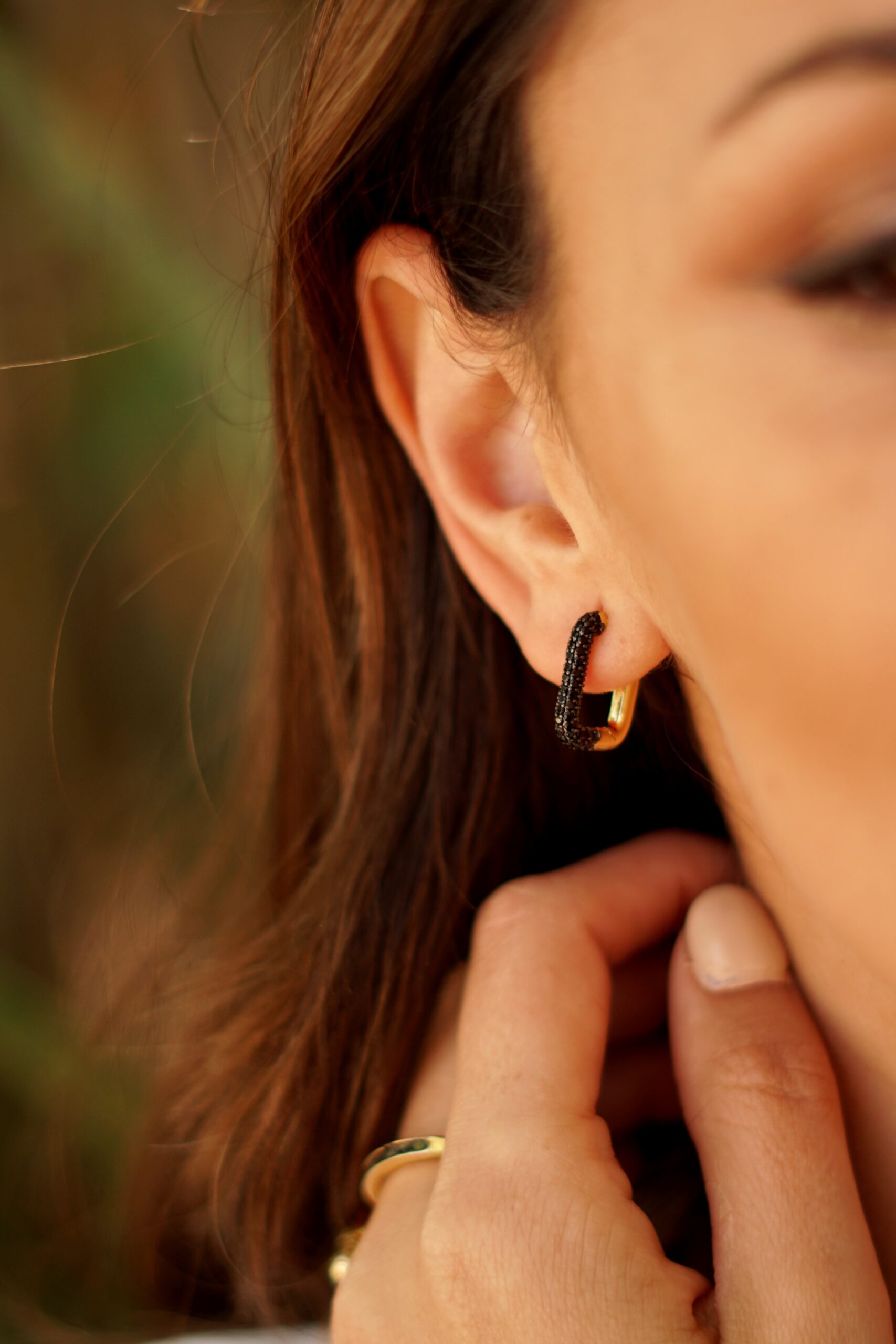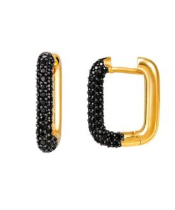 Pendientes aros en plata de ley chapados en oro de forma rectangular con circonitas negras