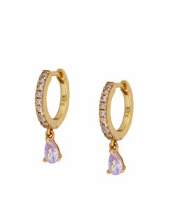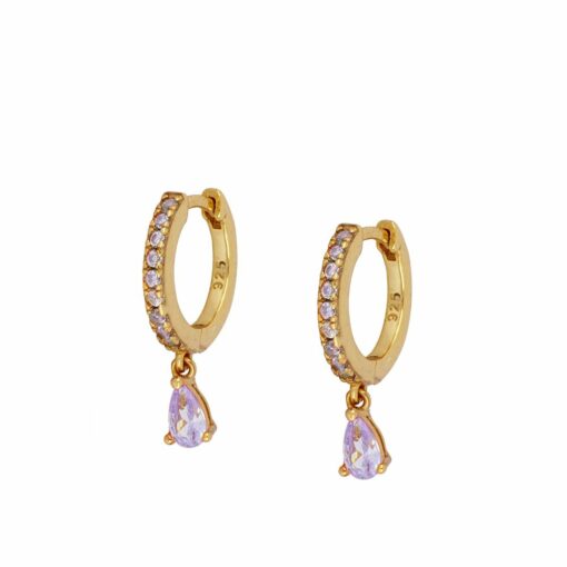 Pendientes aros de circonitas en plata de ley chapados en oro con circonita lila colgando