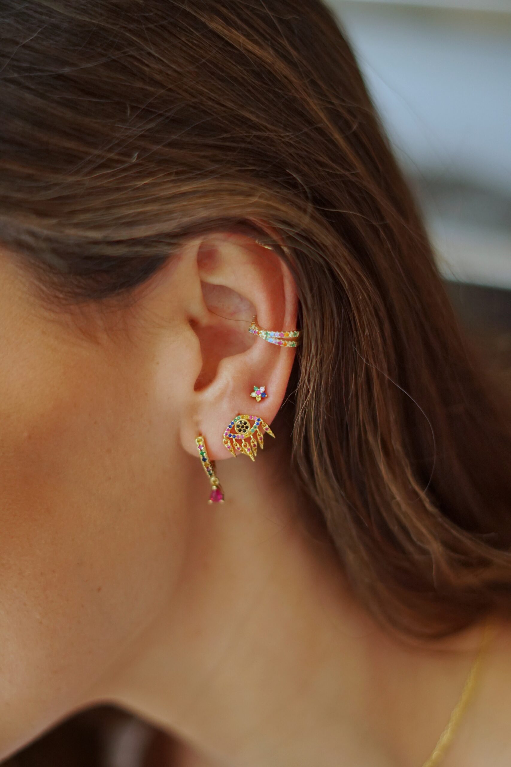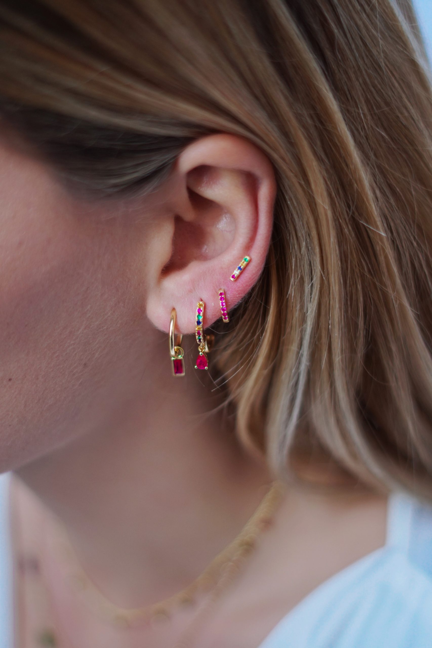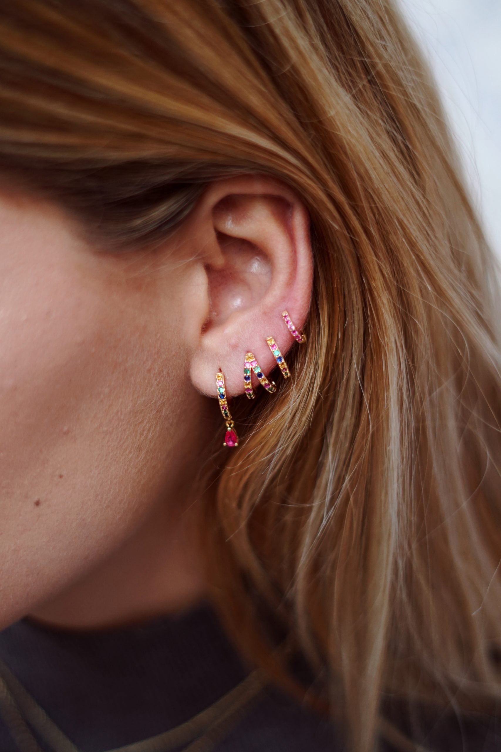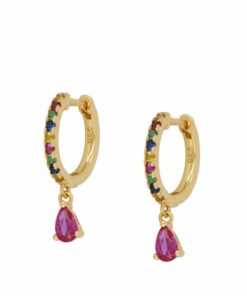Pendientes aros de circonitas multicolor en plata de ley chapados en oro con piedra rosa colgando