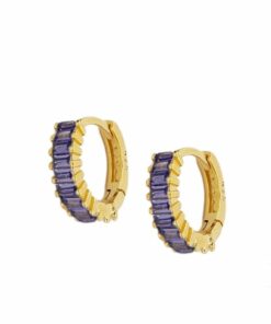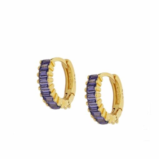 Pendientes aros en plata de ley chapado en oro con once circonitas baguette lilas